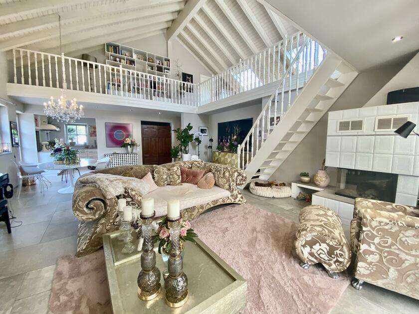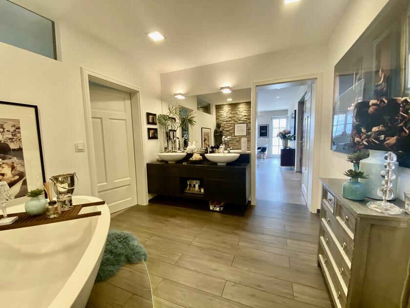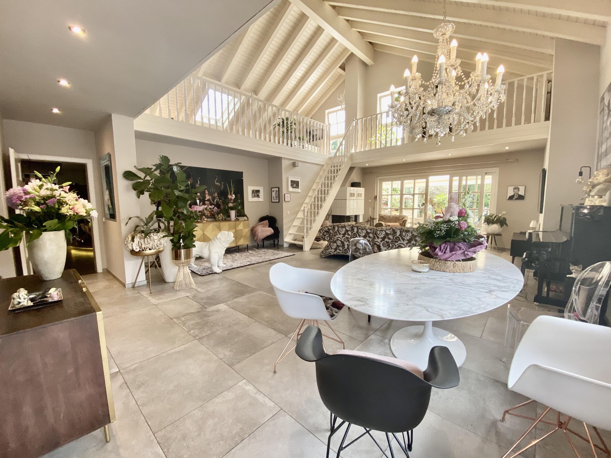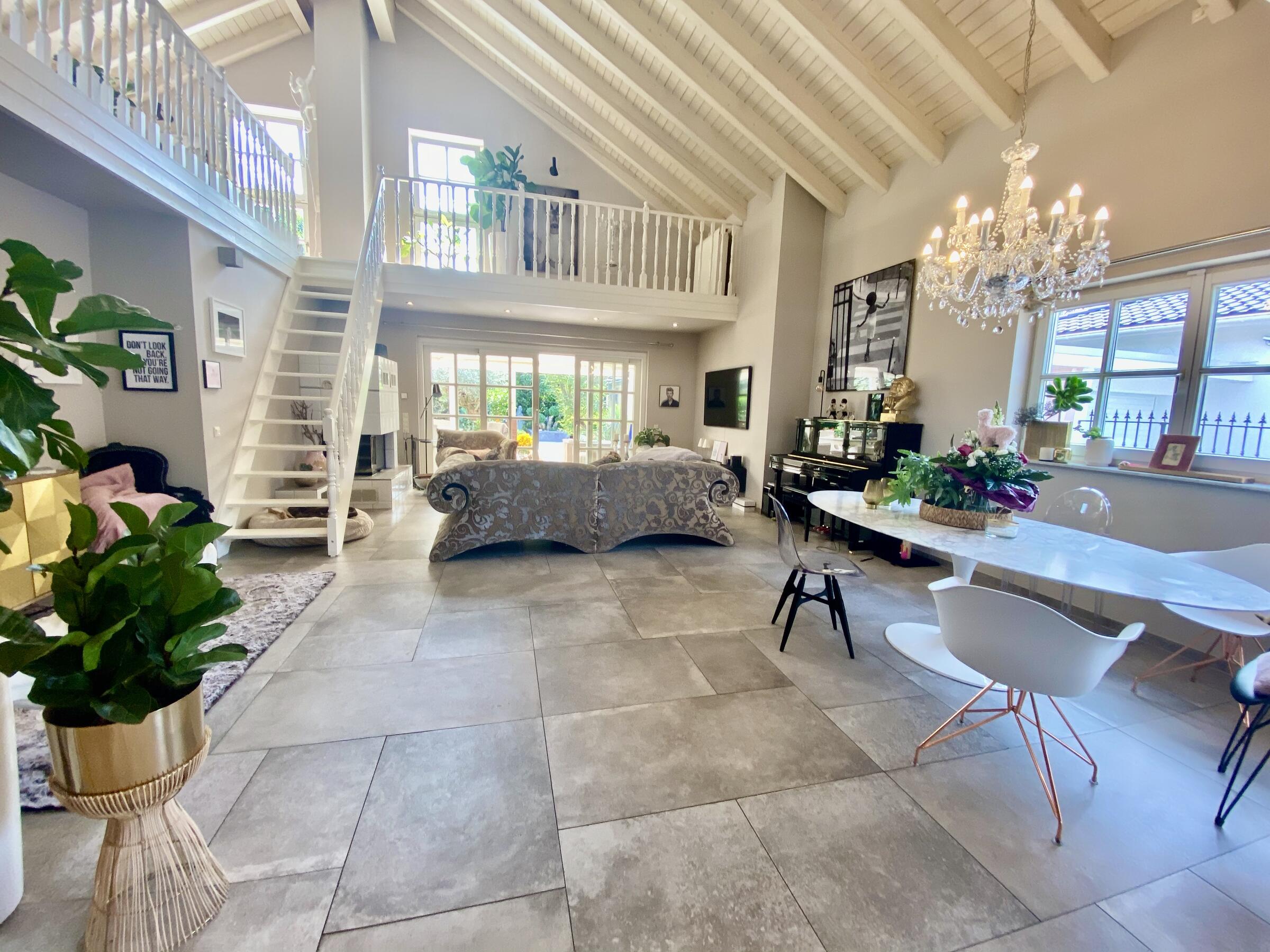 Unser schönes Einfamilienhaus im Südfranzösischen Stil befindet sich auf einem 530 m² großen Grundstück in Monheim am Rhein, einer Kleinstadt zwischen Düsseldorf und Köln. Es zeichnet sich durch seine erstklassige Einrichtung und hochwertige Ausstattung aus. Durch den Eingangsbereich gelangt man in den großen Wohnbereich, der sich über 2 Etagen mit offener Galerie erstreckt und über einen Kamin und eine offene Küche verfügt. Vom Wohnbereich aus gelangt man zu den Privaträumen: ein Schlafzimmer mit großem Zugang zur Terrasse, ein großes Wellnessbad mit freistehender Wanne, zwei Waschtischen, außergewöhnlichen Lichtkonzepten und einer großen begehbaren Dusche/Dampfsauna.