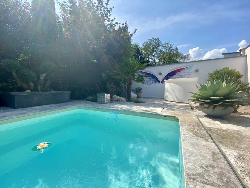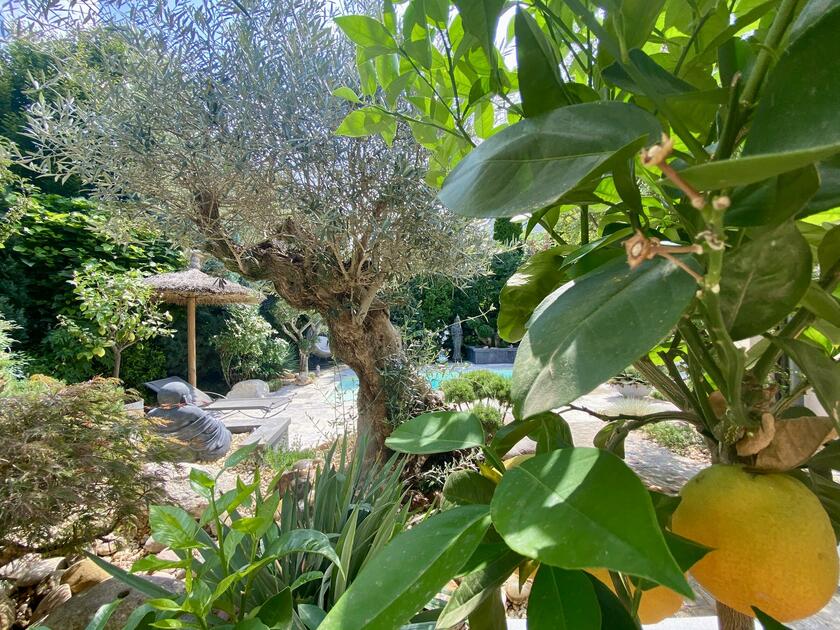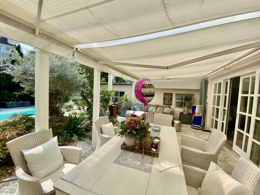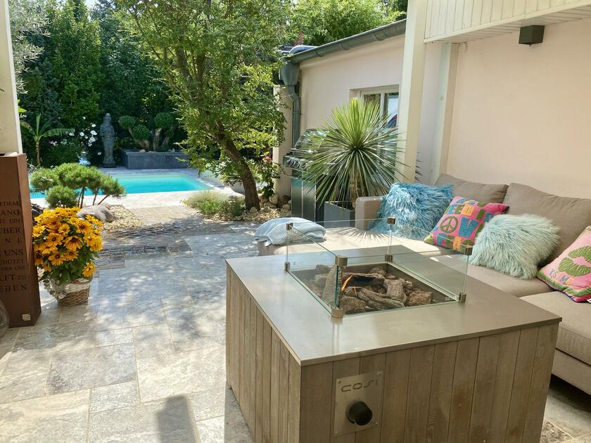 Der Garten ist vollkommen uneinsehbar. Er verfügt über eine mediterrane Bepflanzung mit großen Oliven, Feigenbäume, Palmen etc. Dazu Natursteinböden, eine beleuchtete Bar und eine große überdachte Terrasse mit Feuerstelle und Whirlpool. Der Pool ist beheizbar, mit Lichteffekten und Gegenstromanlage. Das gesamte Anwesen ist mit hochwertigsten Materialien ausgestattet. Die Einrichtung ist extravagant und im Art Déco und Pop Art Stil.