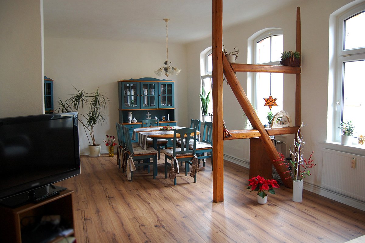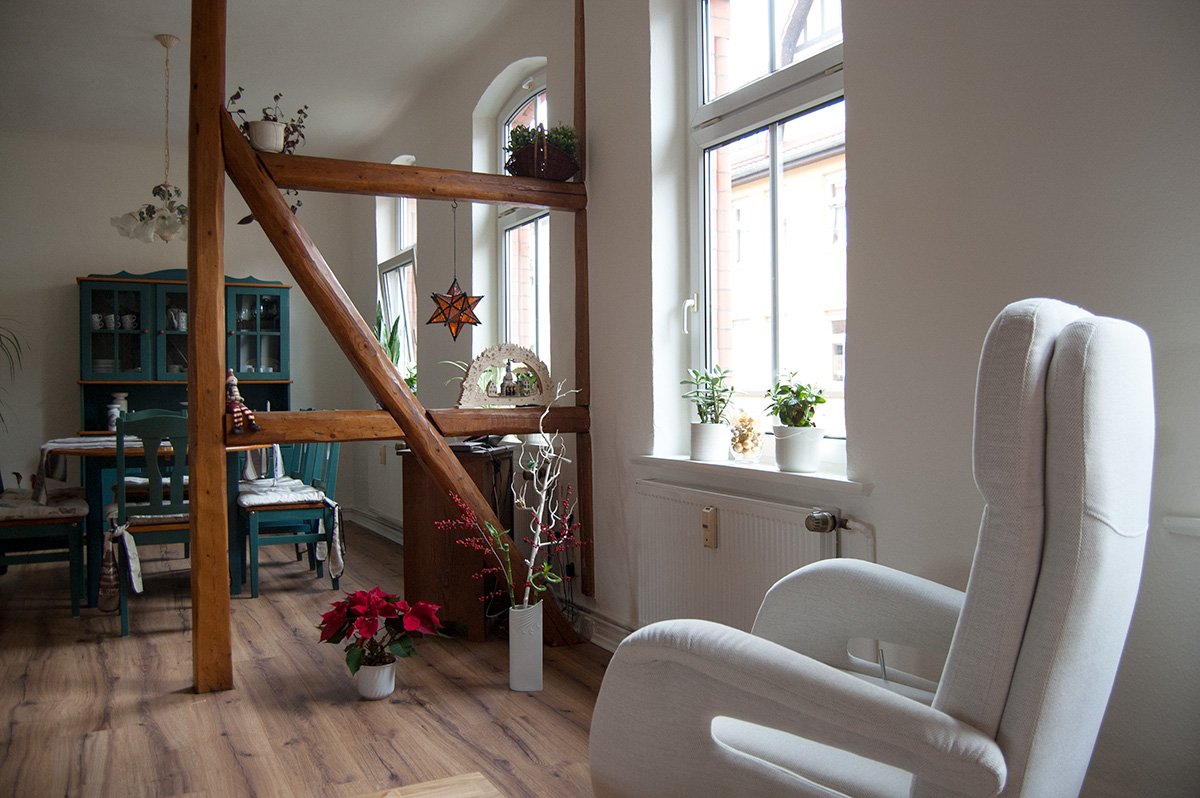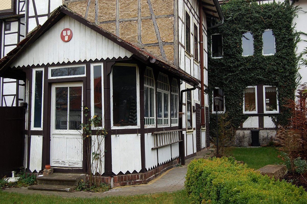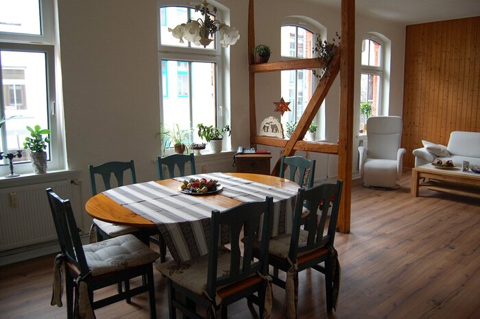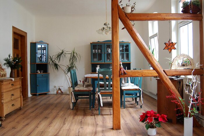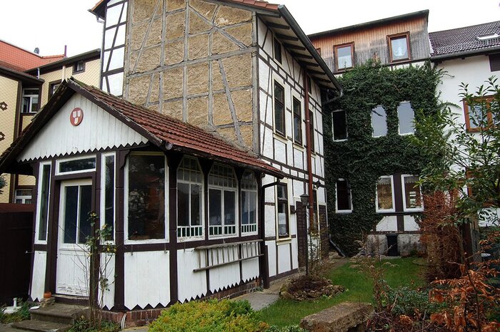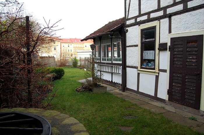 Das renovierte Fachwerkhaus liegt in einer ruhigen Wohnstraße einer mittelalterlichen Stadt in Thüringen. Die Fassade des Einfamilienhauses zur Straßenseite besteht aus Klinkerbau. Die Rückseite des Hauses zeigt noch die schöne Struktur des original erhaltenen Fachwerks. Im gepflegten, wildromantischen Garten befindet sich ein Zierbrunnen und ein Gartenhaus, das ebenfalls ganz in Fachwerk erbaut wurde. Der Wohnraum, bestehend aus einem großen türlosen Raum im Loftstil, befindet sich im Obergeschoß und steht zur Vermietung als Filmlocation und Fotolocation zur Verfügung. Das Haus stellt zudem Räumlichkeiten für Logistik und Teamaufenthalt oder Catering zur Verfügung. Eine attraktive Besonderheit bilden die original restaurierten Holzbalken, die Rundbogenfenster und die schönen Holztüren. Die gesamte Etage ist mit Holzlaminat ausgestattet, einige Wände weisen zudem eine Holzvertäfelung auf. Die helle Wohneinheit im Obergeschoß verfügt über eine moderne Einbauküche und einen kleinen Flur, über den eine Holztreppe zum Hauseingang führt.