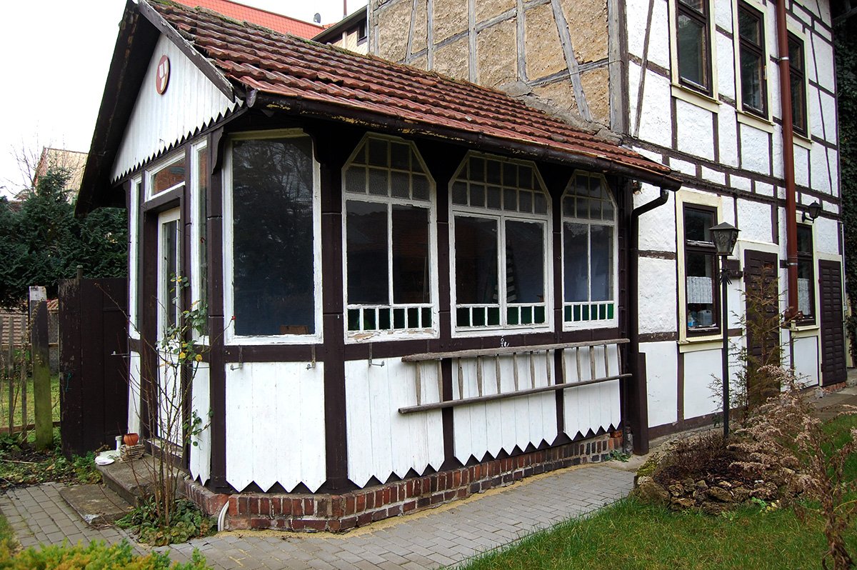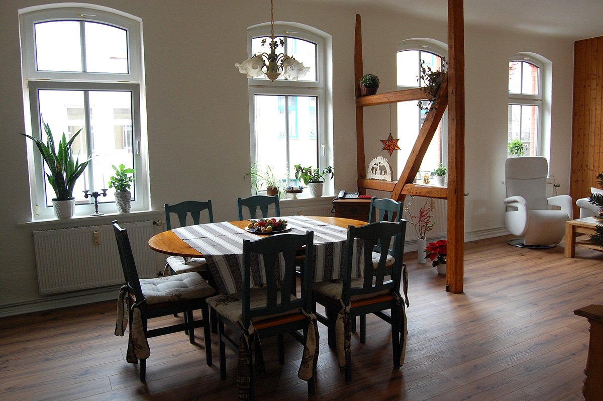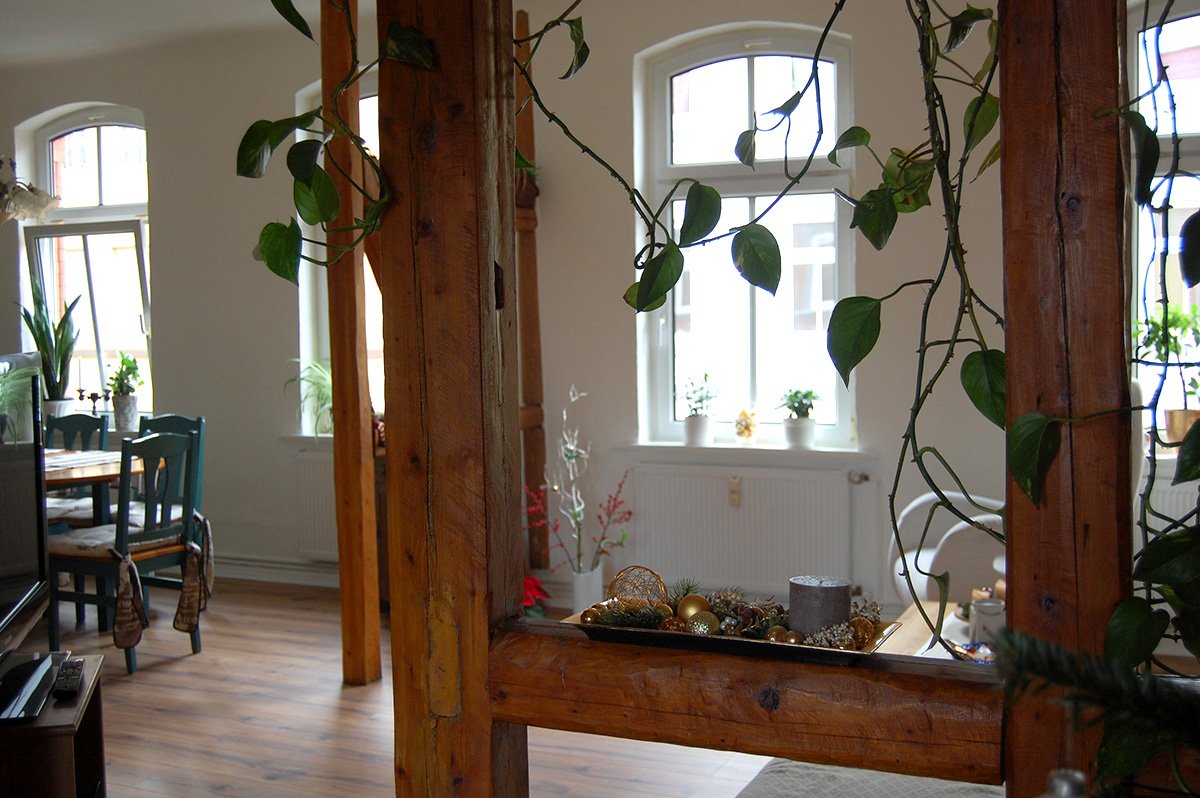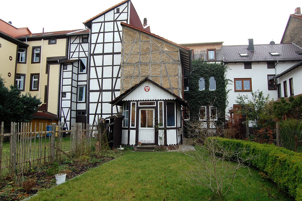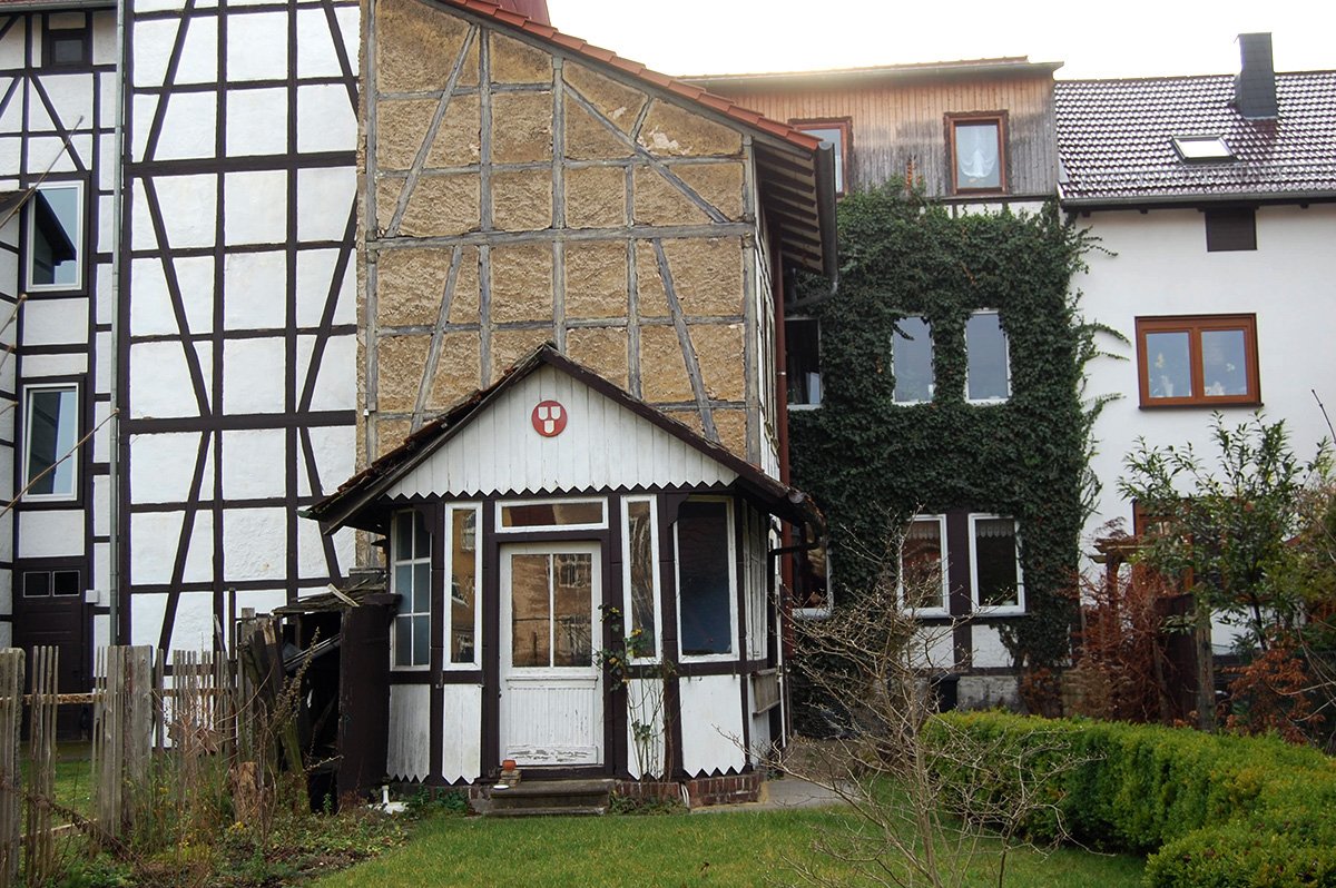 Das renovierte Fachwerkhaus liegt in einer ruhigen Wohnstraße einer mittelalterlichen Stadt in Thüringen. Die Fassade des Einfamilienhauses zur Straßenseite besteht aus Klinkerbau. Die Rückseite des Hauses zeigt noch die schöne Struktur des original erhaltenen Fachwerks. Im gepflegten, wildromantischen Garten befindet sich ein Zierbrunnen und ein Gartenhaus, das ebenfalls ganz in Fachwerk erbaut wurde. Der Wohnraum, bestehend aus einem großen türlosen Raum im Loftstil, befindet sich im Obergeschoß und steht zur Vermietung als Filmlocation und Fotolocation zur Verfügung. Das Haus stellt zudem Räumlichkeiten für Logistik und Teamaufenthalt oder Catering zur Verfügung. Eine attraktive Besonderheit bilden die original restaurierten Holzbalken, die Rundbogenfenster und die schönen Holztüren. Die gesamte Etage ist mit Holzlaminat ausgestattet, einige Wände weisen zudem eine Holzvertäfelung auf. Die helle Wohneinheit im Obergeschoß verfügt über eine moderne Einbauküche und einen kleinen Flur, über den eine Holztreppe zum Hauseingang führt.
