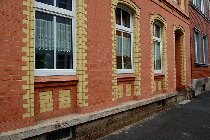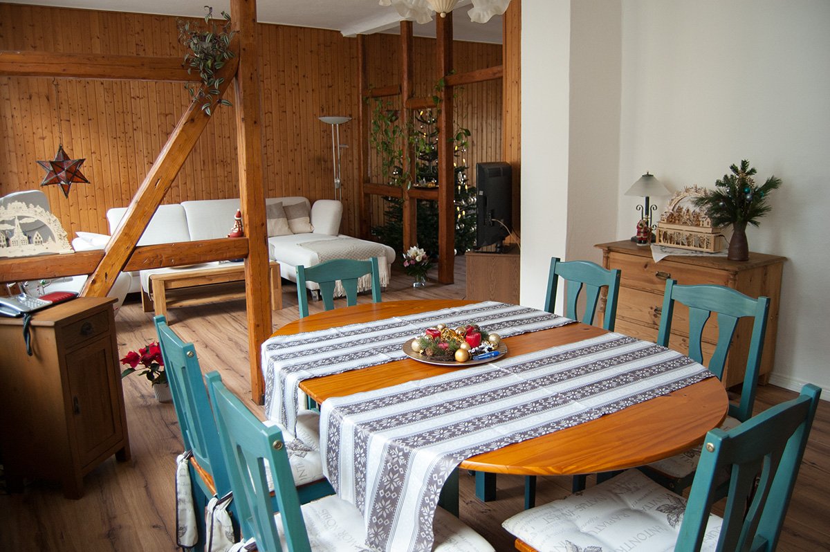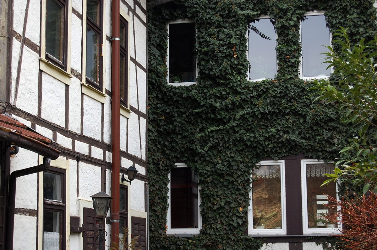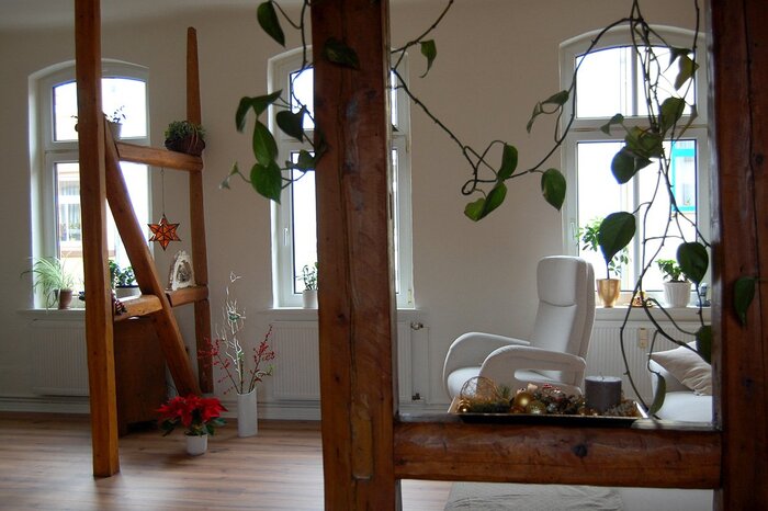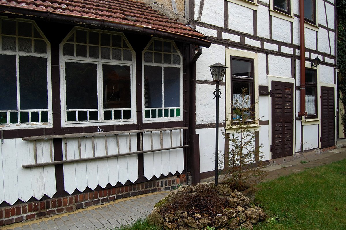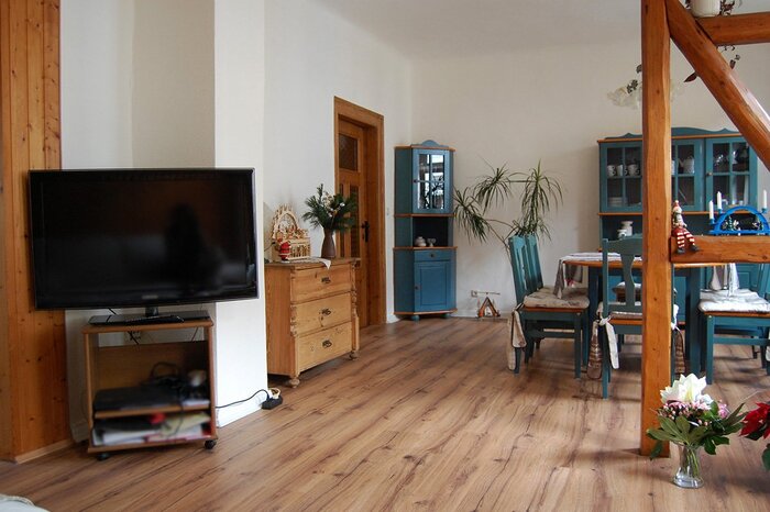 Das renovierte Fachwerkhaus liegt in einer ruhigen Wohnstraße einer mittelalterlichen Stadt in Thüringen. Die Fassade des Einfamilienhauses zur Straßenseite besteht aus Klinkerbau. Die Rückseite des Hauses zeigt noch die schöne Struktur des original erhaltenen Fachwerks. Im gepflegten, wildromantischen Garten befindet sich ein Zierbrunnen und ein Gartenhaus, das ebenfalls ganz in Fachwerk erbaut wurde. Der Wohnraum, bestehend aus einem großen türlosen Raum im Loftstil, befindet sich im Obergeschoß und steht zur Vermietung als Filmlocation und Fotolocation zur Verfügung. Das Haus stellt zudem Räumlichkeiten für Logistik und Teamaufenthalt oder Catering zur Verfügung. Eine attraktive Besonderheit bilden die original restaurierten Holzbalken, die Rundbogenfenster und die schönen Holztüren. Die gesamte Etage ist mit Holzlaminat ausgestattet, einige Wände weisen zudem eine Holzvertäfelung auf. Die helle Wohneinheit im Obergeschoß verfügt über eine moderne Einbauküche und einen kleinen Flur, über den eine Holztreppe zum Hauseingang führt.