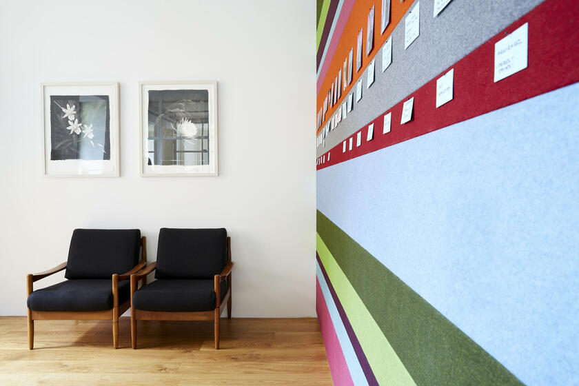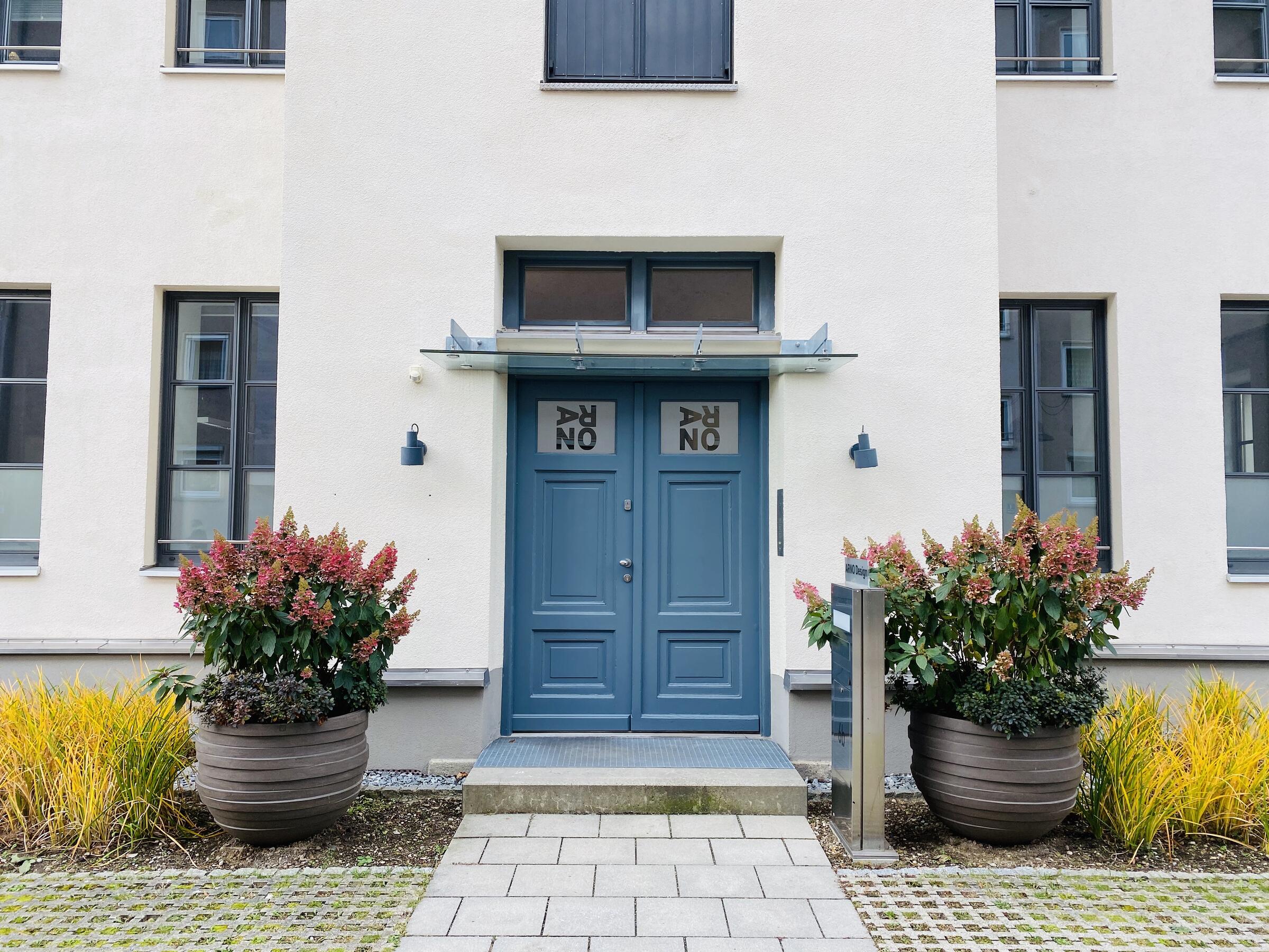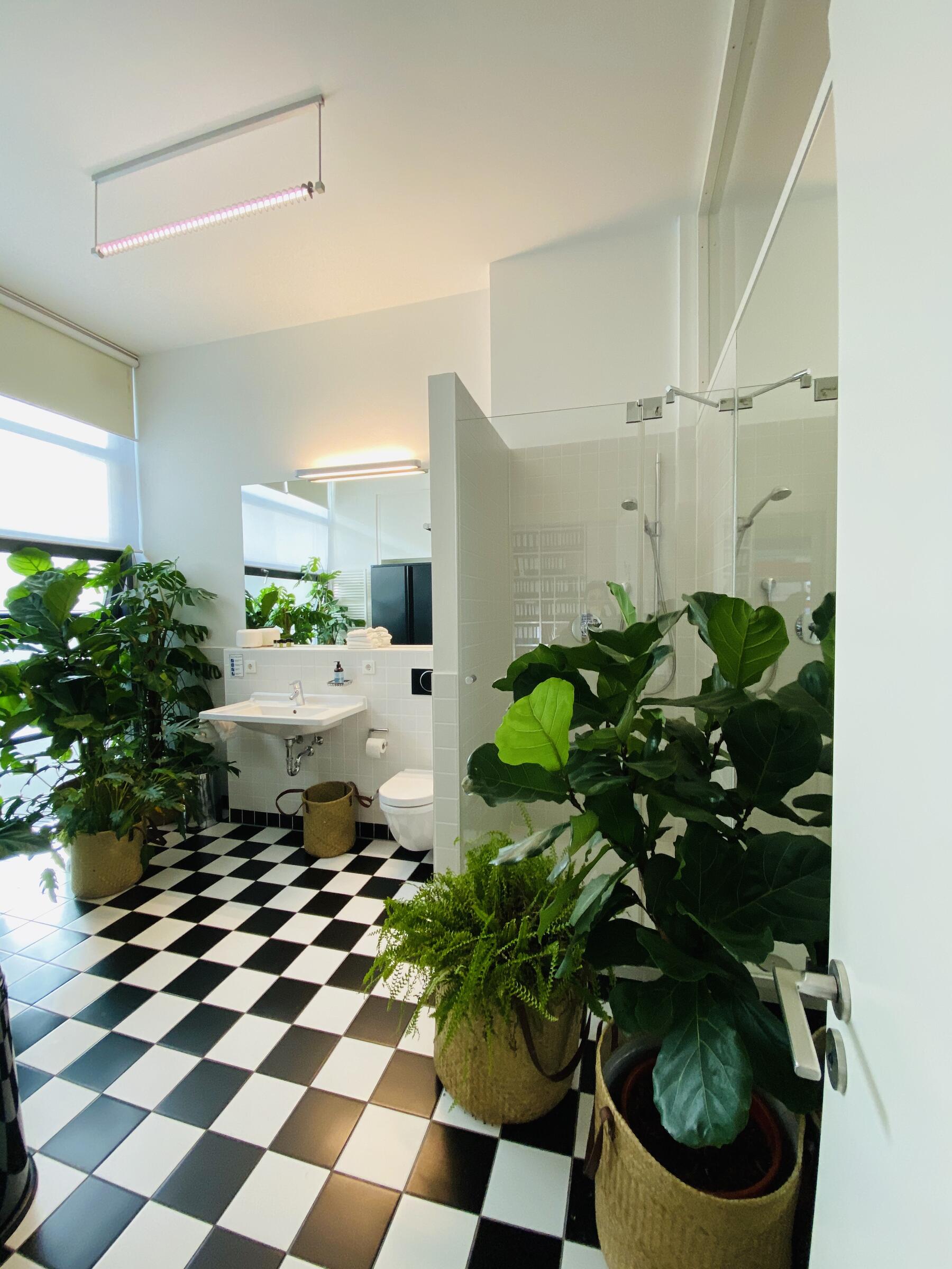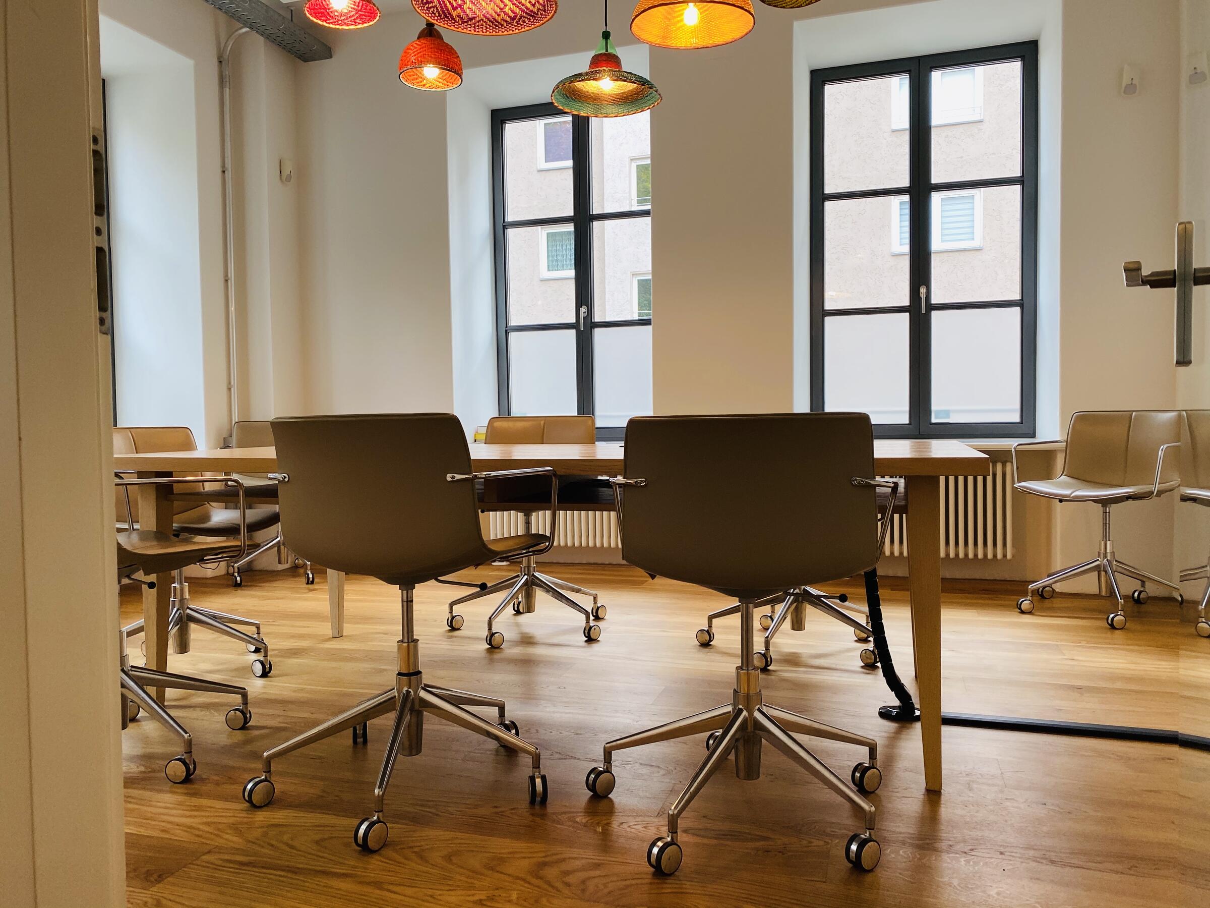 Das ca. 250 m² große Büro- und Designer Loft liegt ganz in der Nähe der Theresienwiese. Es verfügt über eine großzügige Zimmeraufteilung und bietet ausreichend Platz für Kamera- und Fotoausrüstung. Die offene Raumgestaltung wird lediglich durch verglaste Einheiten unterbrochen, durch welche man jedoch weiterhin in den Raum blicken kann. Es gibt einen großen Besprechungsbereich, der nur von einem Vorhang umgeben ist, sowie einen kleineren Besprechungsraum mit Glastür. Das Büro verfügt zudem über eine große Terrasse mit Sonnenschirmen sowie über ein modernes großes WC mit Duschmöglichkeit. Schwarz-weiß Mosaikkacheln am Boden und eine Vielzahl von großen Farnen und Palmen machen das WC fast zu einem „kleinen Dschungel“. Das absolute Highlight der Loft-Fläche ist der mit Tape Art gestaltete Eingangsbereich sowie der große goldene Buddha im Zentrum des Büros. Bei den weiteren Einrichtungsdetails wurde vor allem auf nachhaltige Produkte gesetzt. Wie z. B. „PET“ Designer Lampen in der Besprechung, Filzpflanzen im Foyer sowie mit Filz bezogene Holzpaneelen als Wandverzierung mit gleichzeitiger Post-IT Funktion. Das Büro befindet sich im Erdgeschoss eines Mehrfamilienhauses in einem ruhigen Hinterhof und verfügt über einen Seiten- und einen Haupteingang. Parkplätze befinden sich direkt vor der Haustür. Ebenso ist eine Tiefgarage mit mehreren Stellplätzen verfügbar.