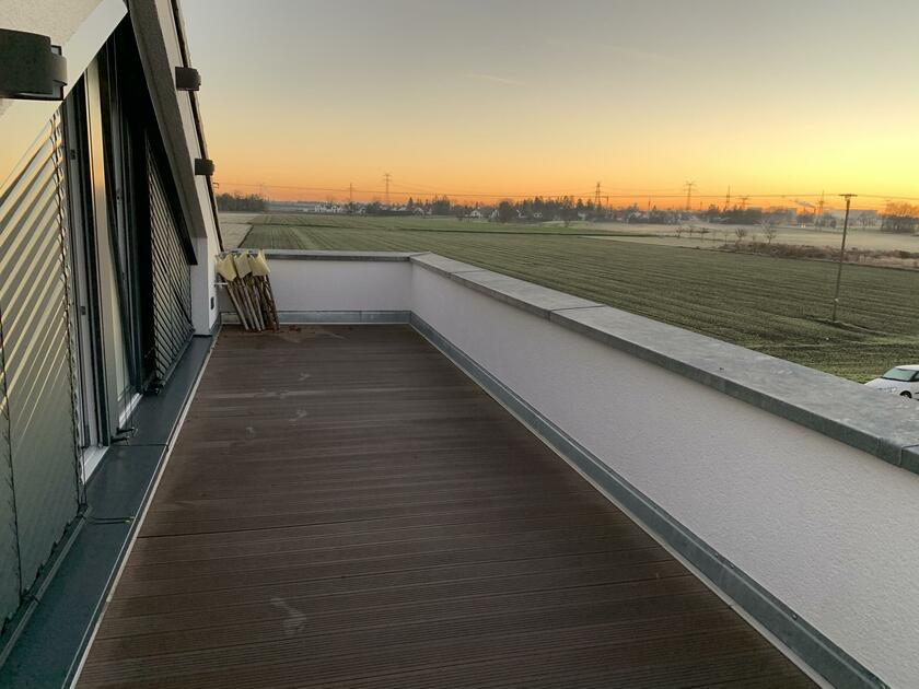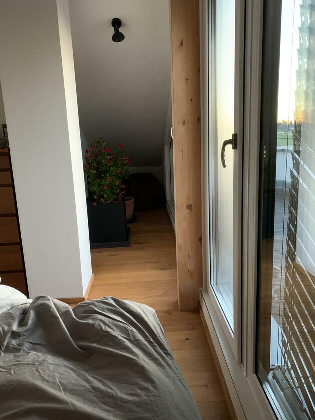 Das Haus ist möbiliert, kann aber je nach Situation angepasst werden. Im Erdgeschoss stehen 50 m² Wohnraum zur Verfügung, welche in die geräumige Küche münden. Vom Wohnbereich aus erreicht man die Holzterrasse über zwei große Schiebetüren. Die Küche hat zwei Zugänge und eine Terrassentür, ideal für alle Perspektiven. Die quadratischen Zimmer im ersten Stock sind, bis auf den Kamin und den Balkon, identisch. Das Haus besitzt auf jeder Seite einen Balkon und eine Dachterrasse die sich über die gesamte Länge erstreckt. Neben dem Haus befindet sich ein 3,5 m breiter Carport. Vor dem Haus befindet sich ein großer Schotterstreifen, der sich ideal zum Parken eignet. Fußläufig sind die S-Bahn, ein Metzger, ein Bäcker und ein Wirtshaus erreichbar.