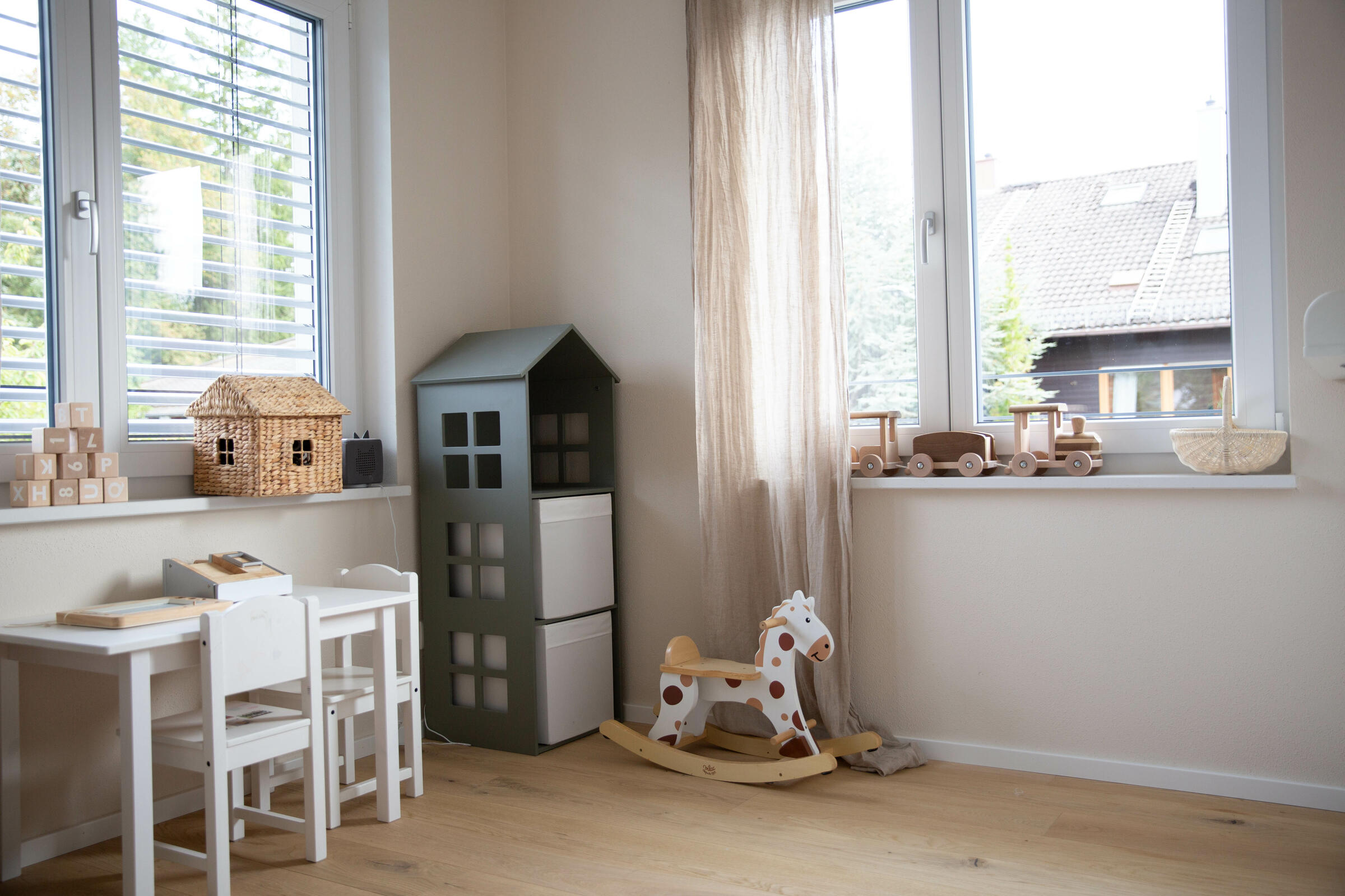 Alle Fenster, außer im Dachgeschoss, können mit Raffstores abgedunkelt werden. Die Räume im Erdgeschoss sind vollkommen offen gestaltet. Die moderne Küche ist im skandinavischen Stil und mit zarten Beigetönen eingerichtet. Im 1. Obergeschoss befinden sich das Masterbad und 2 Schlafzimmer. Im Dachgeschoss sind ein kleines und sehr helles Badezimmer mit Dusche und 2 Kinderzimmer. Im Untergeschoss befindet sich ein Hobbyraum, der beispielsweise für Maske und Abstellmöglichkeiten genutzt werden kann. Unser Haus ist nach Süden ausgerichtet. Parkplatzmöglichkeiten gibt es direkt auf der Straße vor dem Haus. Unser Haus steht an Wochenenden nicht für Anmietungen zur Verfügung.