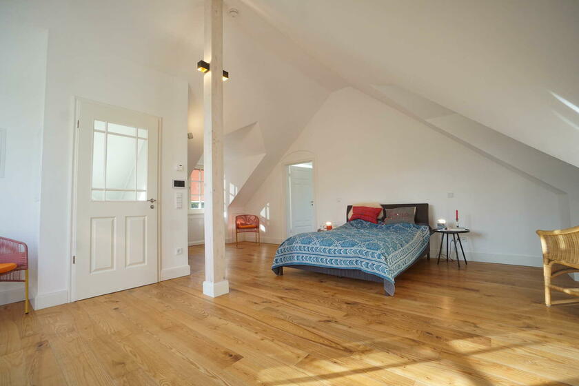 Im neu ausgebauten Dachgeschoss befinden sich ein großes Atelier mit einem weiteren Bad und einer nach Süden orientierten kleinen Dachterrasse. Die Böden sind hier mit massiven Eschedielen ausgeführt, die Wände mit weiß gestrichenem Lehm verputzt.