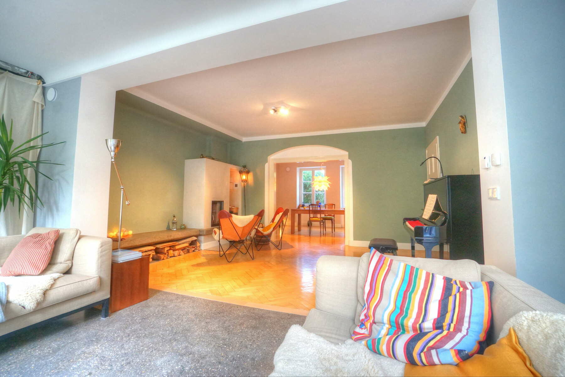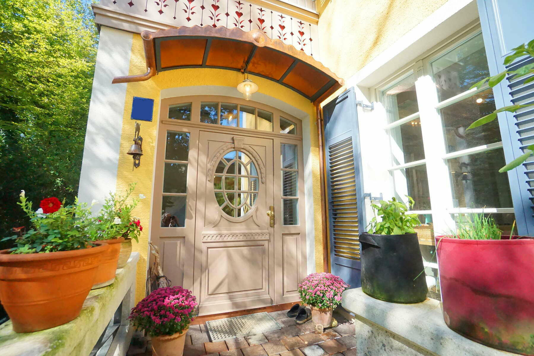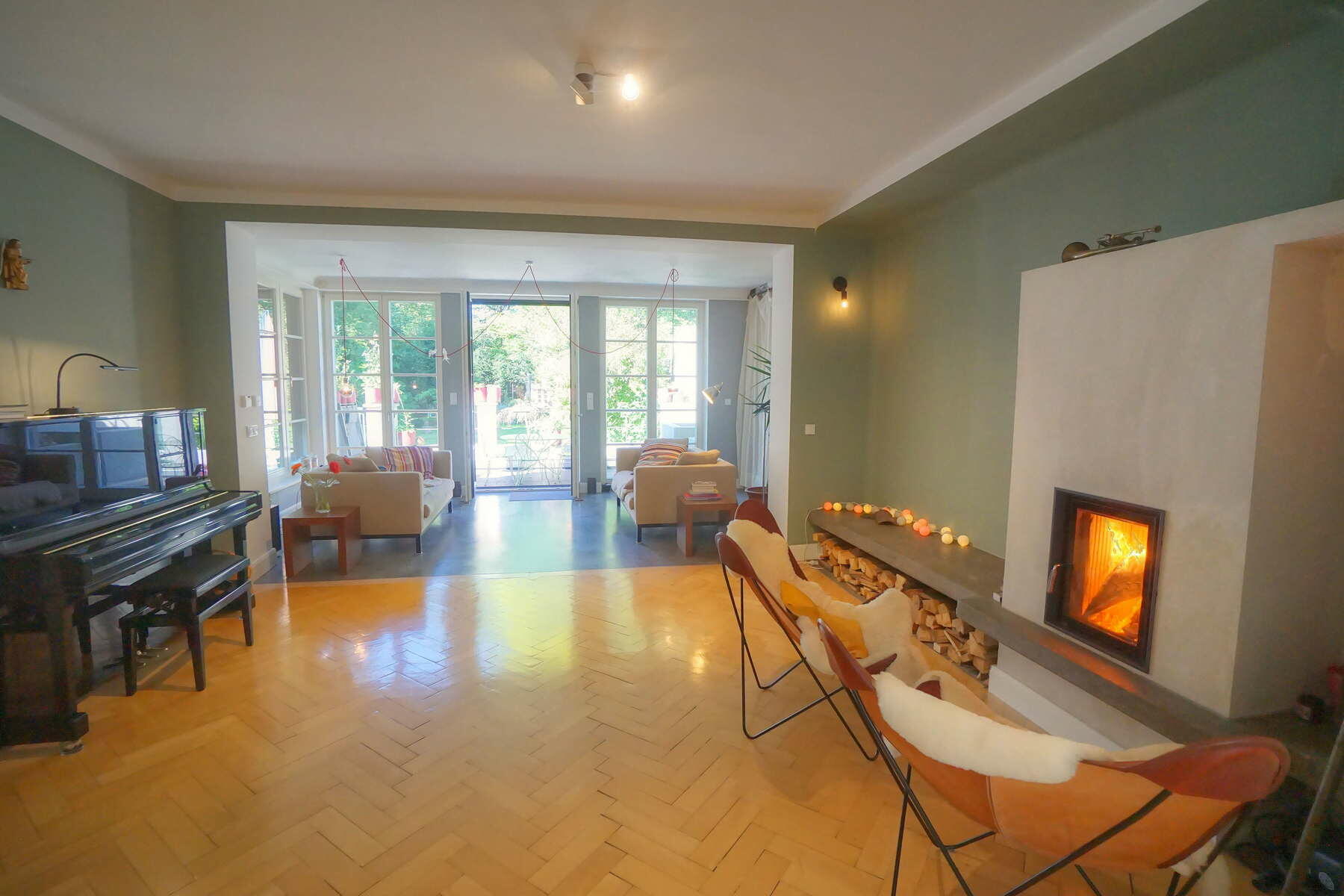 Unsere Doppelhaushälfte befindet sich in einer ruhigen Wohngegend in Harlaching an einer Anliegerstraße und bietet ca. 300 m² Wohnfläche inkl. einer kleinen Einliegerwohnung im Souterrain. Man nähert sich dem in kräftigem Dunkelgelb mit pastellblauen Fensterläden gestalteten Haus über die mit alten Klinkerplatten gepflasterte Zufahrt von Südosten und betritt das ca. 1,5 m über Straßenniveau liegende Erdgeschoss über eine Treppe mit Vorplatz und eine nach historischem Vorbild gestaltete Eingangstüre. Von dort weitet sich der Blick in das großzügige Treppenhaus mit gewendelter Holztreppe. Links befinden sich Garderobe und WC mit jeweils runden Fenstern, rechts die Wohnküche mit Anschluss an das Esszimmer und den großen Wohnbereich, der sich durch den Anbau in den Garten öffnet. Im Wohnraum befindet sich ein Kaminofen mit Betonbank sowie ein Klavier, der gesamte Wohnbereich ist mit historischem (knarzendem) Fischgrätparkett ausgestattet, der Boden im Anbau mit Terrazzo ausgeführt.
