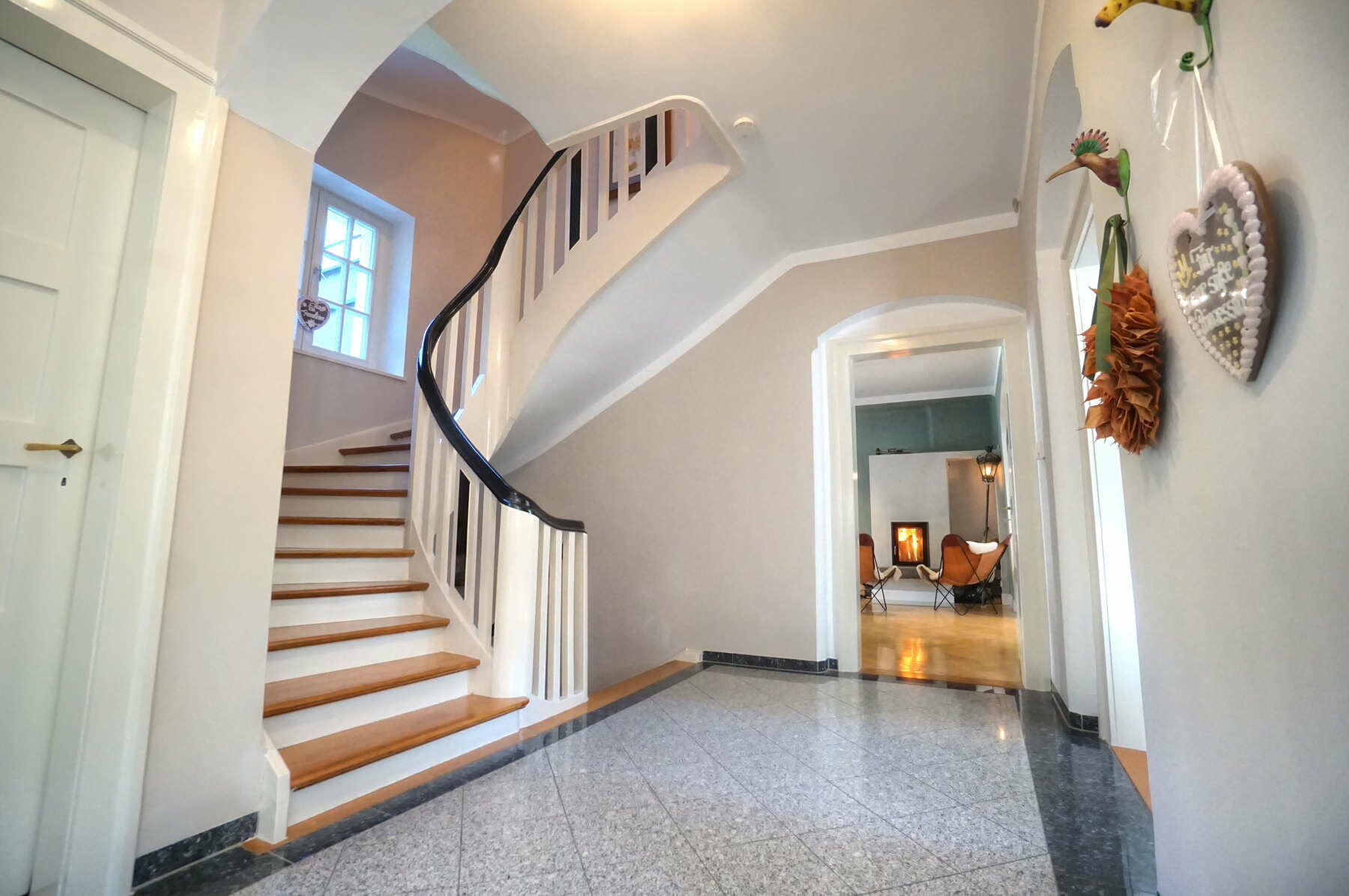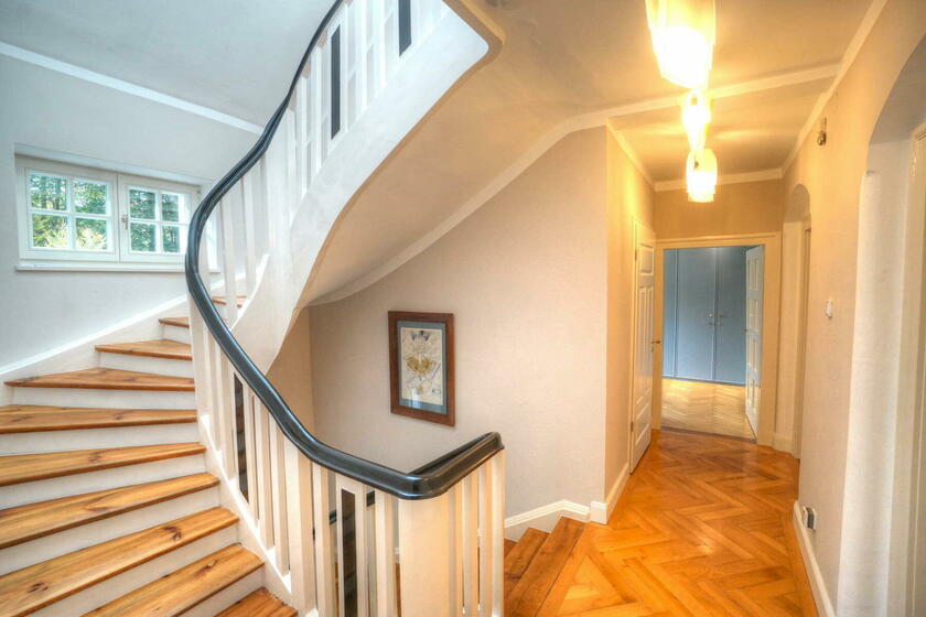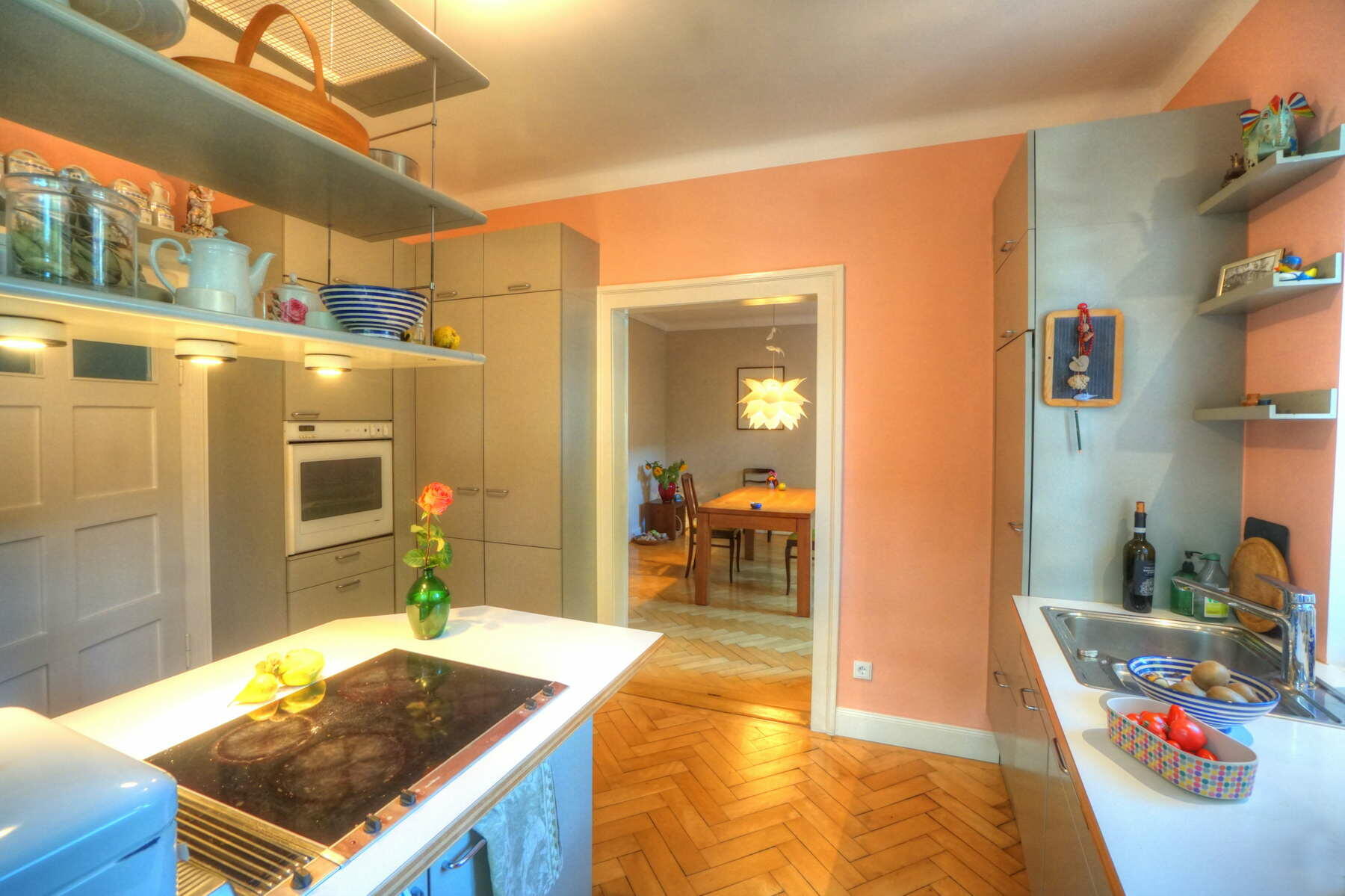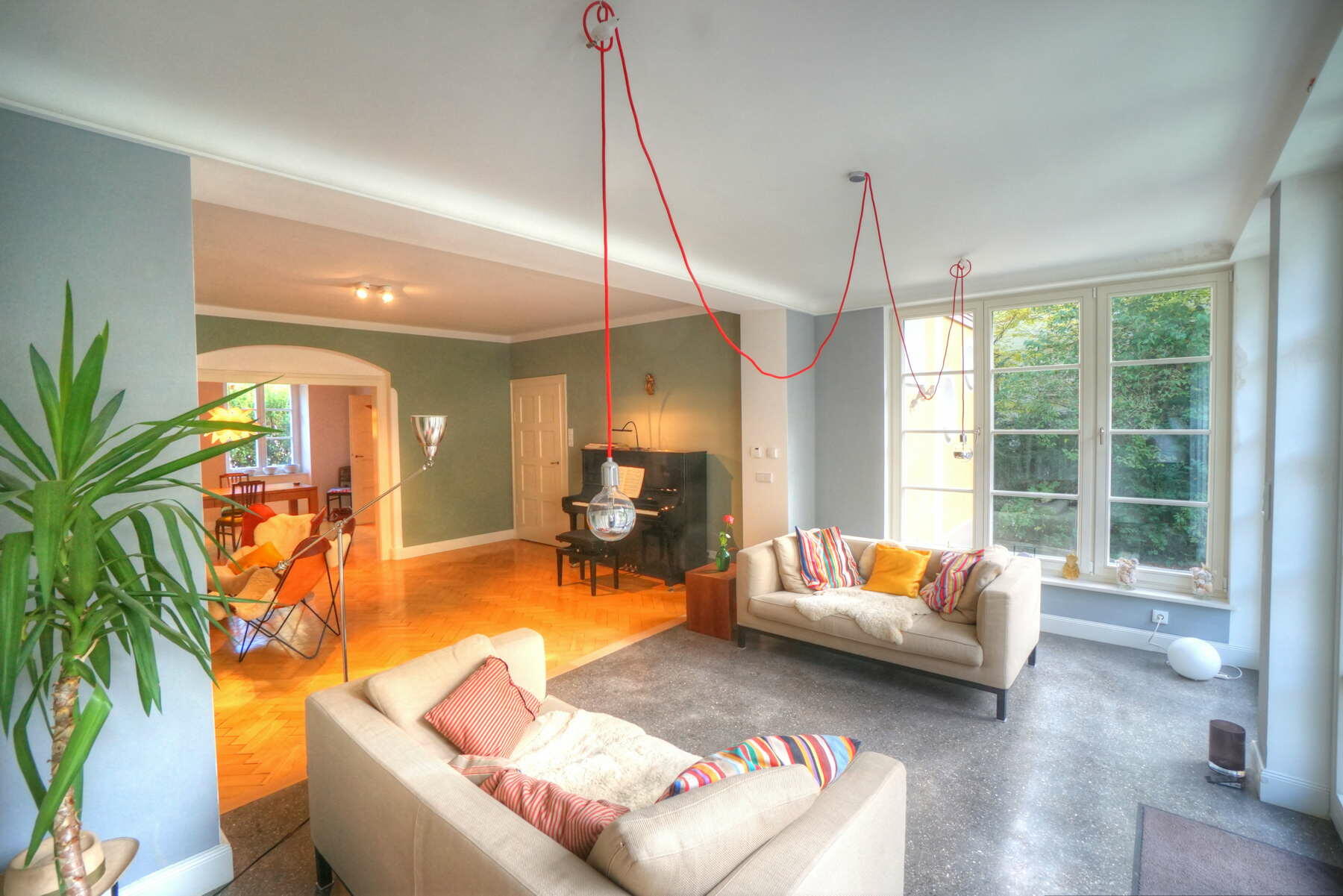 Unsere Doppelhaushälfte befindet sich in einer ruhigen Wohngegend in Harlaching an einer Anliegerstraße und bietet ca. 300 m² Wohnfläche inkl. einer kleinen Einliegerwohnung im Souterrain. Man nähert sich dem in kräftigem Dunkelgelb mit pastellblauen Fensterläden gestalteten Haus über die mit alten Klinkerplatten gepflasterte Zufahrt von Südosten und betritt das ca. 1,5 m über Straßenniveau liegende Erdgeschoss über eine Treppe mit Vorplatz und eine nach historischem Vorbild gestaltete Eingangstüre. Von dort weitet sich der Blick in das großzügige Treppenhaus mit gewendelter Holztreppe. Links befinden sich Garderobe und WC mit jeweils runden Fenstern, rechts die Wohnküche mit Anschluss an das Esszimmer und den großen Wohnbereich, der sich durch den Anbau in den Garten öffnet. Im Wohnraum befindet sich ein Kaminofen mit Betonbank sowie ein Klavier, der gesamte Wohnbereich ist mit historischem (knarzendem) Fischgrätparkett ausgestattet, der Boden im Anbau mit Terrazzo ausgeführt.