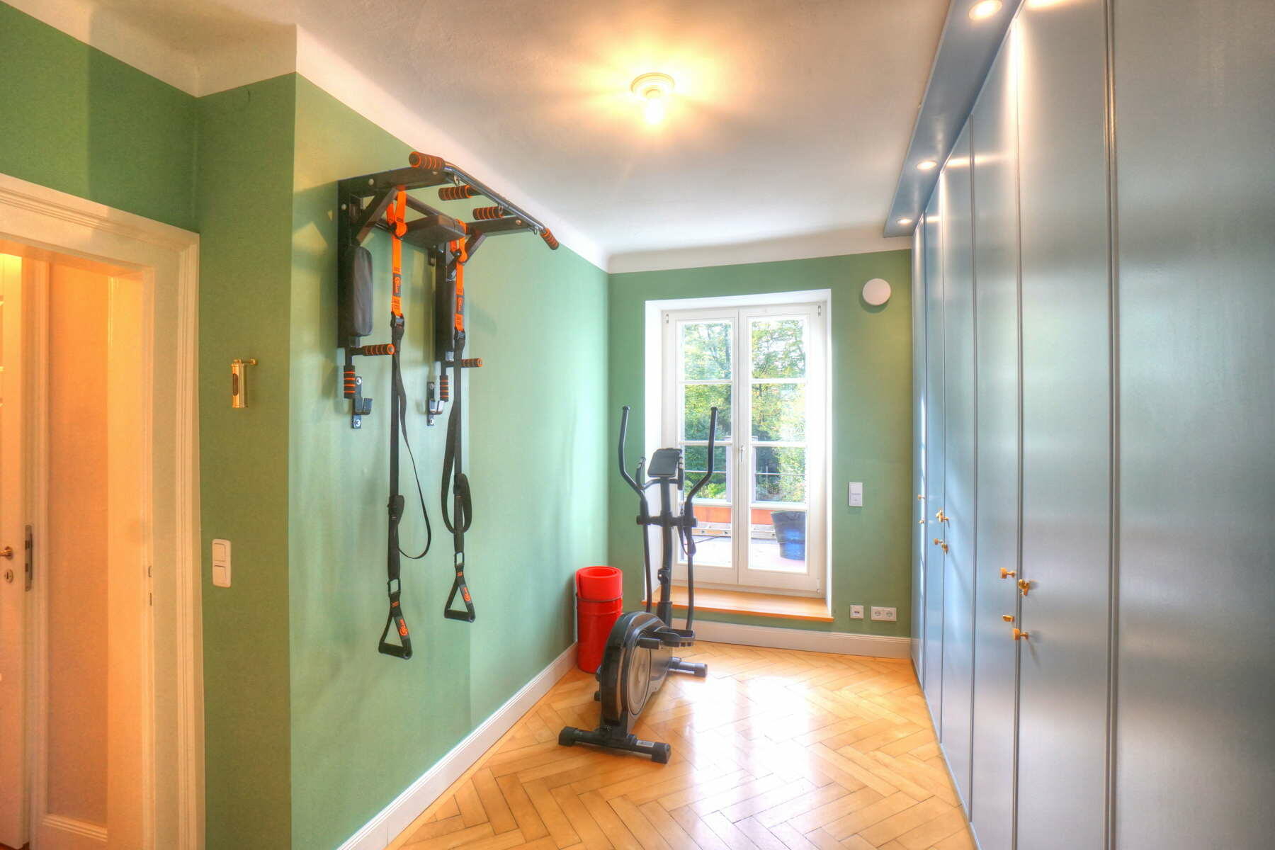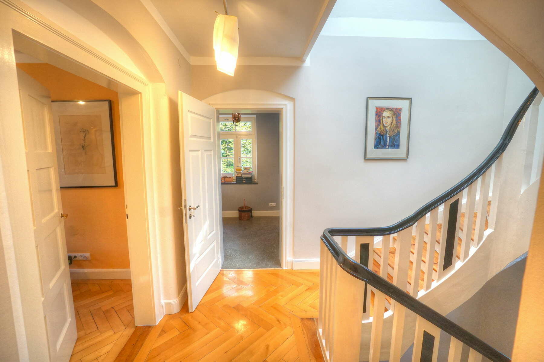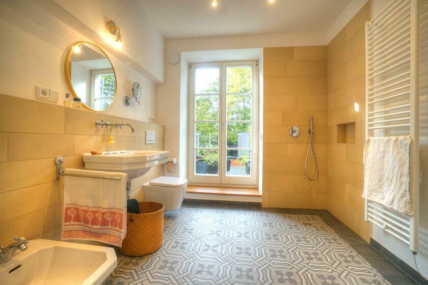 Im Obergeschoss befinden sich ein großes Schlafzimmer mit angeschlossener Ankleide, ein neu hergestelltes Bad mit Solnhofener-Naturstein an den Wänden und Zementfliesen auf dem Boden, ein Arbeitszimmer mit Erker und ein weiteres Arbeitszimmer - das sogenannte Salettl - , das mit seinen vier Fenstern vielfältige Blicke in die nahestehenden Bäume und den rückwärtigen Garten bietet. Bad und Ankleide haben über bodentiefe Fenster Zugang zur Terrasse über dem Anbau mit Blick in den Garten. Hier werden aktuell in Töpfen und einem selbstgebauten Gewächshaus Pflanzen gezogen. Auch im Obergeschoss sind die Böden großteils mit altem Fischgrätparkett ausgeführt. Die Räume sind abgesehen vom Treppenhaus und Bad in kräftigen Farben gestrichen.