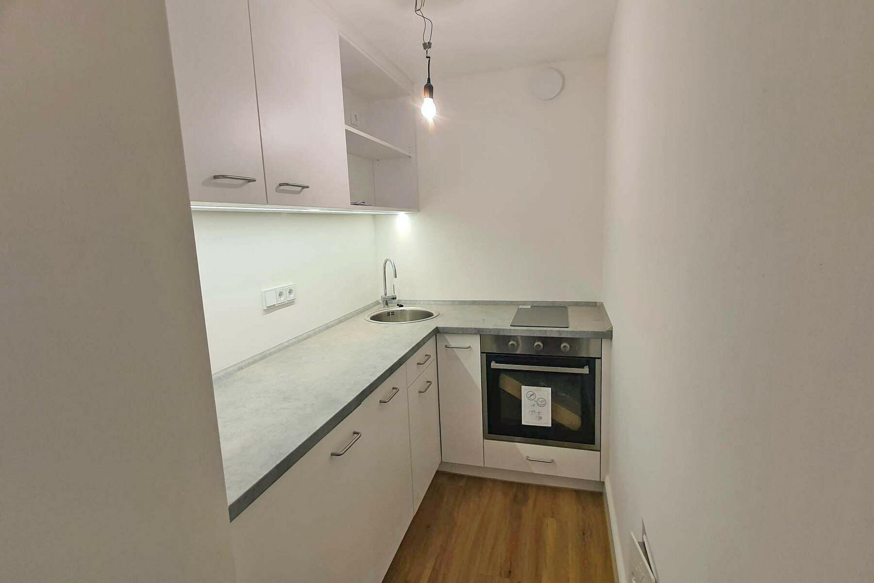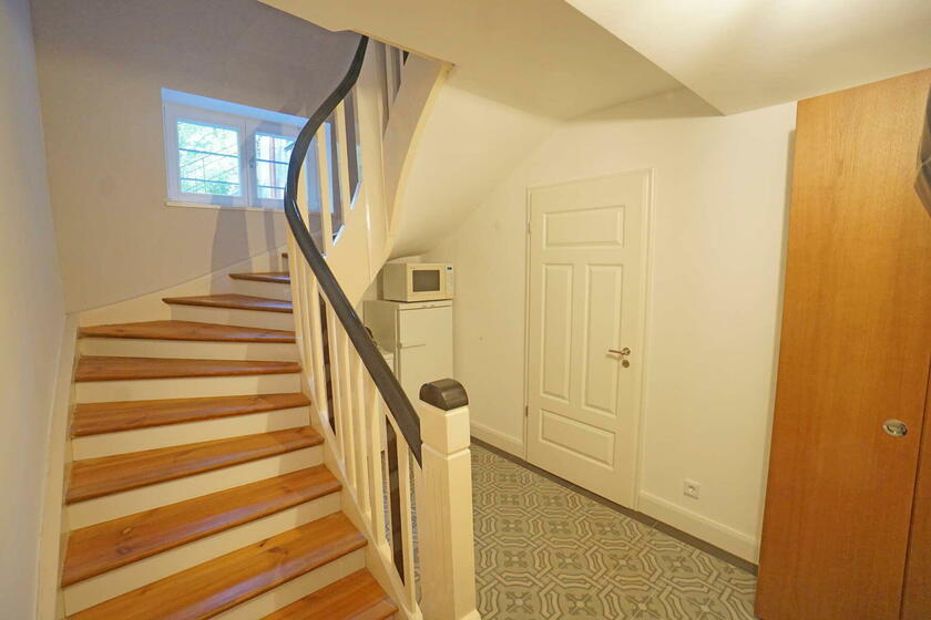 Im Untergeschoss befindet sich eine nach Osten orientierte Einliegerwohnung mit zwei Räumen, Kochnische, Flur und Bad mit Vinylboden in Eicheoptik bzw. Steinzeugfliesen. Außerdem gibt es im Untergeschoss zwei Flure, einen Hausanschlussraum, der auch als Lager genutzt wird und den hochinstallierten Heizungsraum. Im unbeheizten Keller unterhalb der Gartenterrasse befindet sich weitere Haustechnik.