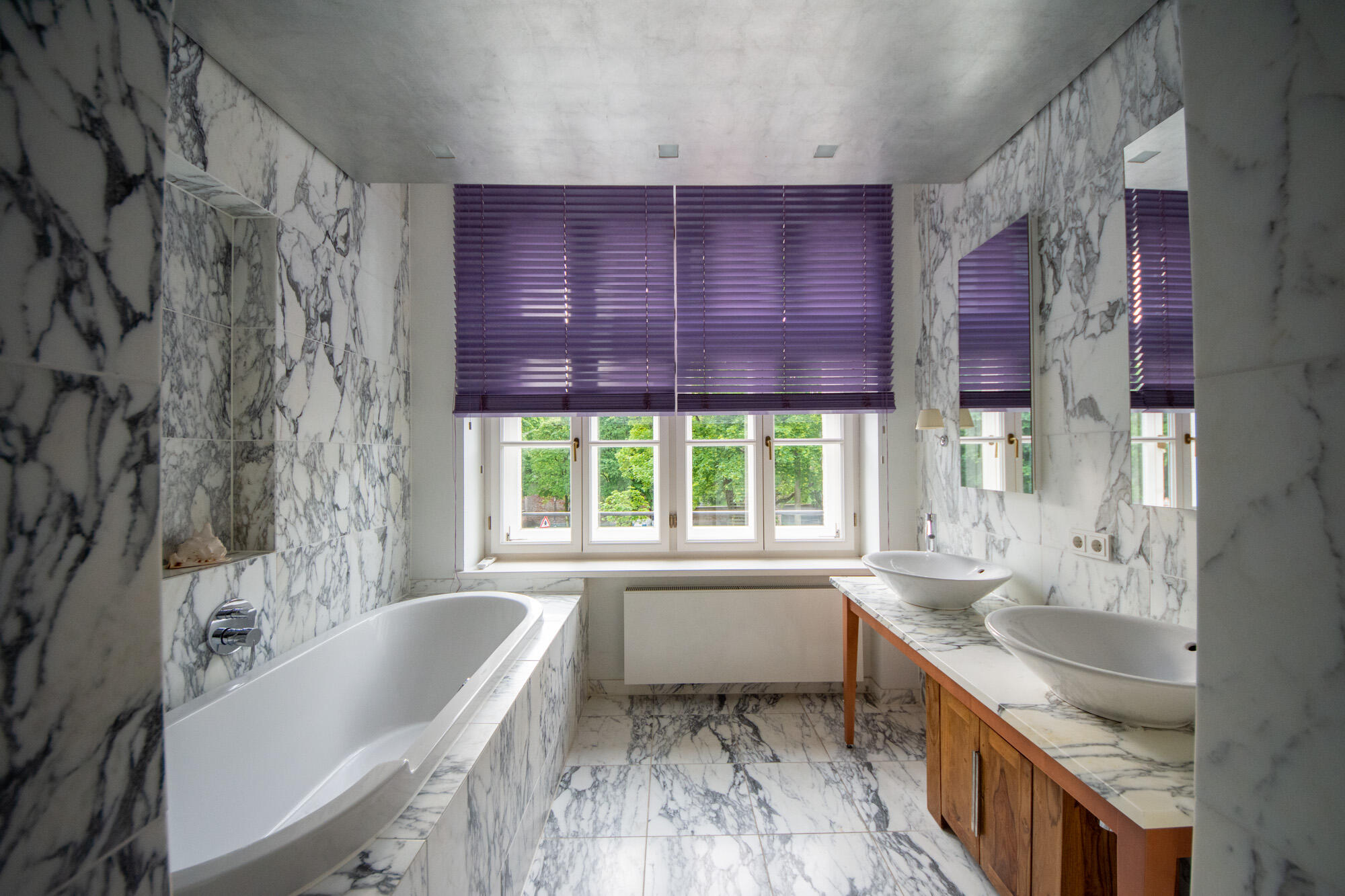 Dem Wohnbereich vorgelagert befindet sich eine Terrasse, die auf der Beletage neben dem Eingangsportal thront und einen traumhaften Ausblick auf den historischen Alten Südfriedhof bietet. Die Küche mit Einbauküche ist sehr großzügig proportioniert und bietet einen geräumigen Essplatz. Die Wohnung ist besonders aufwändig ausgestattet mit hochwertigen Einbauschränken und z. B. mit vergoldeten Säulen im Entrée versehen. Die Vielzahl an großen Fenstern unterstreicht auch hier das großzügige Ambiente der Wohnung und den monumentalen Charakter des Gebäudes.