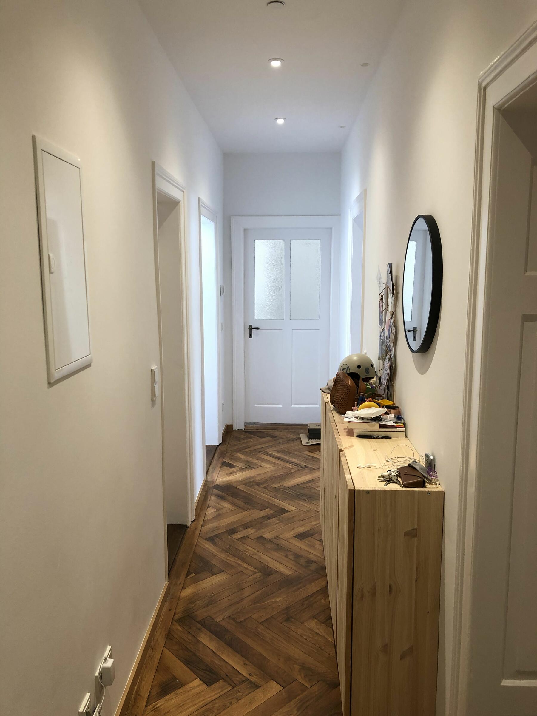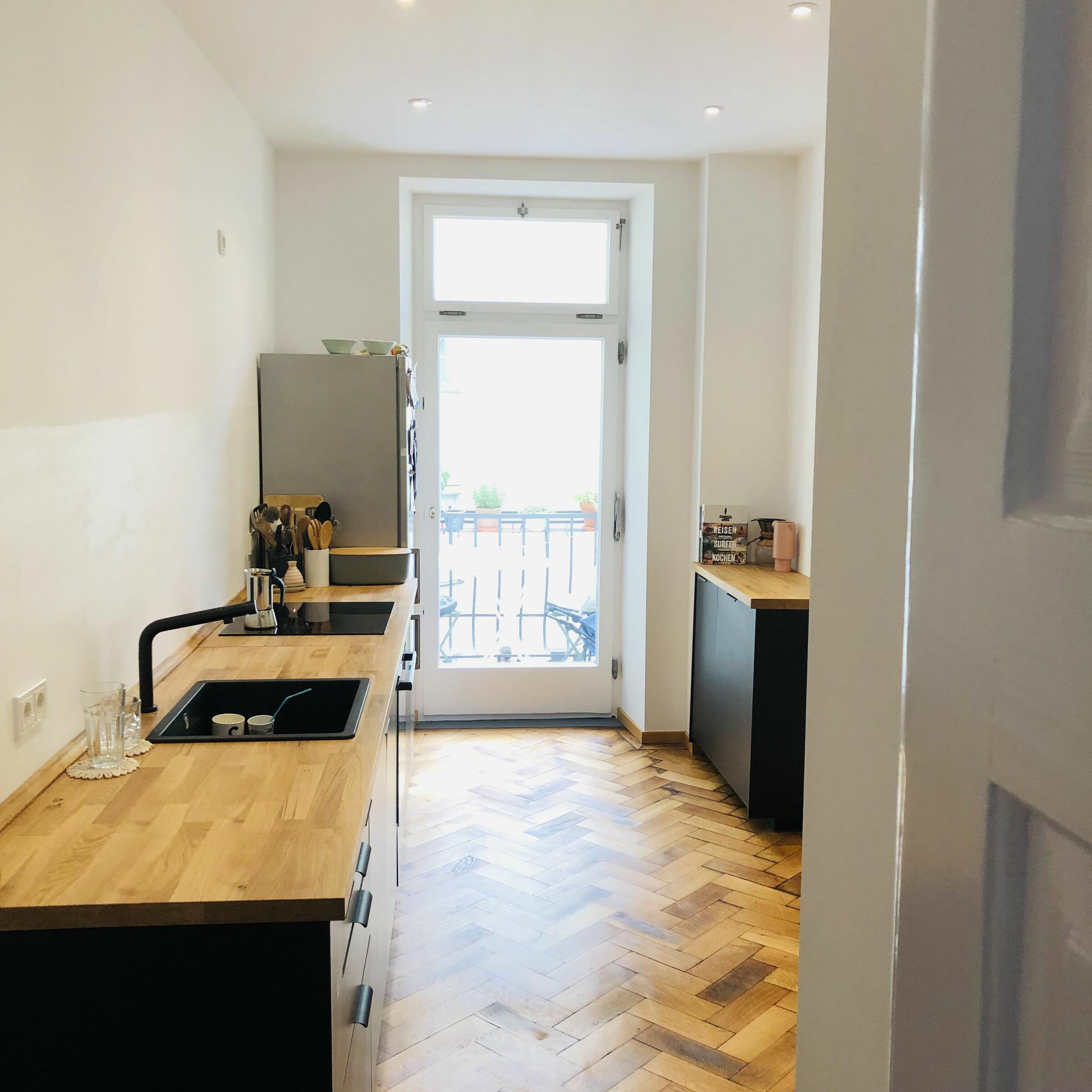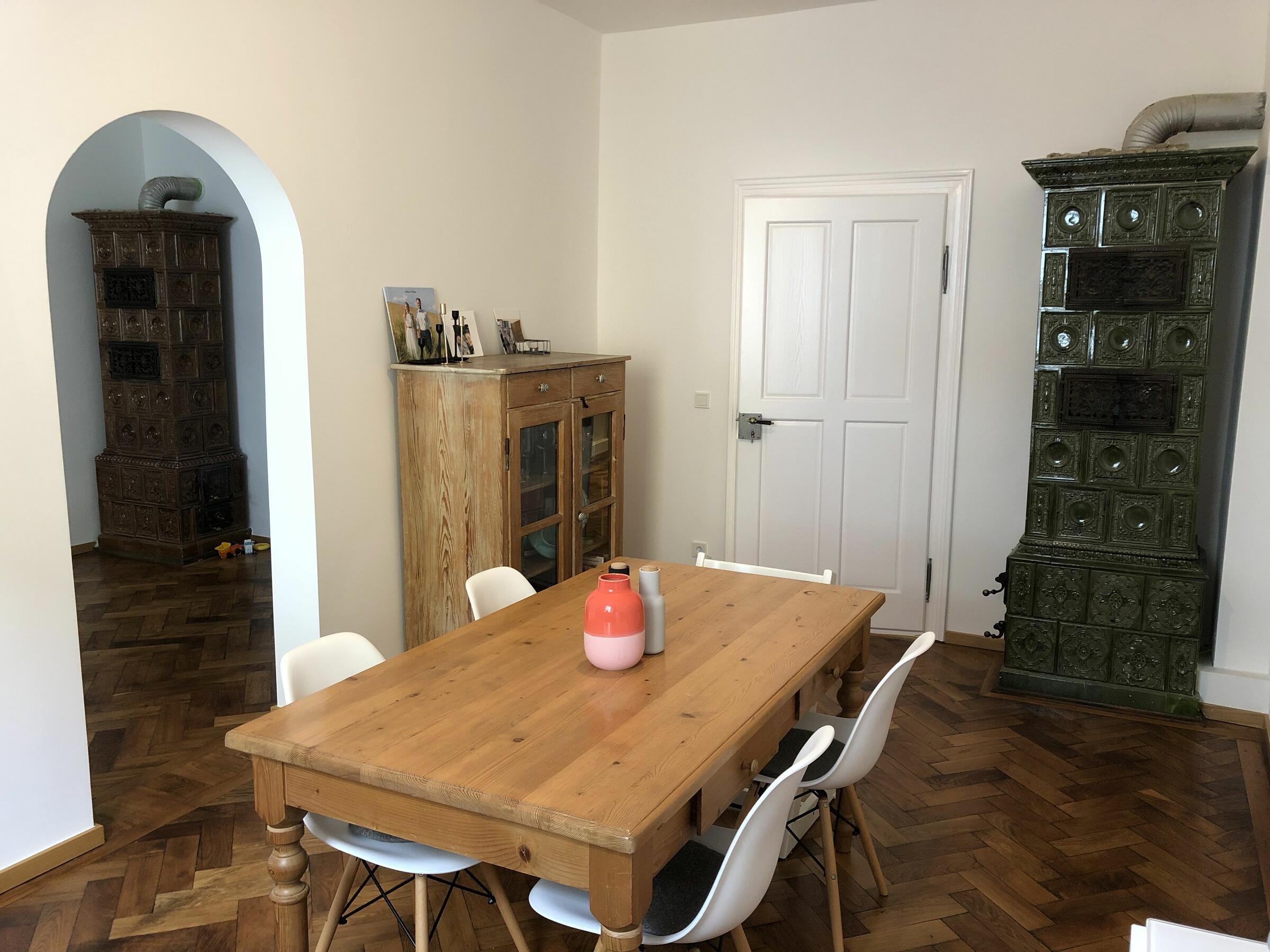 Es handelt sich hierbei um eine sehr liebevoll renovierte Altbauwohnung mit original Fischgrätenboden, Kachelofen und vieles mehr. Die Bäder wurden mit deckenhohen Fließen und Bordüre komplett neu saniert. Die sehr schöne stylische schwarze Küche hat keine Hängeschränke, was den Raum noch größer erscheinen lässt. Unsere Wohnung ist in einem tollen Viertel in der Nähe des Rotkreuzplatzes in München gelegen, mit tollen kleinen Cafés und Restaurants direkt vor der Haustüre.