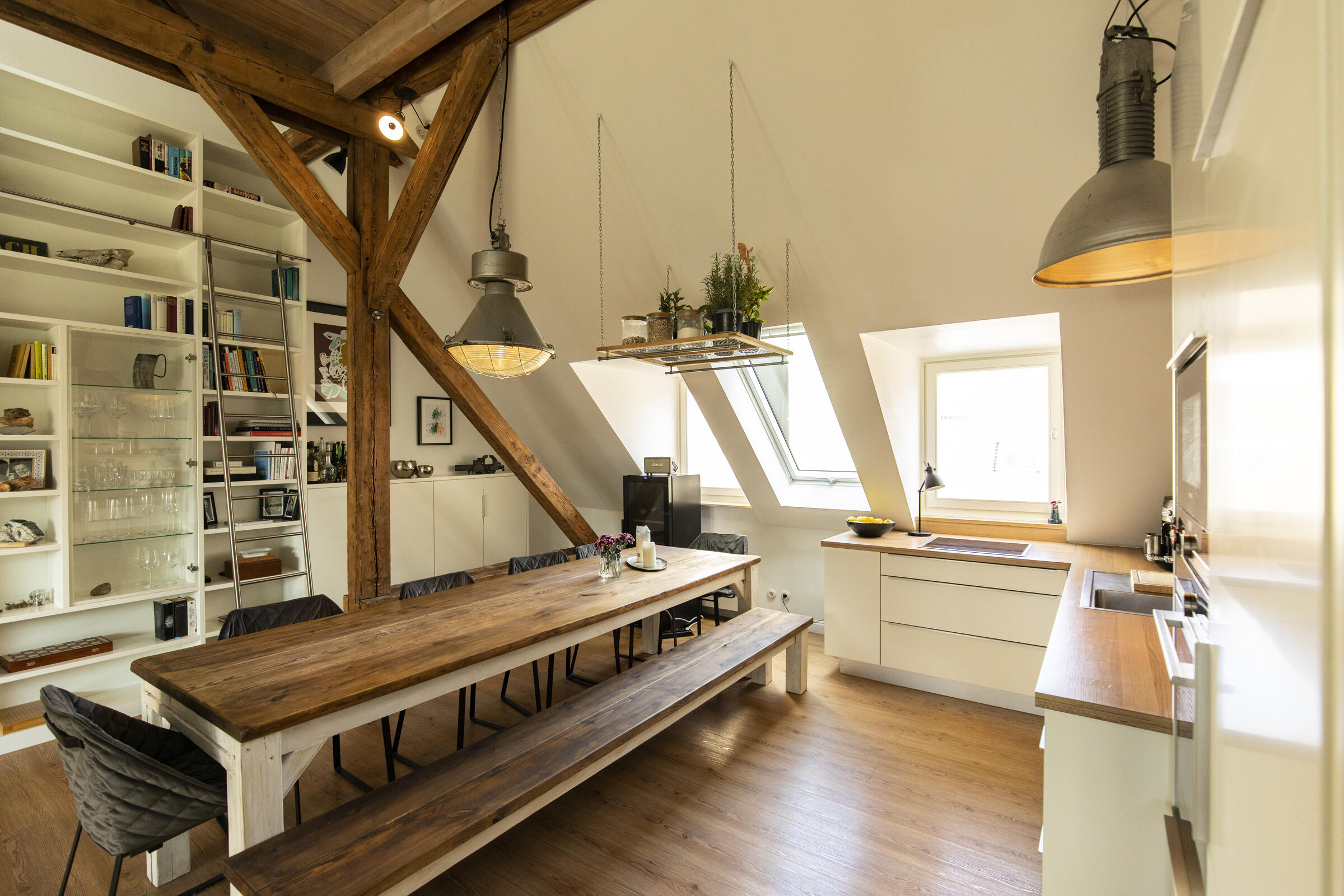 Stylische Wohnung im 4./5. OG zentral im Glockenbachviertel. Die gesamte Raumhöhe beträgt ca. 8 m. Der Raum ist von beiden Seiten und oben hell. Offener Küchen-, Wohn- und Essbereich mit cooler Küchenzeile, Siebträgermaschine, langem Esstisch, Industrieleuchten, modernen Möbeln und zahlreichen Fotos und Gemälden, die je nach Anforderung mit aufgenommen oder abgehängt werden können. Die Galerie ist über eine Wendeltreppe zugänglich. Diese ermöglich den Blick nach unten und hat ein großes Dachflächenfenster, das komplett geöffnet werden kann. Dunkler Eingangsbereich, Schlafzimmer zum Umziehen, Schminken, Stauraum, etc. und ein schönes Bad stehen ebenfalls zur Verfügung.