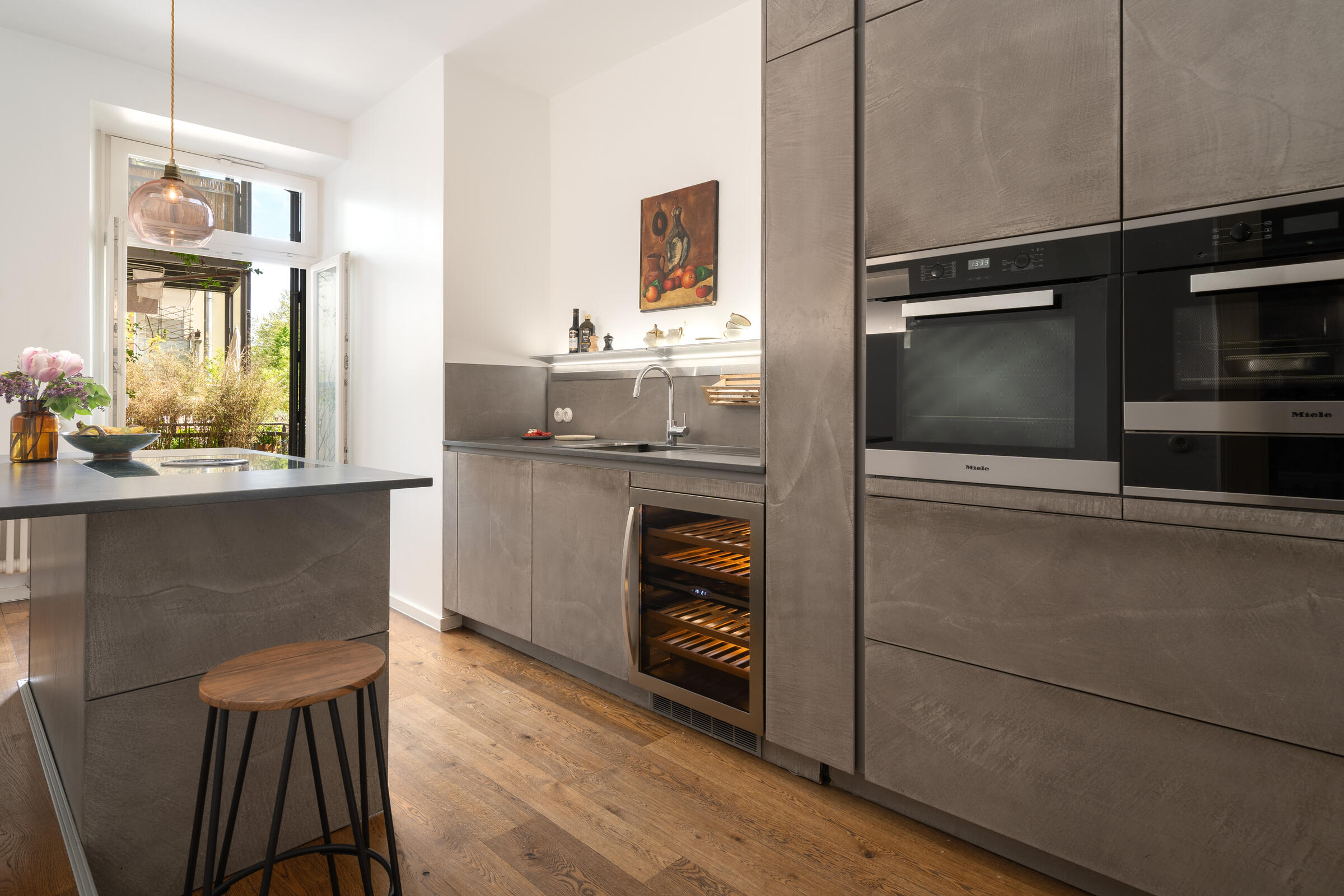 Die unbewohnte Altbauwohnung befindet sich im 1. Obergeschoss eines Wohnhauses in der Maxvorstadt. Der Personenaufzug ist jedoch ausschließlich von den Halbgeschossen des Hauses aus zugänglich. Während der Sanierung der Wohnung im Jahr 2015 wurden die originalen historischen Details wie das Eichenparkett und der Stuck sind in allen Räumen erhalten. Das Wohnzimmer mit Erker und Schwedenofen ist nach Nord-West ausgerichtet und ist am Nachmittag viel Sonnenlicht. Die Möblierung darf nach Absprache entfernt oder ergänzt werden. Im Außenbereich steht eine große und von allen Seiten einsehbare Sonnenterrasse zur Verfügung. Die Wohnung liegt an einer mittelstark befahrenen Kreuzung (keine Tram, kein Bus). Der Straßenlärm ist bei offenen Fenstern zu hören. Die Fenster sind allerdings sehr gut isoliert. Vor dem Haus sind keine Parkplätze vorhanden.