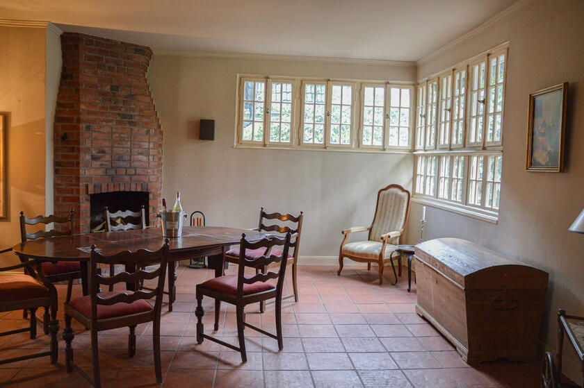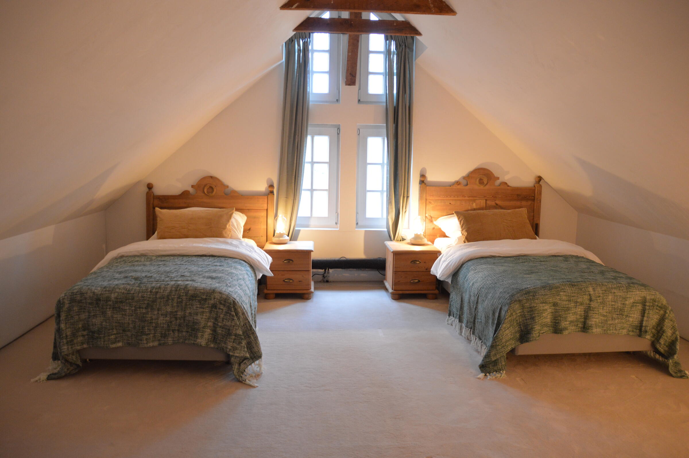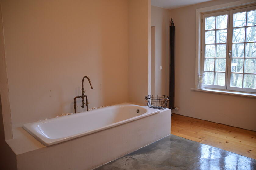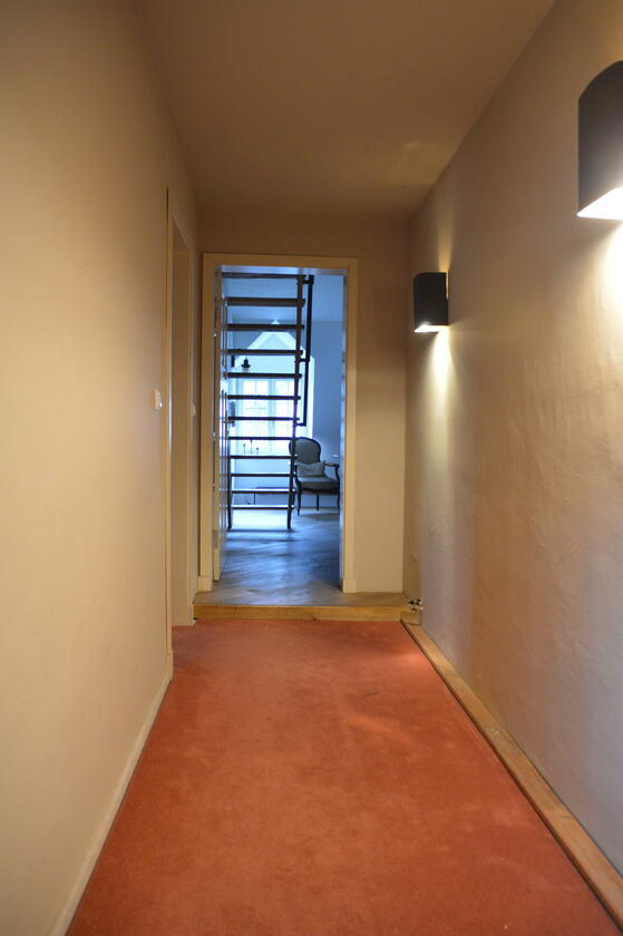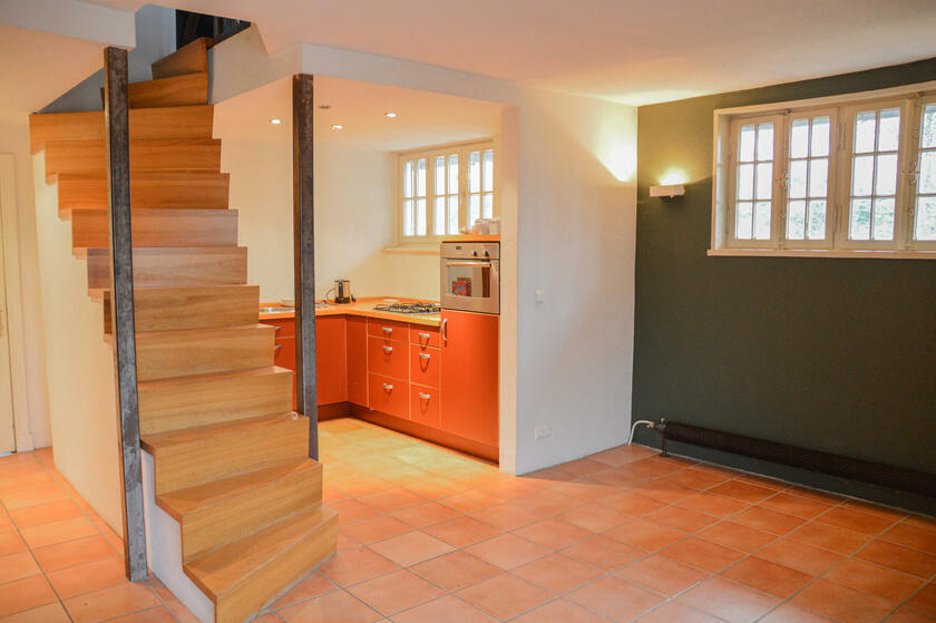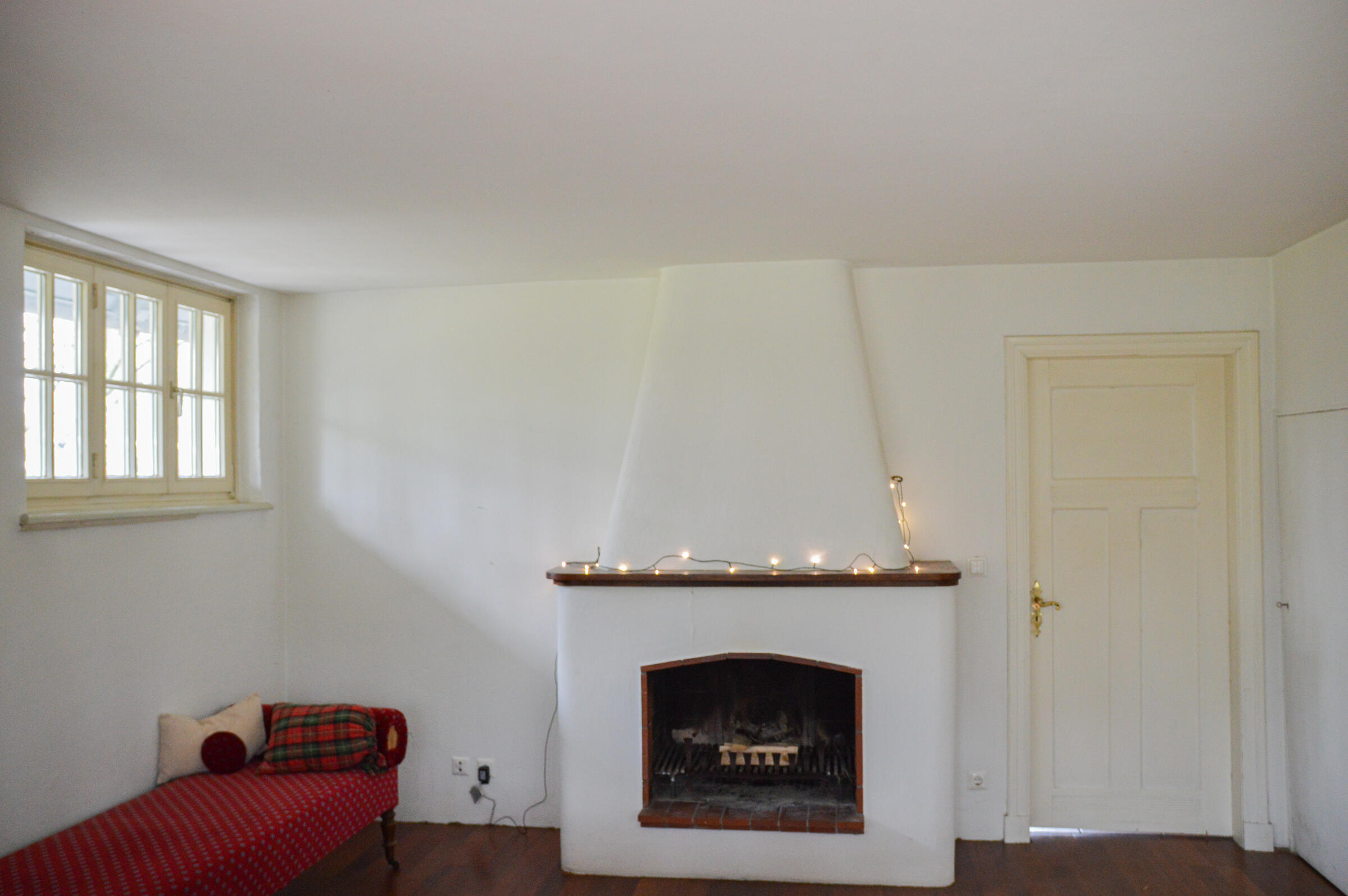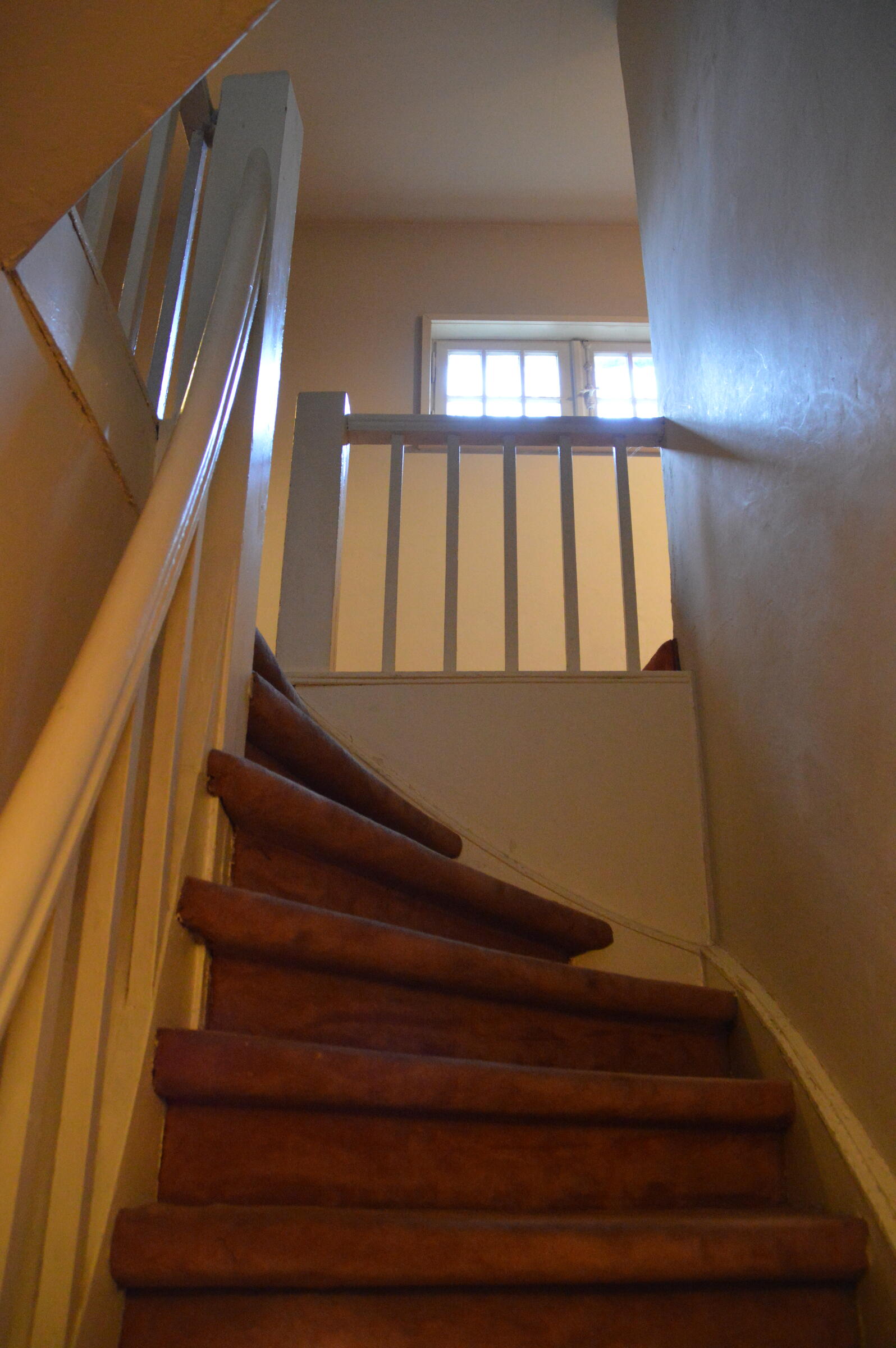 Links ab vom Flur, durch eine Tür gelangt man dann zur alten Holztreppe, die ins 2. OG und zu den beiden Appartements führt. Geradeaus geht es zunächst ins Kaminzimmer. Der echte Holzfußboden und die breite Fensterfront sowie ein alter Kachelofen und ein offener Kamin unterstreichen die Gemütlichkeit dieses Gemeinschaftsraumes. Vom Kaminzimmer ab gelangt man dann in die Suite des Hauses. Hier im EG befindet sich eine kleine, moderne, offene Küche mit allen Annehmlichkeiten einer Küche sowie ein Ess- und Wohnbereich. Die Suite ist in dunkelgrüner, roter und weißer Wandfarbe gestrichen. Der Boden ist gefliest.