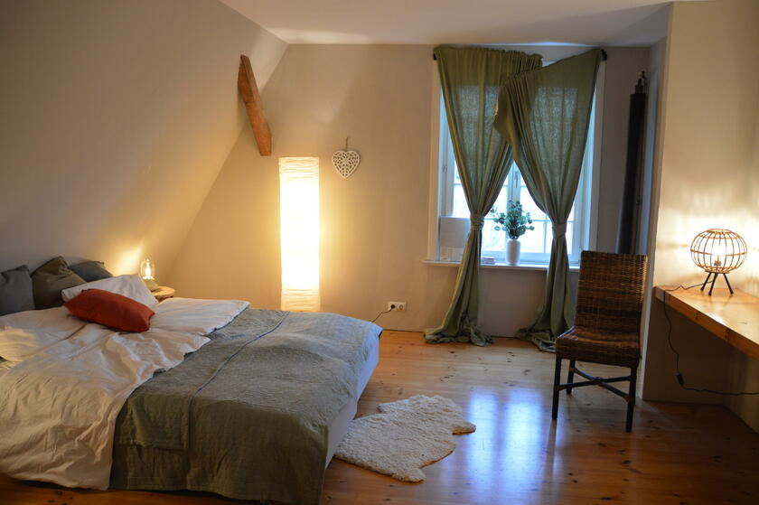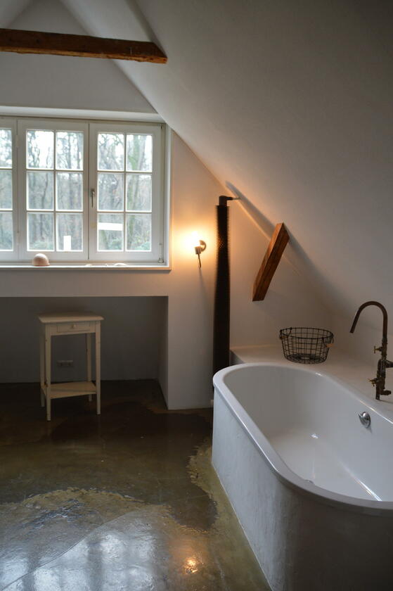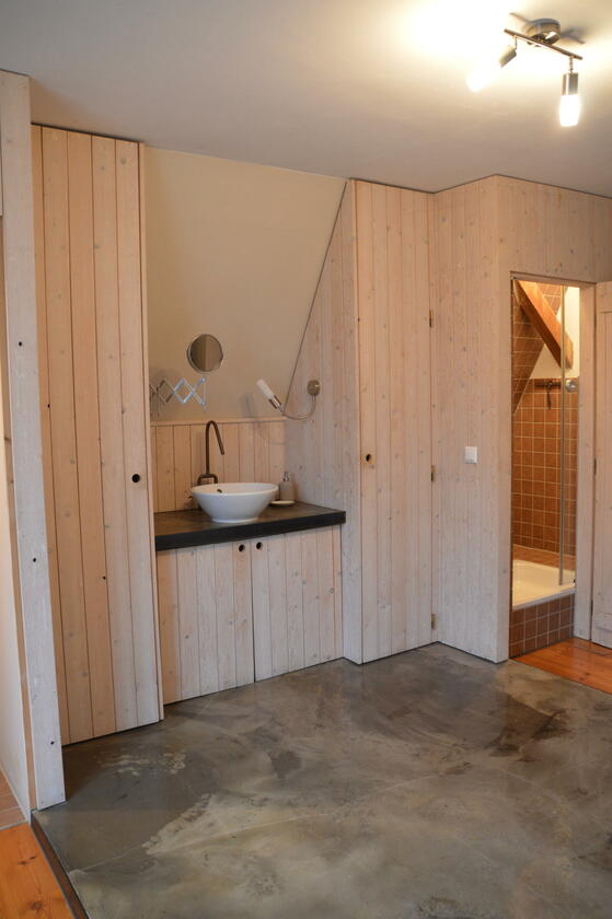 Die offene Treppe inmitten des Raumes führt in den obigen Schlafbereich sowie ins Badezimmer. Das Schlafzimmer ist eher dunkel gestrichen, aber sehr urig und gemütlich; teilweise sogar etwas verwunschen. Das Badezimmer hingegen ist hell und modern. Besonders ist in allen Badezimmern der Bodenbelag: Betonboden mit Epoxidharz aufgegossen. Dazu jeweils helle Holzelemente und schlichter Industrie-Style bei den verschiedenen Amaturen.