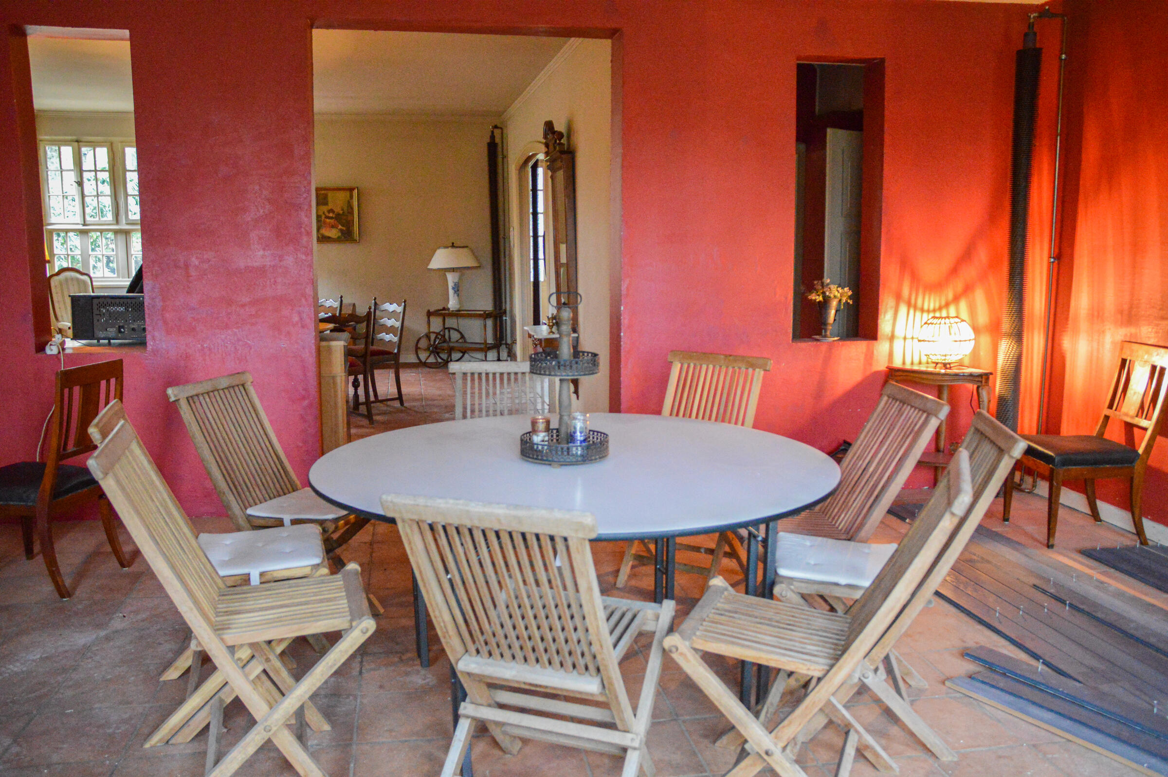 Das Cottage umgibt zwei große Terrassen einmal im vorderen und einmal in hinteren Bereich. Ein großer, parkähnlicher Garten grenzt an sowie eigenes Wald- und Koppelgebiet für unsere Pferde. Der Haupteingang ist von der Sonnenterrasse zu erreichen. Von hier aus gelangen Sie in den Flur. Rechts ab, durch einen Torbogen befindet sich dann der Saal mit angrenzender, großzügiger Event- bzw. Gemeinschaftsküche. Im hinteren Teil der Gemeinschaftsküche gibt es zwei kleinere Vorratsräume, die für Requisite o.ä. genutzt werden können. Vom Saal sowie von der Küche aus gelangen Sie auch jeweils nach draußen. Der Saal ist dunkelrot gestrichen, es ist ein Kamin vorhanden, die Lichtverhältnisse sind schummerig. Hier befindet sich ein altes Klavier sowie verschiedene, antike Möbelstücke. Der Saal ist nicht überladen und kann auch schnell geräumt werden.