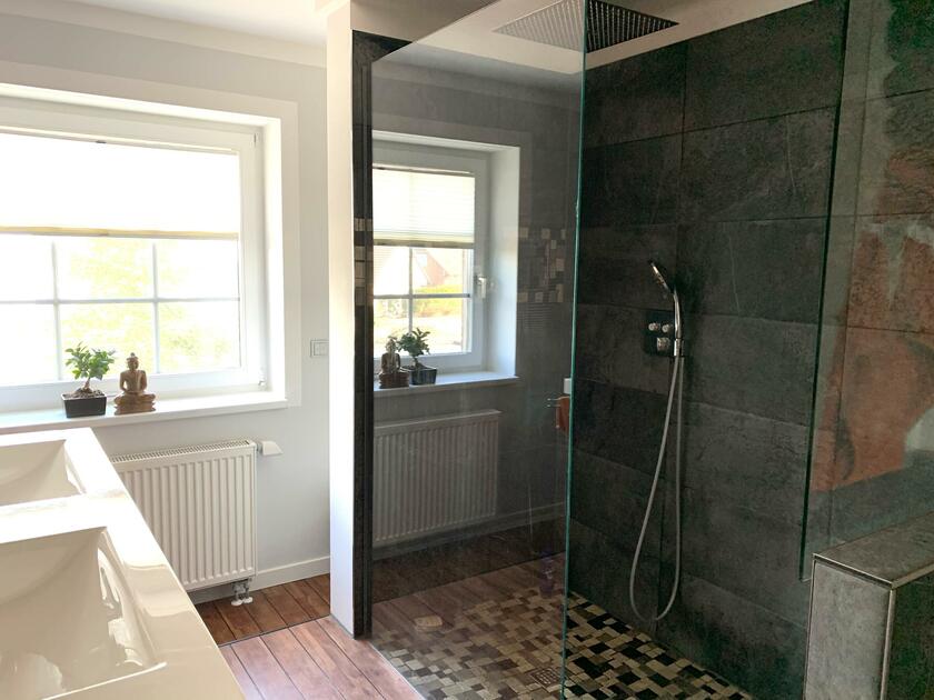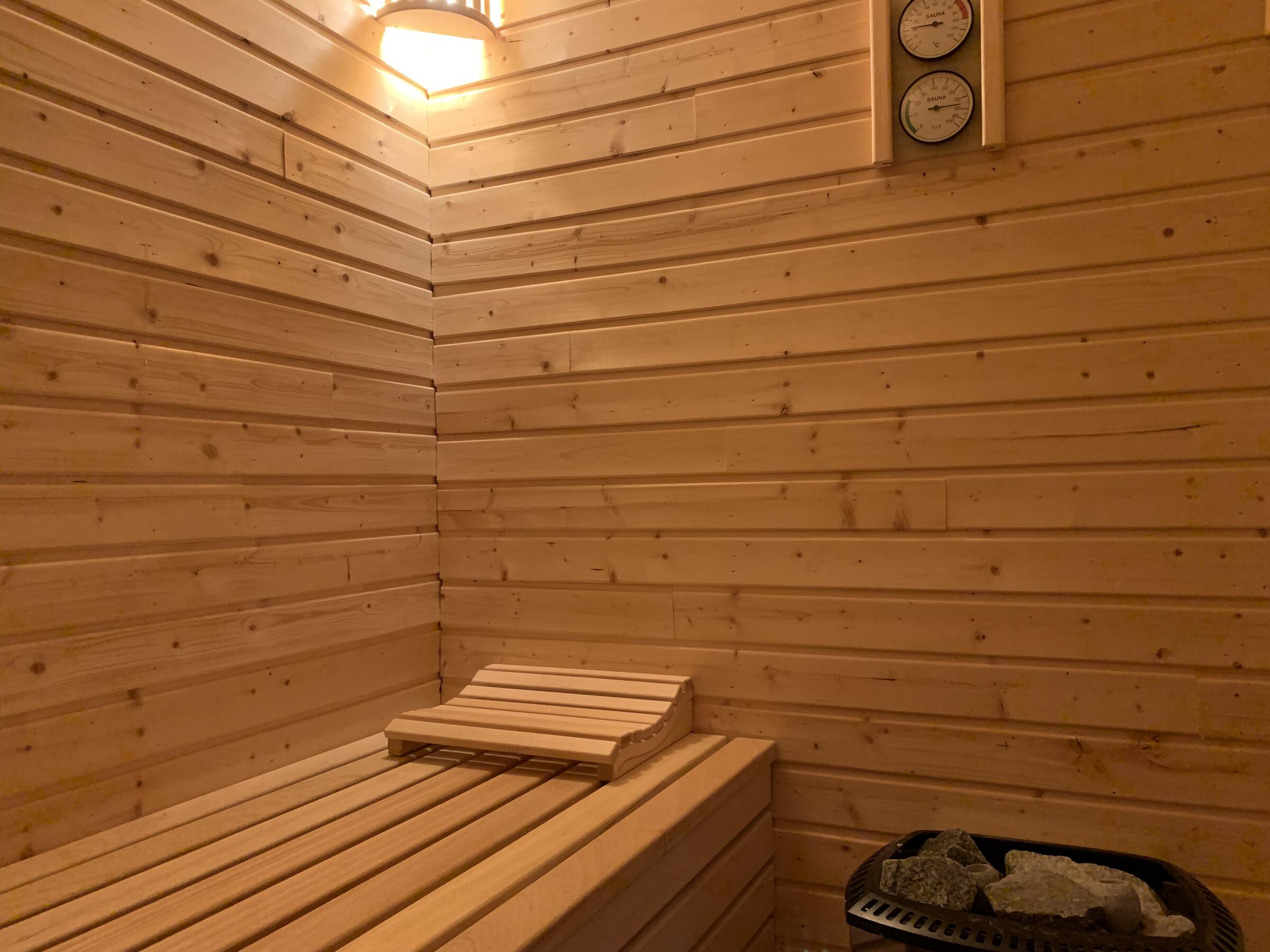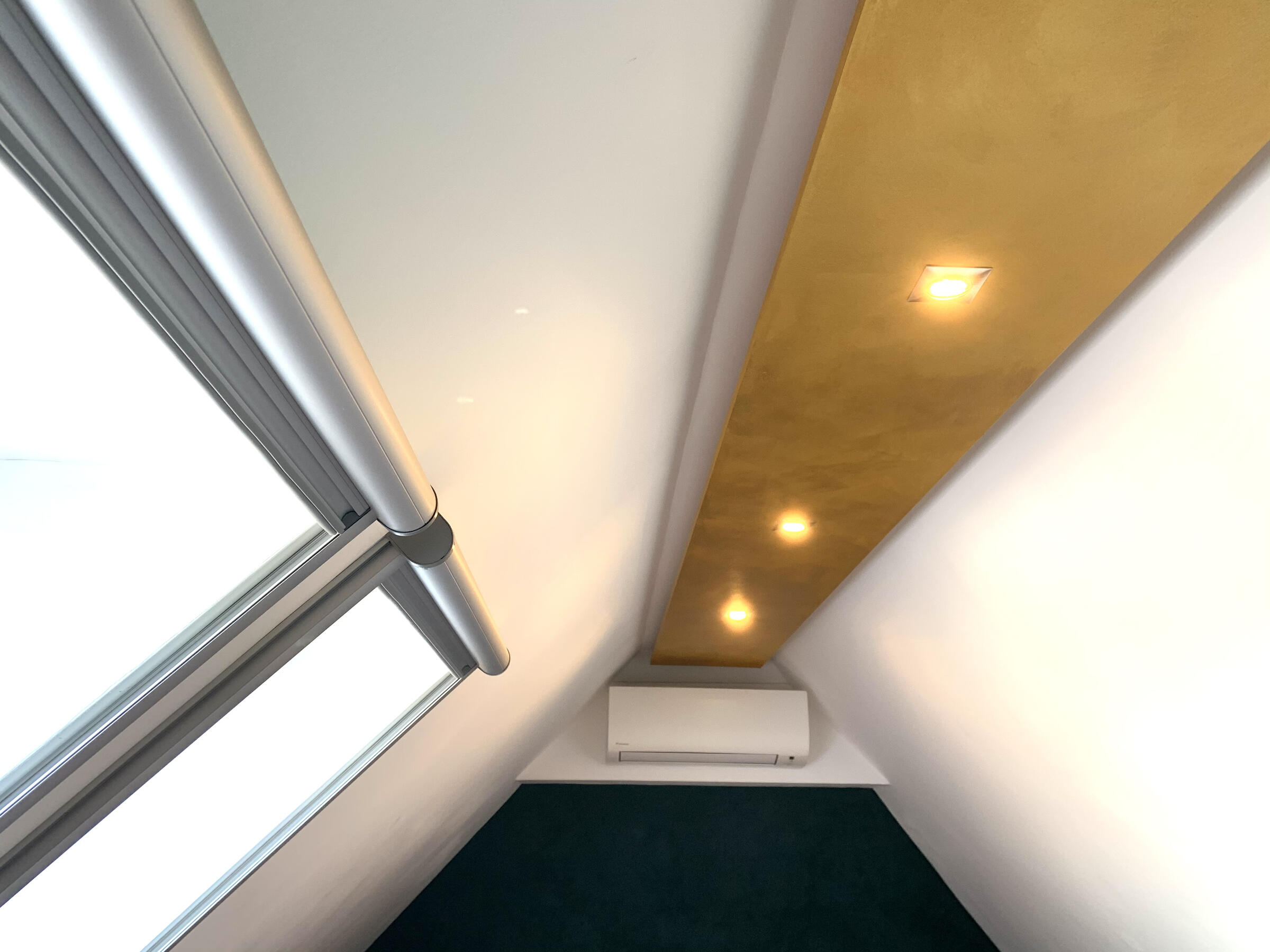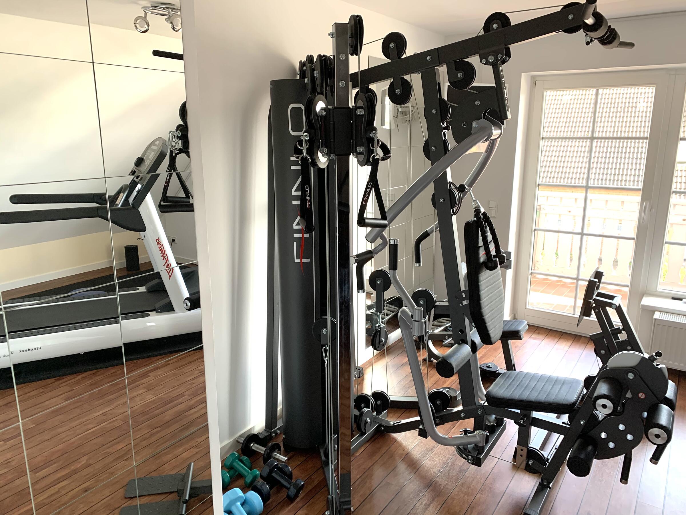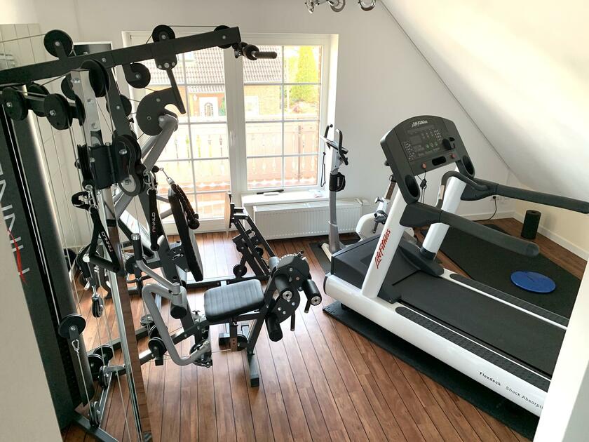 Das Haus ist komplett alarmgesichert mit Außenalarm und Kameras im Außenbereich. Zur exklusiven Ausstattung gehören ein komplett ausgestattetes Fitness-Studio, eine Sauna mit Saunaofen, ein Ruhe- und Wellnessbereich und ein großer und außergewöhnlicher Schlafbereich im Dachgeschoß. Wir besitzen ein großes Wohn- und Esszimmer, welches durch einen Raumteiler mit Kamin unterteilt ist. Die offene Küche ist modern und grenzt an den Essbereich an.