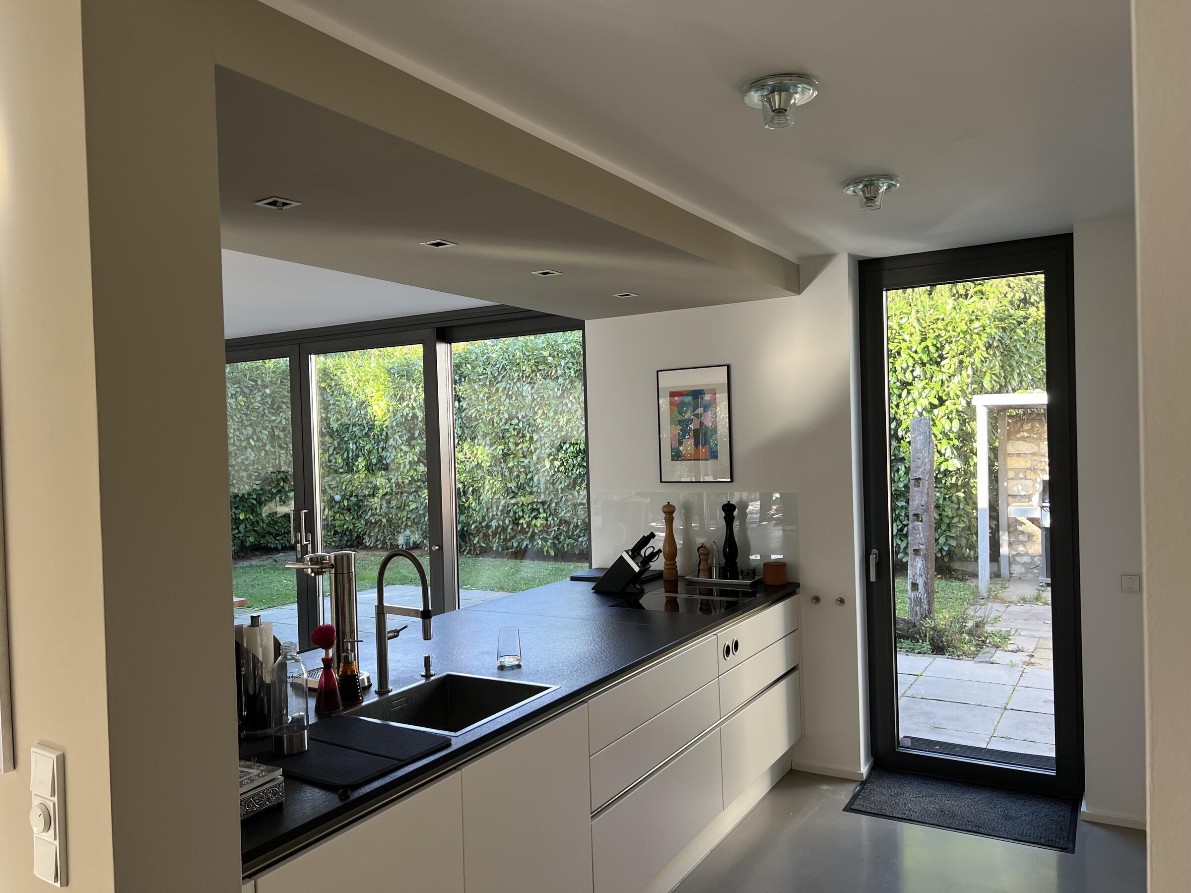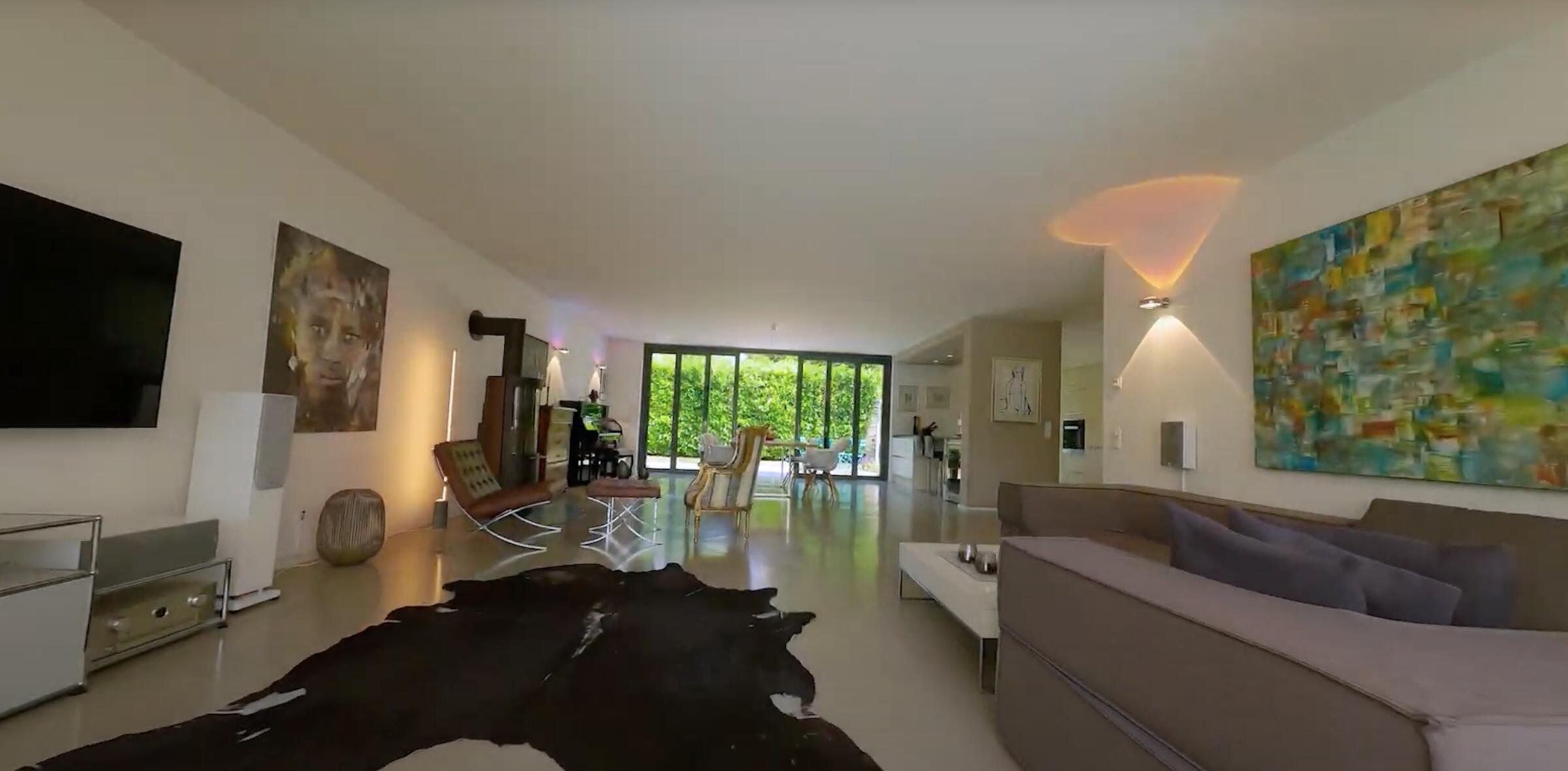 Große bodentiefe Fensterfronten sorgen für optimale Lichtverhältnisse in den Wohnräumen, die mit Designklassikern und antiken Möbeln eine ästhetisch ansprechende Kulisse bieten. Der offene Wohn- und Essbereich mit Ofen und Klavier sowie einer modernen Wohnküche bietet viel Platz und Stil für Innenaufnahmen. Der fließende Übergang vom Wohnbereich zur Terrasse und zum Garten ermöglicht reibungslose Kamerabewegungen und dynamische Außenaufnahmen.