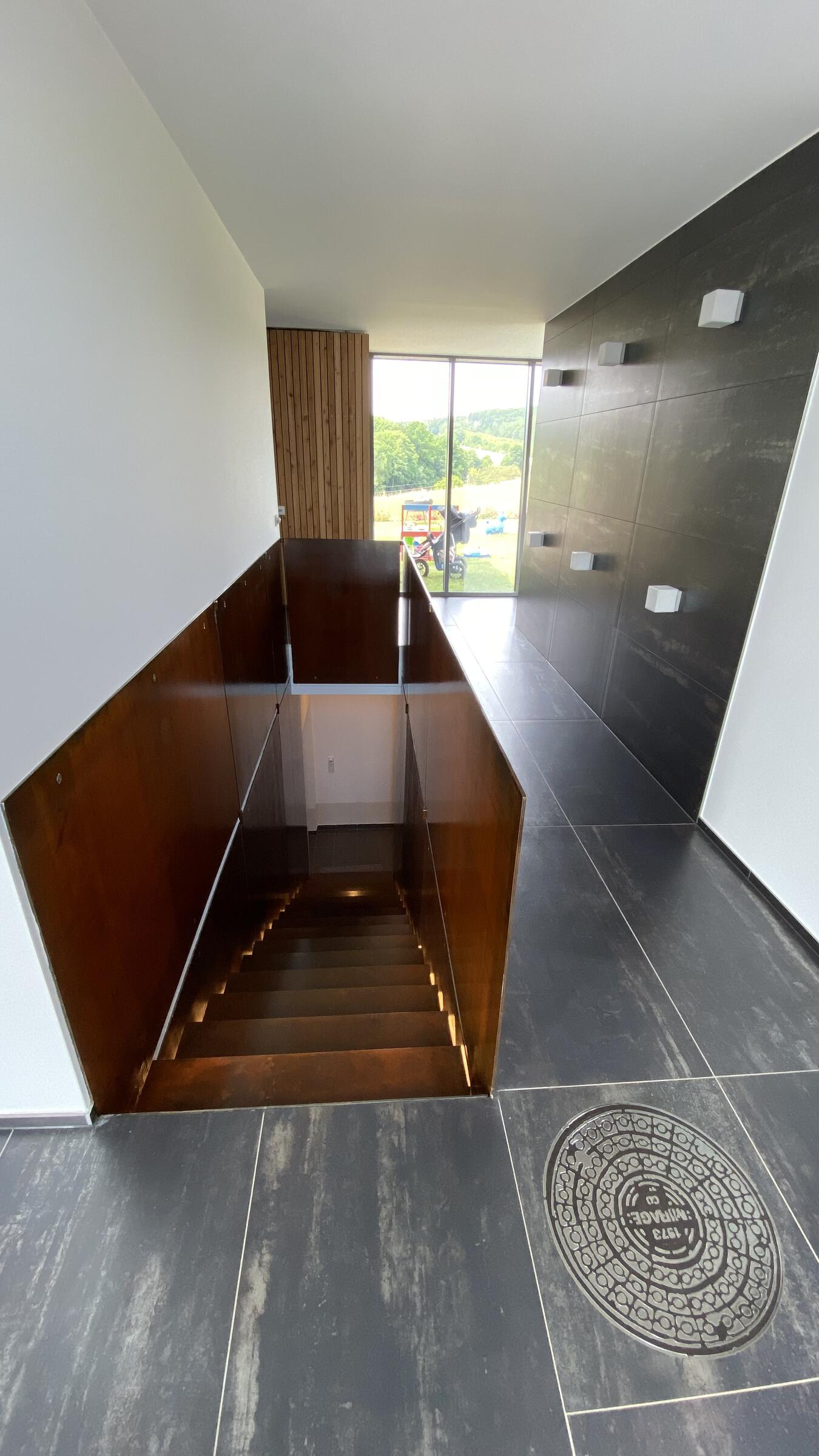 Unser Einfamilienhaus "Straight View" steht für moderne, gradlinige Architektur mit einem starken Bezug zum Außenraum. Ein konstruktives Highlight stellt der 4,5 m auskragende Wohnbereich dar. Eine Vorhangfassade aus anthrazitfarbenen Eternit®-Platten für den öffentlichen Wohnbereich, ein weißes Wärmedämmverbundsystem mit grauen Farbakzenten für den privaten Wohnbereich und eine senkrechte Holzverschalung aus Lärchenholz an der »Creativ Box« gliedern das Haus. Dank der modernen Haustechnik ist das Haus unabhängig von Strom und fossilen Brennstoffen. Eine tolle und moderne Kulisse.