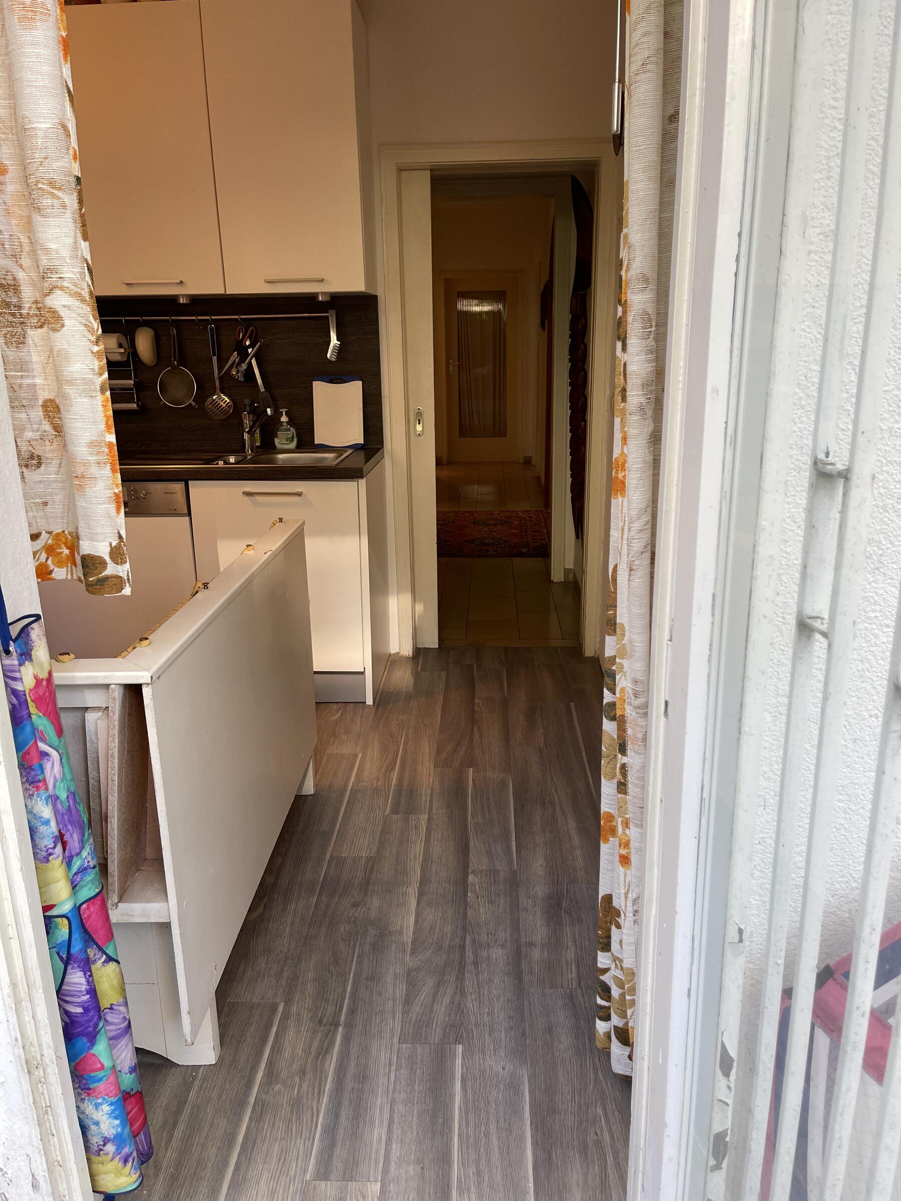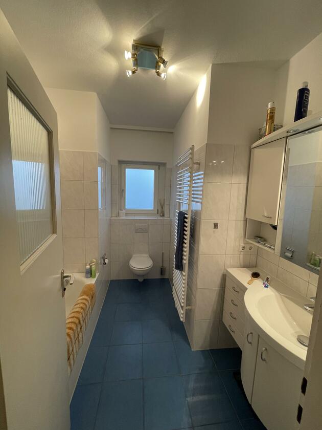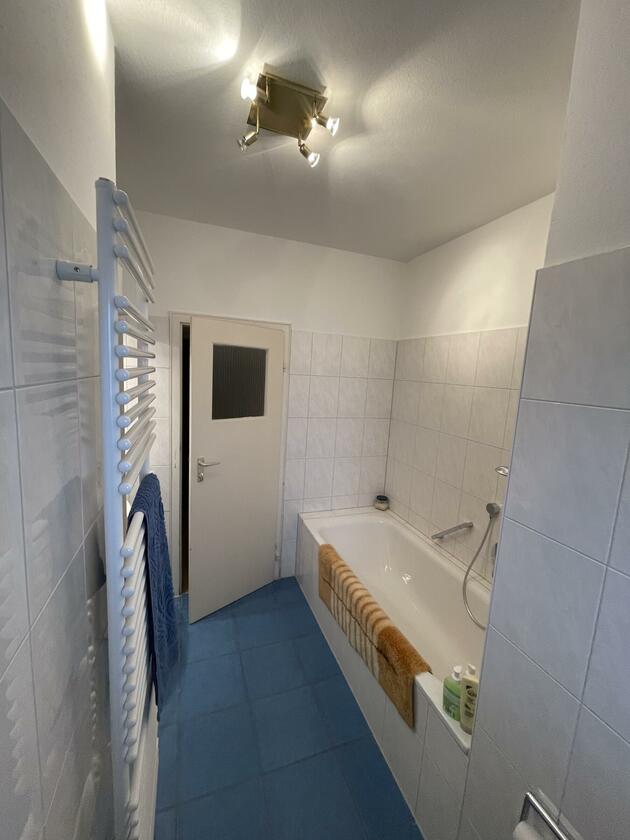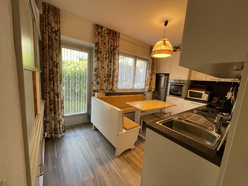 The ground floor apartment has a separate entrance which is accessible from the courtyard. Near the entrance is a small guest bathroom. On the left, at the end of the corridor, are 2 bedrooms and a renovated full bathroom with a bathtub. One bedroom contains a double bed and the larger room featuring a double bed and a pullout sofa. On the other side of the corridor is a renovated eat- in kitchen which leads to the manicured backyard. This is very convenient for parties or grill evenings outside.
