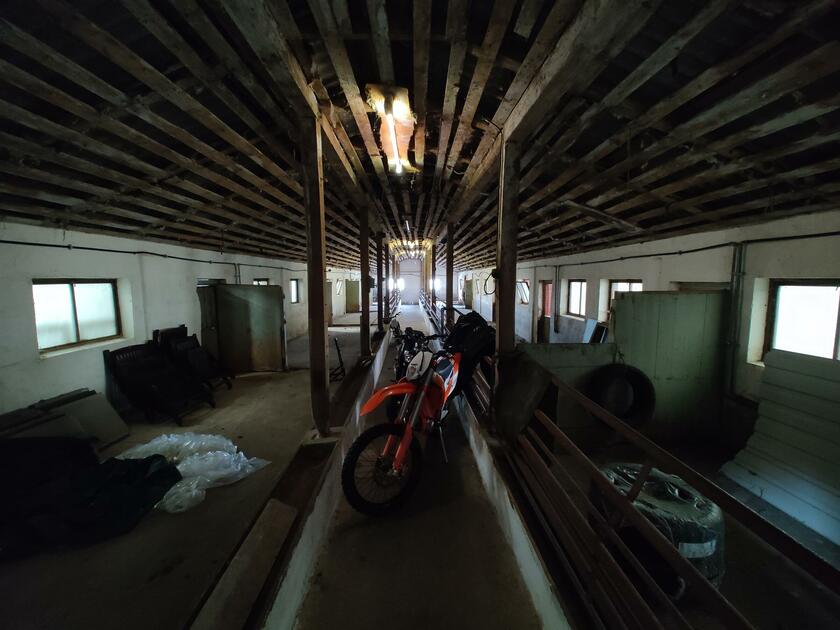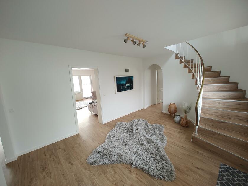 Das komplett neu renovierte Wohnhaus auf dem Bauernhof verfügt über ein großes Wohnzimmer, ein großes Esszimmer mit Küchendurchgang, moderne Holzmöbel, Sauna, Tiefgarage und eine große moderne Küche. Die Wände sind mit Pferdefotografien und Gemälden geschmückt. Das Haus ist von einem großen Garten umgeben, der von hohen Bäumen und Sträuchern gesäumt ist und einen atemberaubenden Blick auf die Landschaft bietet.