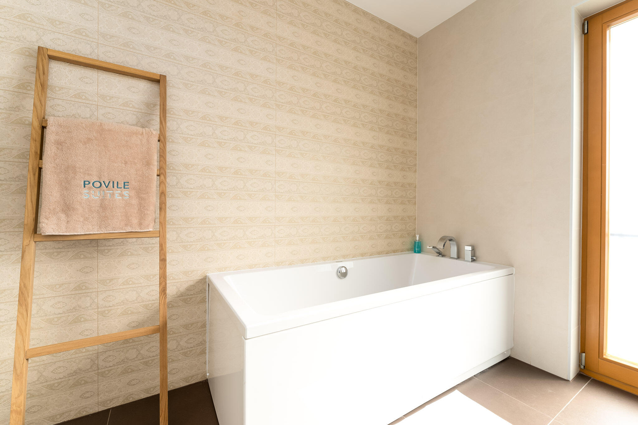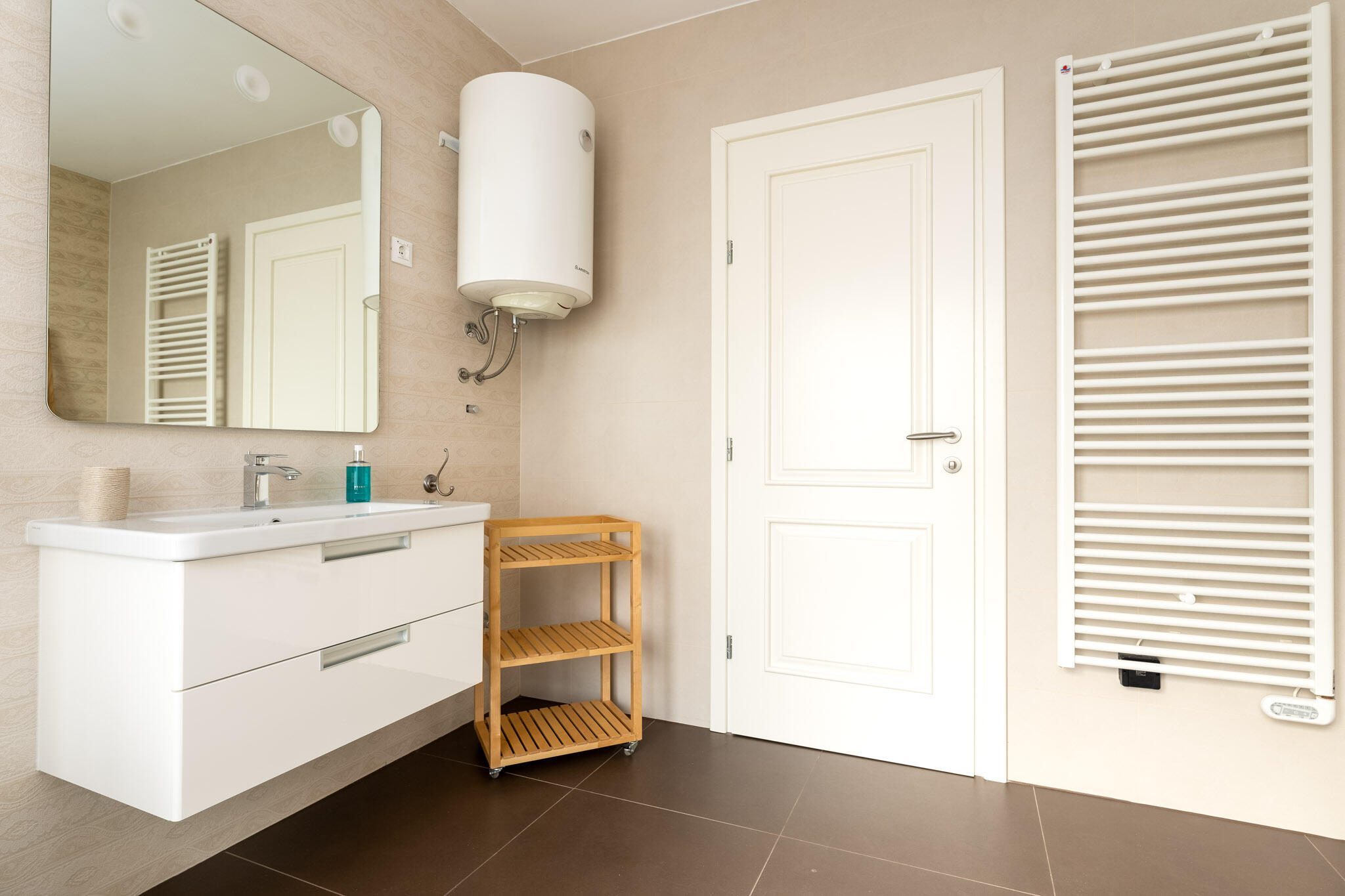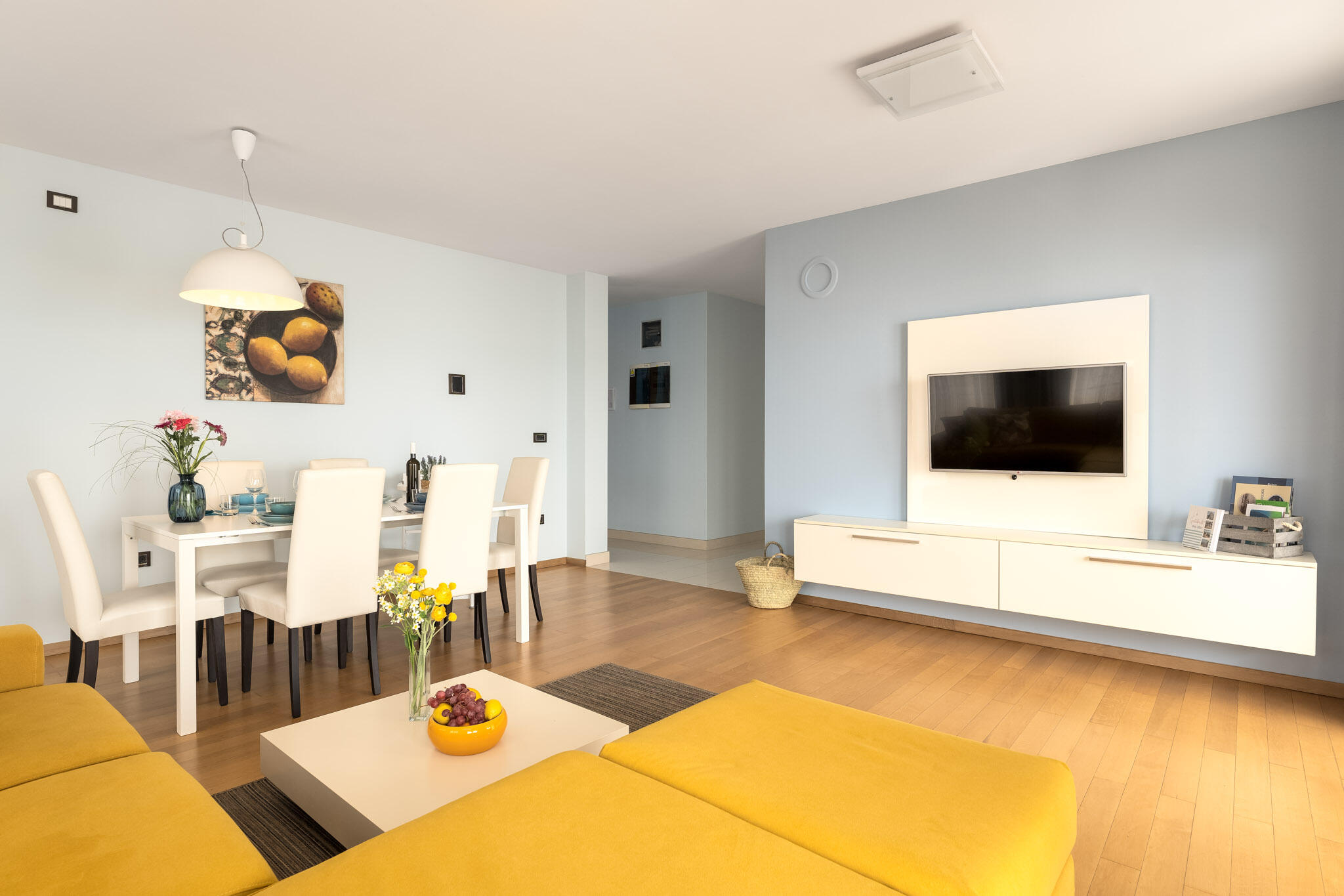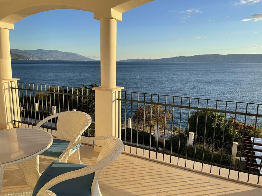 Die helle Ferienwohnung befindet sich im 1. Obergeschoss eines zweistöckigen Hauses. Alle Räume sind vollständig möbliert. Neben einem großen Wohn- und Esszimmer und einer Küche stehen 2 separate Schlafzimmer, 2 Bäder en Suite, ein Gäste-WC und ein großzügiger Eingangsbereich zur Verfügung. Die bodentiefen Fenster im lichtdurchfluteten Wohnzimmer und den Schlafzimmern können mit Vorhängen oder elektronischen Rollläden abgedunkelt werden. Vom großzügigen Balkon hat man einen unverbauten Blick auf das Meer. Dazwischen befindet sich ein Swimmingpool in einer gepflegten Gartenanlage. Zum Lagern von Equipment kann ein ca. 50 m² großer Kellerraum genutzt werden. Vor dem Wohnhaus stehen 5 Pkw-Stellplätze zur Verfügung. Auf Wunsch können auch die Wohnungen im Erdgeschoss und 2. OG angemietet werden.