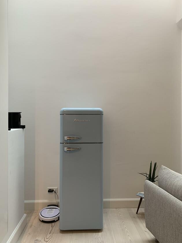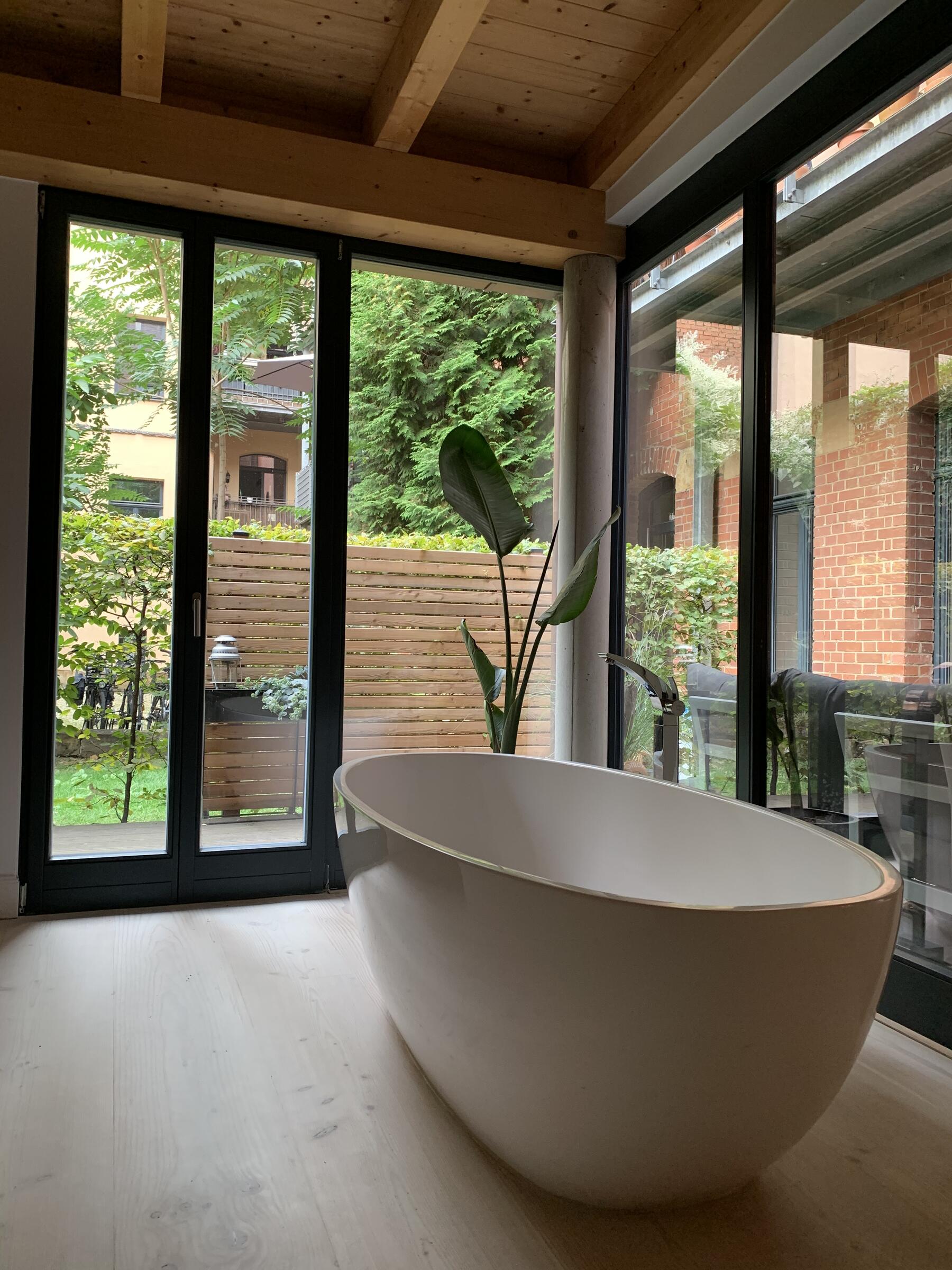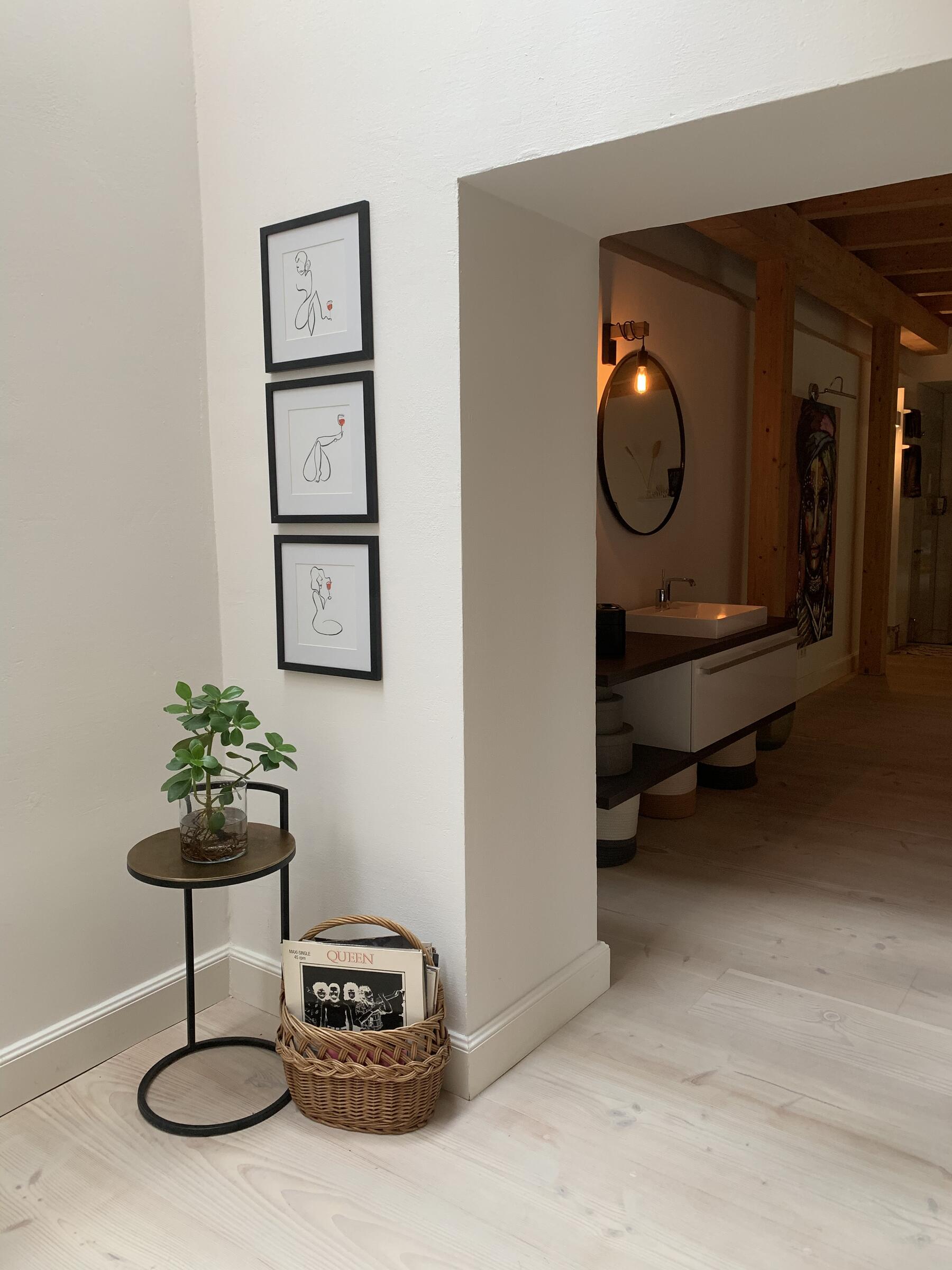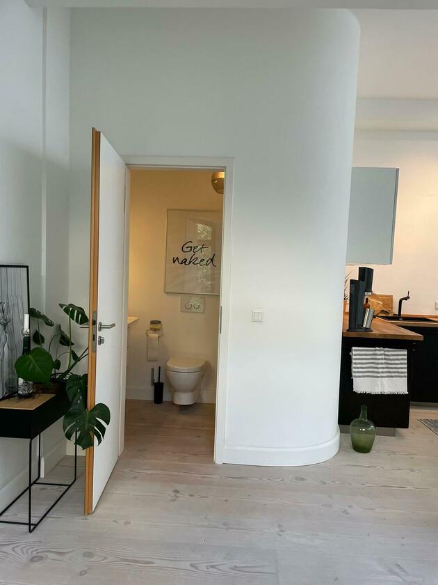 Meine lichtdurchflutete Architektenwohnung mit minimalistischer Einrichtung und besonderer Aufteilung hat eine Fläche von ca. 80 m². Im Schlafzimmer ist eine freistehende Badewanne vor einer großen Glasfront platziert. Auch die Regendusche ist in das Schlafzimmer integriert. Die Wohnung hat, außer zum WC, keine Türen. Mit bis zu 5 m hohen Decken und einem Holzanbau mit wunderschönen Balken wirkt alles offen und leicht. In der gesamten Wohnung ist ein Echtholzparkett (Norwegische Eiche, geweißt) verlegt. Zur Wohnung gehört ebenfalls eine Terrasse mit verschiedenen Pflanzen und einer Lounge.
