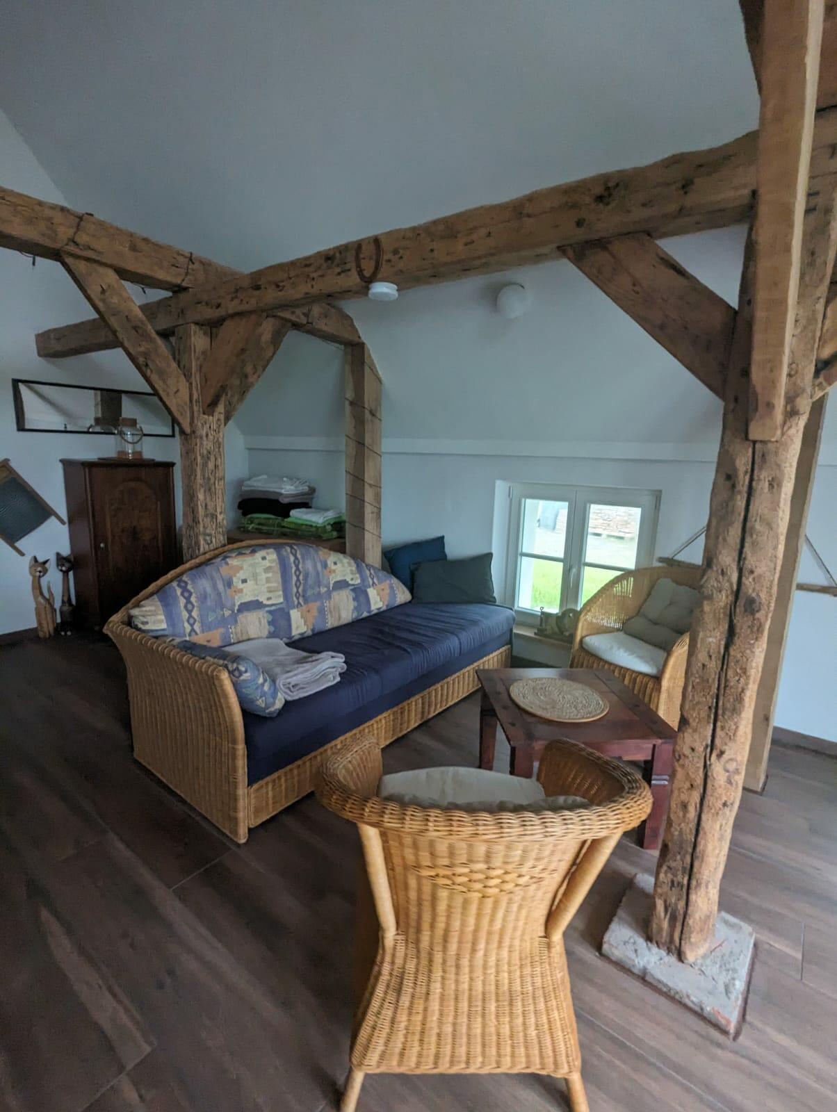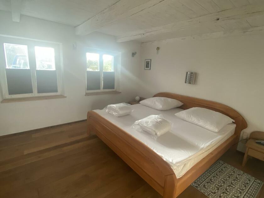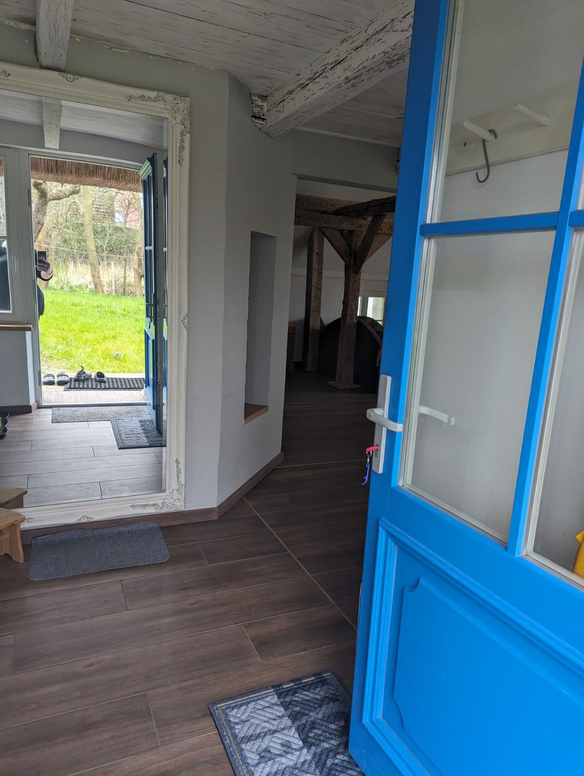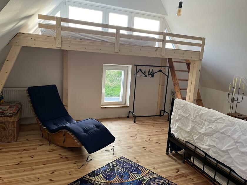 Wir haben das im Jahr 1888 erbaute Bauernhaus kernsaniert und zu einem Ferienhaus umgewandelt. Die Räume sind vollständig möbliert. Der lichtdurchflutete Wohn- und Essbereich ist offen gestaltet und bietet direkten Zugang zur Wohnküche. Im Wohnbereich befindet sich auch ein Kamin. Das Badezimmer im Erdgeschoss ist mit einer Whirlpool-Badewanne und Dusche ausgestattet. Das Obergeschoss bietet eine offene Empore und ein Dachstudio. Die Fenster sind teilweise mit Plissees ausgestattet. Im Außenbereich steht ebenfalls ein großes und eingezäuntes Wiesengrundstück zur Verfügung.