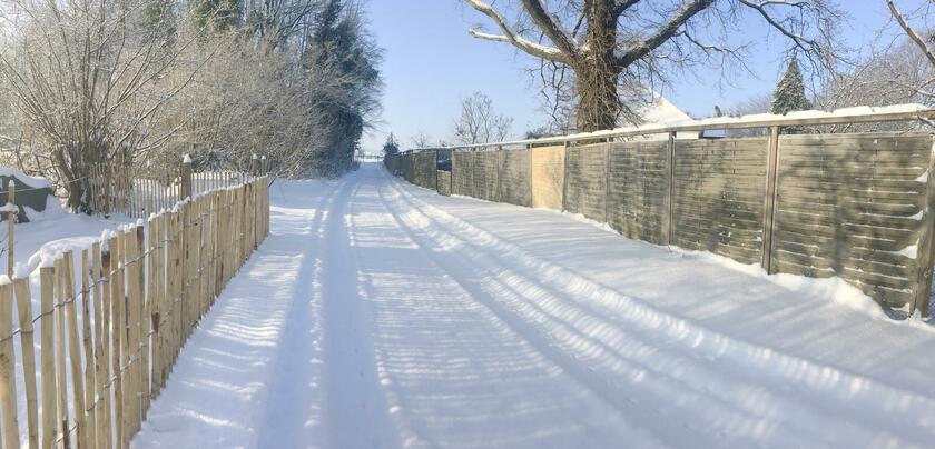 Die Zufahrt erfolgt über eine Auffahrt per Privatweg am Rande eines kleinen Waldstückes. Über die nahegelegene B65 und A2 ist das zwischen Hannover und Bielefeld gelegene Objekt gut erreichbar. Die private Zufahrt führt auf den zentral vor Haupthaus und Nebengebäude gelegenen Hof, der auch als Parkplatz und Wendemöglichkeit am Objekt dient. Im Zufahrtsbereich und auf dem Hof haben problemlos mehrere PKW Platz, daneben gibt es in Fußweite erreichbare Parkmöglichkeiten an der Weide als sichere Parkmöglichkeit außerhalb des Grundstücks. Die Auffahrt ist für LKW bis 12 t befahrbar. Das abschließbare Nebengebäude bietet Platz für die Unterbringung von Requisiten auch über Nacht.