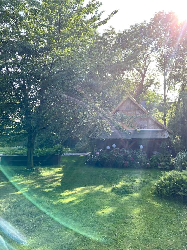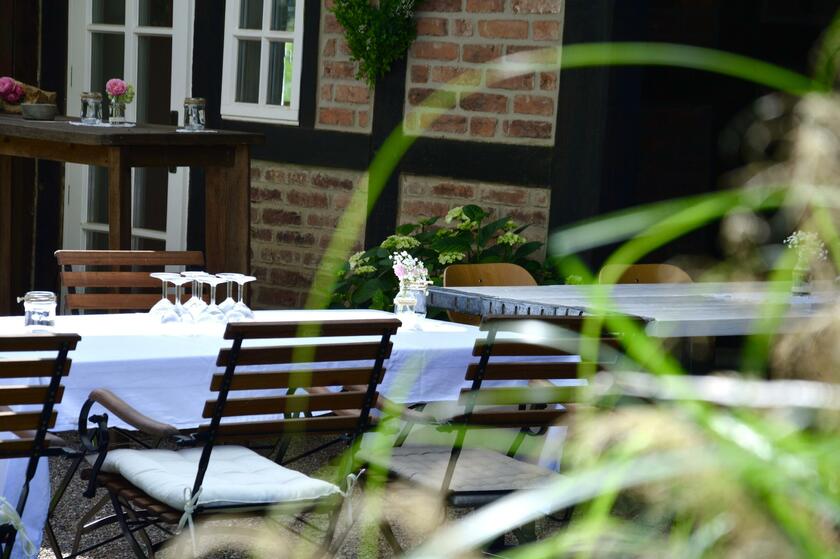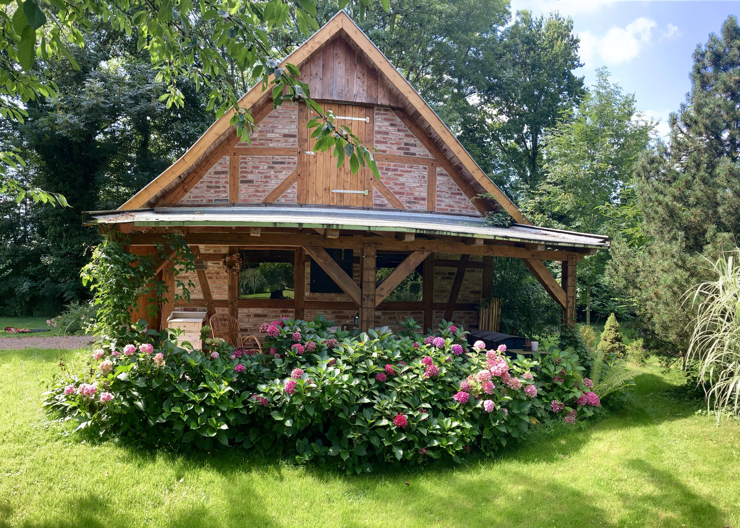 Neben dem Haupthaus befindet sich auf dem Grundstück ein Fachwerk-Nebengebäude mit überdachter und von bunt blühenden Hortensien eingewachsener Terrasse. Mit seinem großen Holztor bietet sich das von innen nicht ausgebaute Nebengebäude insbesondere für Außenaufnahmen an. Nach Absprache kann auch der großzügige, ebenerdige Innenraum genutzt werden, der je nach Gestaltung als Verkaufsraum, Atelier oder Hobbyraum dienen kann.