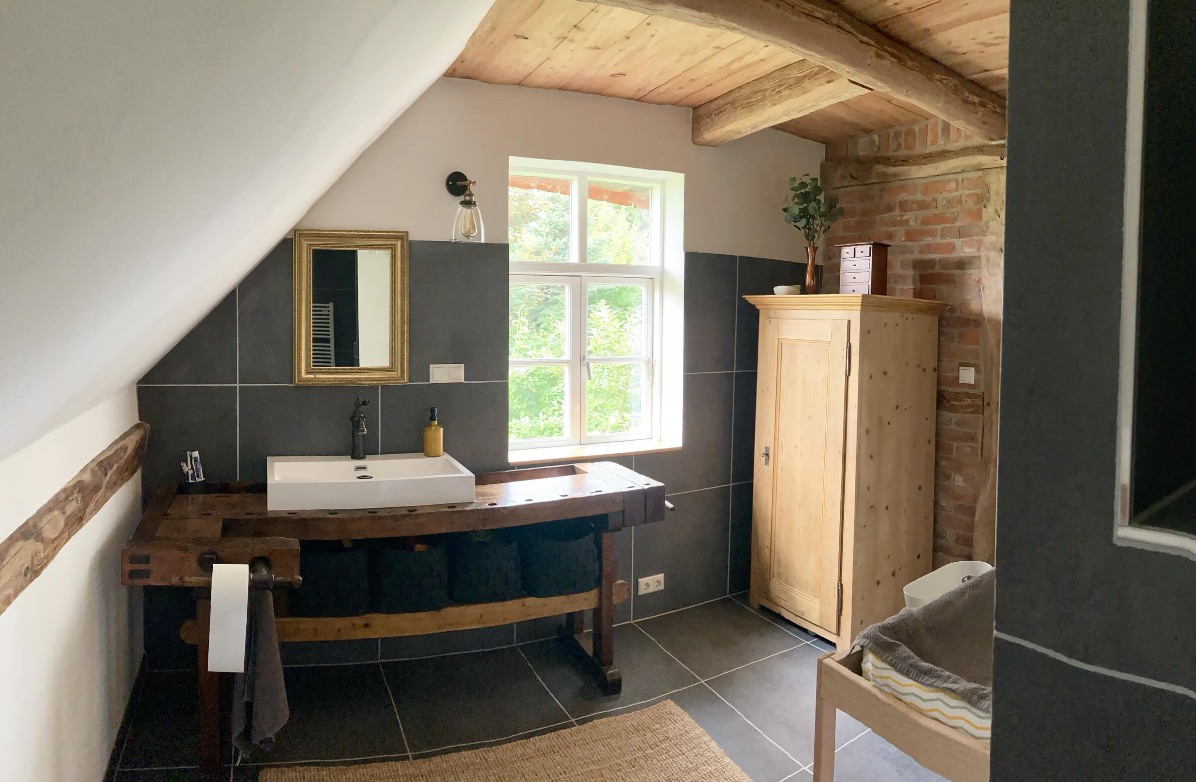 In den Räumlichkeiten jenseits der Diele wurde im Zuge der ökologischen Sanierung mit Lehm der Charakter des Hauses (teilweise offene Balken, Holzdecken, vereinzelte Klinkerwände) aufrechterhalten und durch neue Echtholz-Dielenböden und verputzte Lehmwände hell und freundlich ergänzt. Ein kleines Bad im EG des Haupthauses kann während der Aufnahmezeit als Sanitärraum vor Ort genutzt werden.