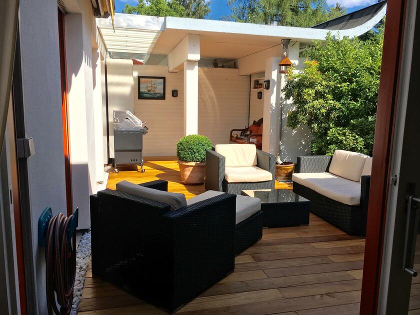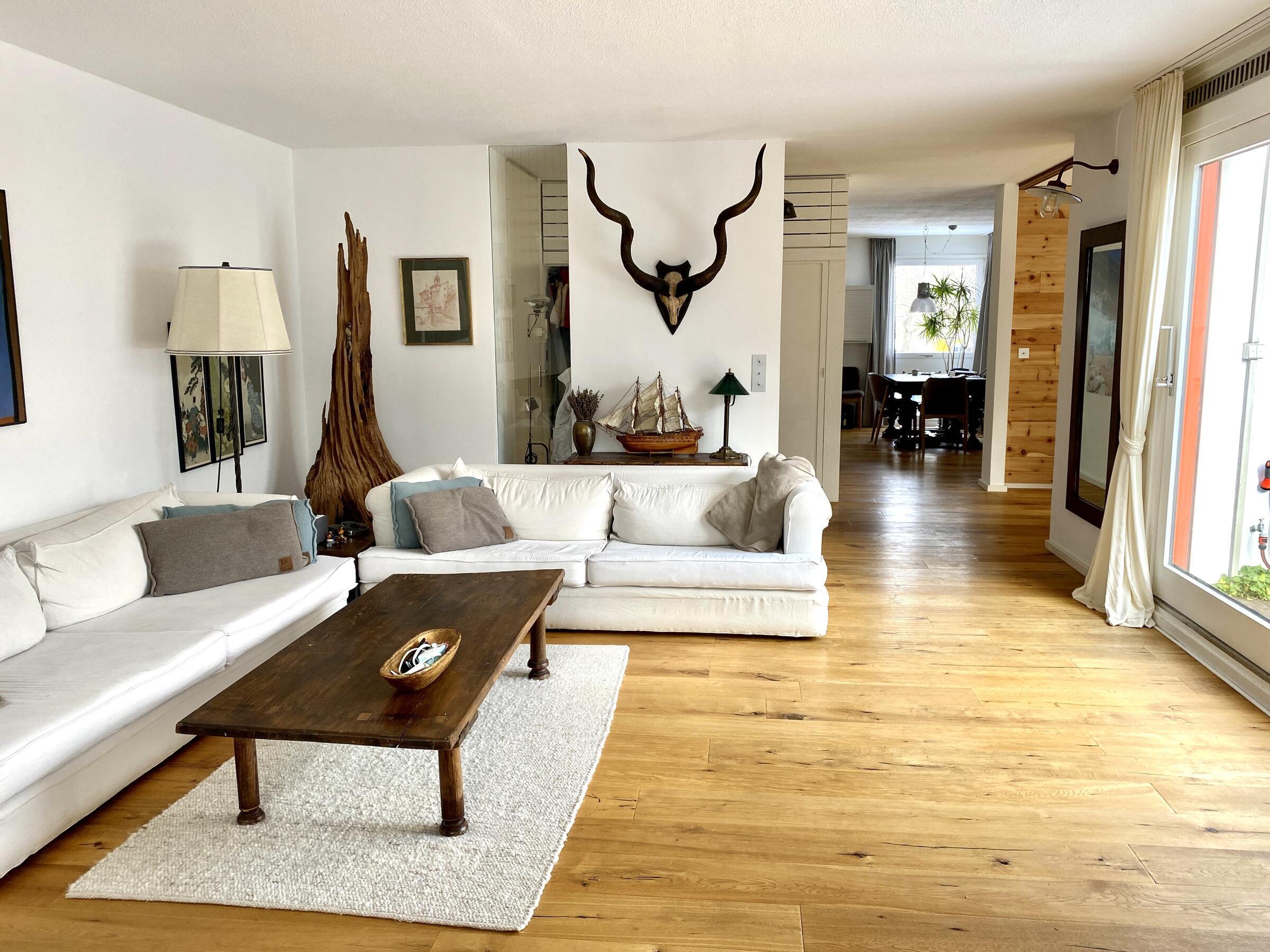 Unsere Wohnung ist im Jahr 1969 erbaut worden und mittlerweile dank ihrem raffinierten Baustil sogar denkmalgeschützt. Die Wohnung ist voll eingerichtet und die Möbel lassen sich bei Bedarf auch gut verschieben. Die Besonderheit an der Wohnung ist ganz bestimmt das großzügige, helle Wohnzimmer mit sowie die große und nicht einsehbare bepflanzte Terrasse, die teilweise sogar überdacht ist. Einzigartig ist auch, dass man auf einer Ebene von drei Zimmern Zugang zur Terrasse hat. Durch die Lage und den Sonnenverlauf ist die Wohnung sehr hell und lichtdurchflutet. Die Anlage selbst ist in ein parkähnliches Umfeld eingebettet, mit zahlreichen Grünflächen und altem Baumbestand. Parkplätze findet man immer direkt vor der Haustüre.