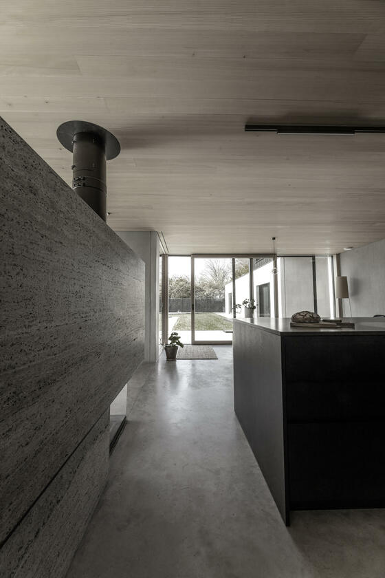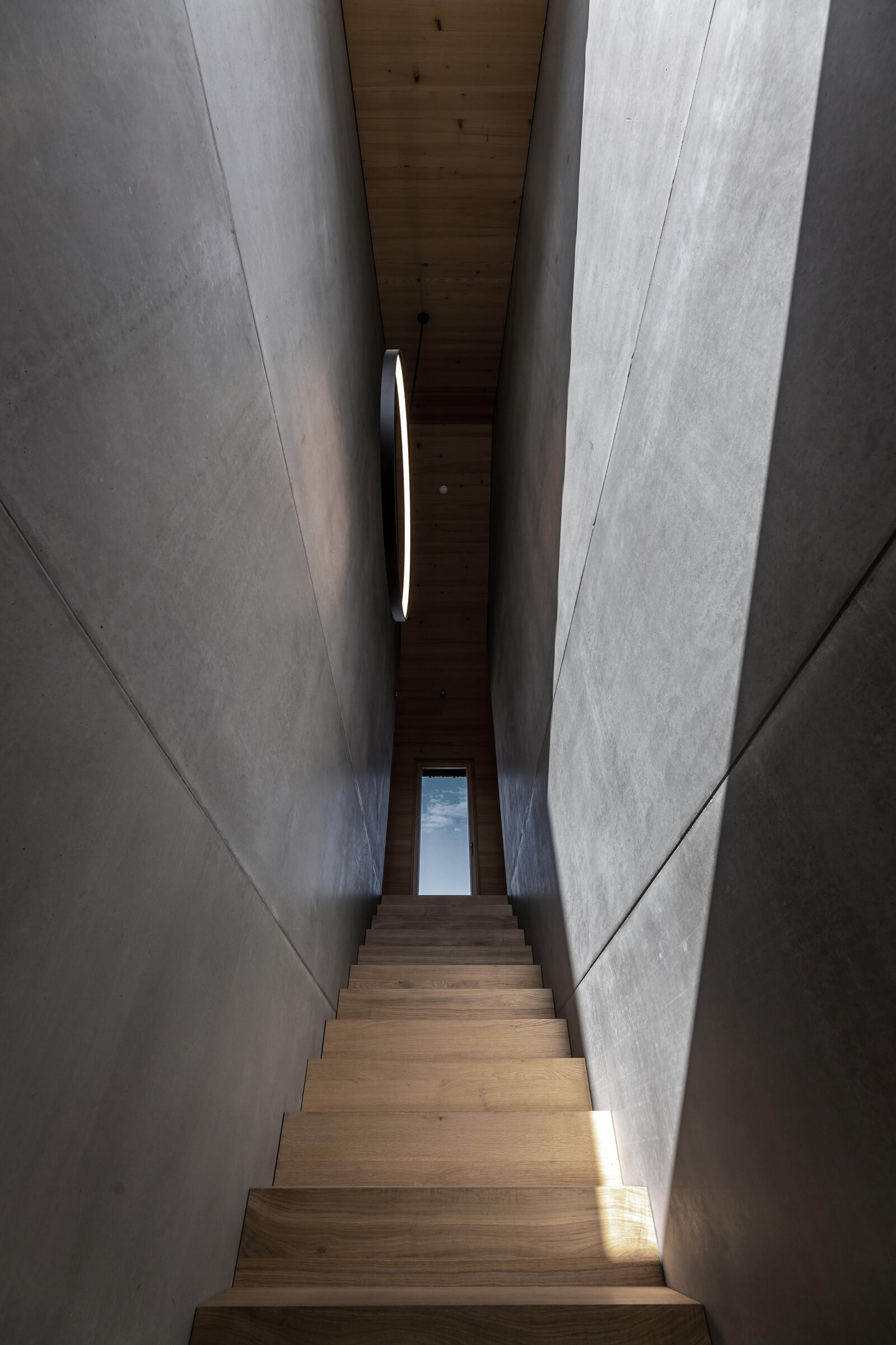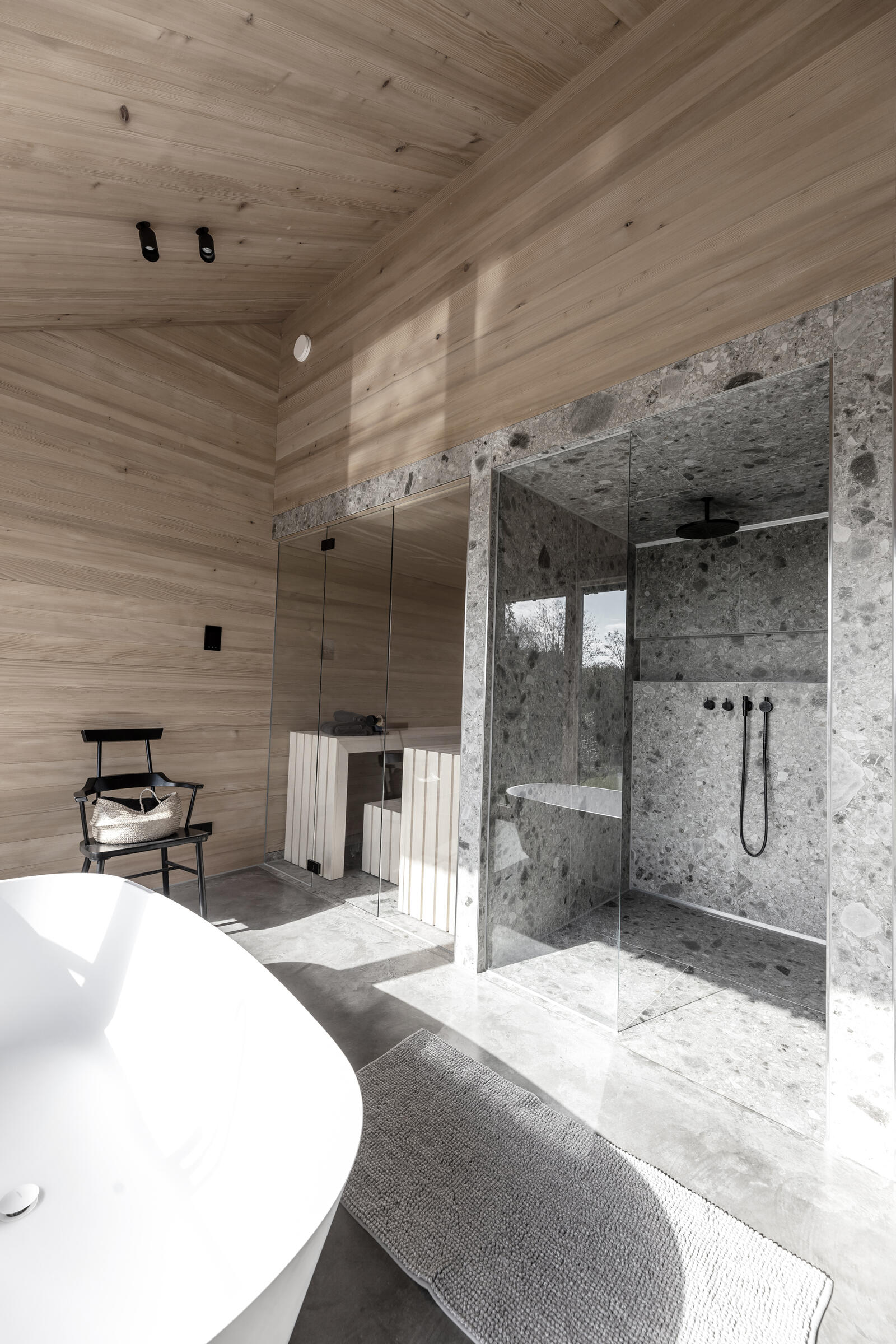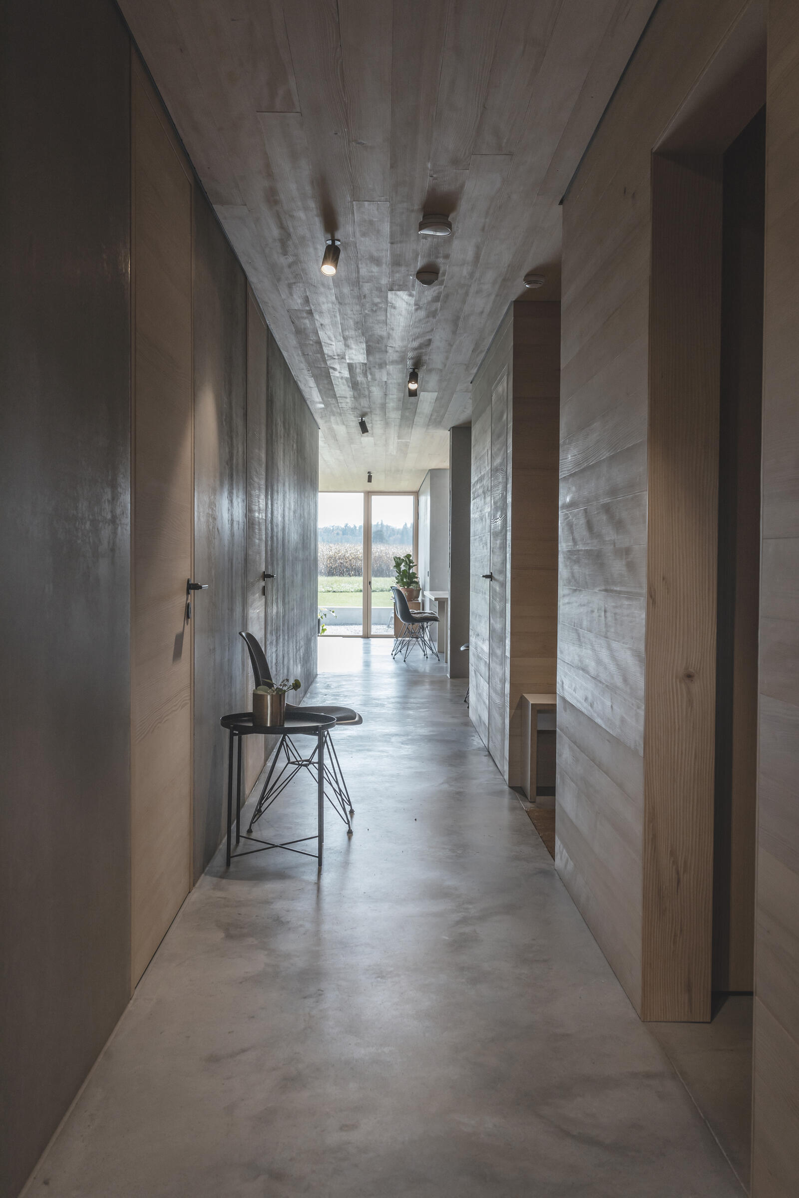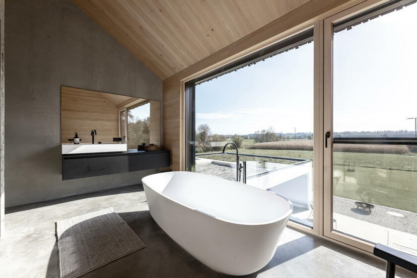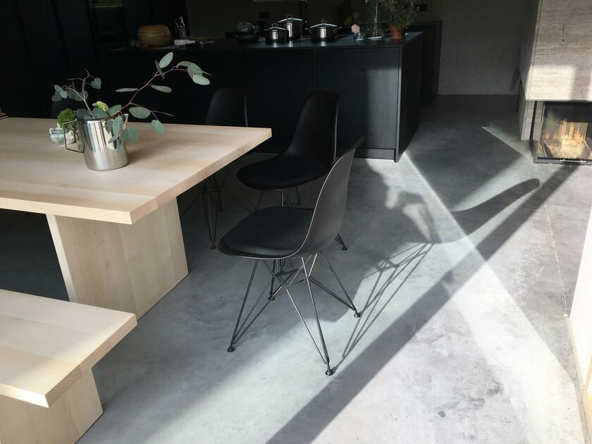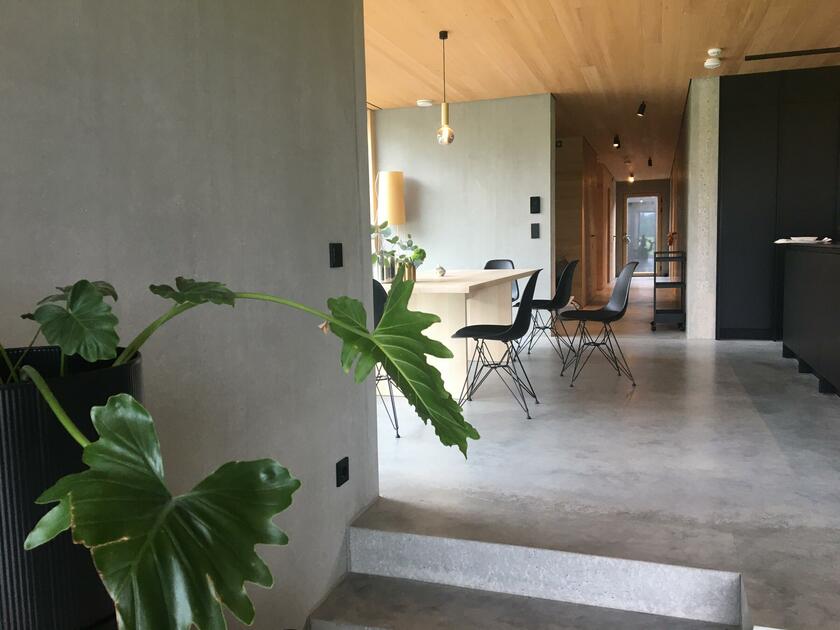 Innen zeichnet sich das Haus durch eine sehr schlichte, aber exquisite Materialauswahl aus: Weißtanne kombiniert mit Sichtbeton und Naturstein, Einbauten in Weißtanne und heller Eiche, schwarze Küche aus Eiche und Naturstein, Badeinbauten und Armaturen aus schwarzem Edelstahl, Mineralguss. Die Farbigkeit ist auf helle Holztöne, schwarz als Kontrast und grau reduziert. Das Beleuchtungskonzept setzt die ausgewählten Designmöbel gekonnt in Szene und ist ebenfalls von einem renommierten Designleuchtenhersteller. Durch die reduzierte Möblierung, die reduzierten Farben und den tollen Lichteinfall eignet sich das Anwesen perfekt für Shootings oder Drehs aller Art, da es die perfekte Bühne für vielfältige Szenen bietet.