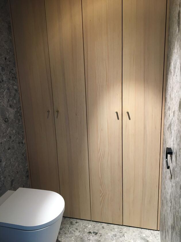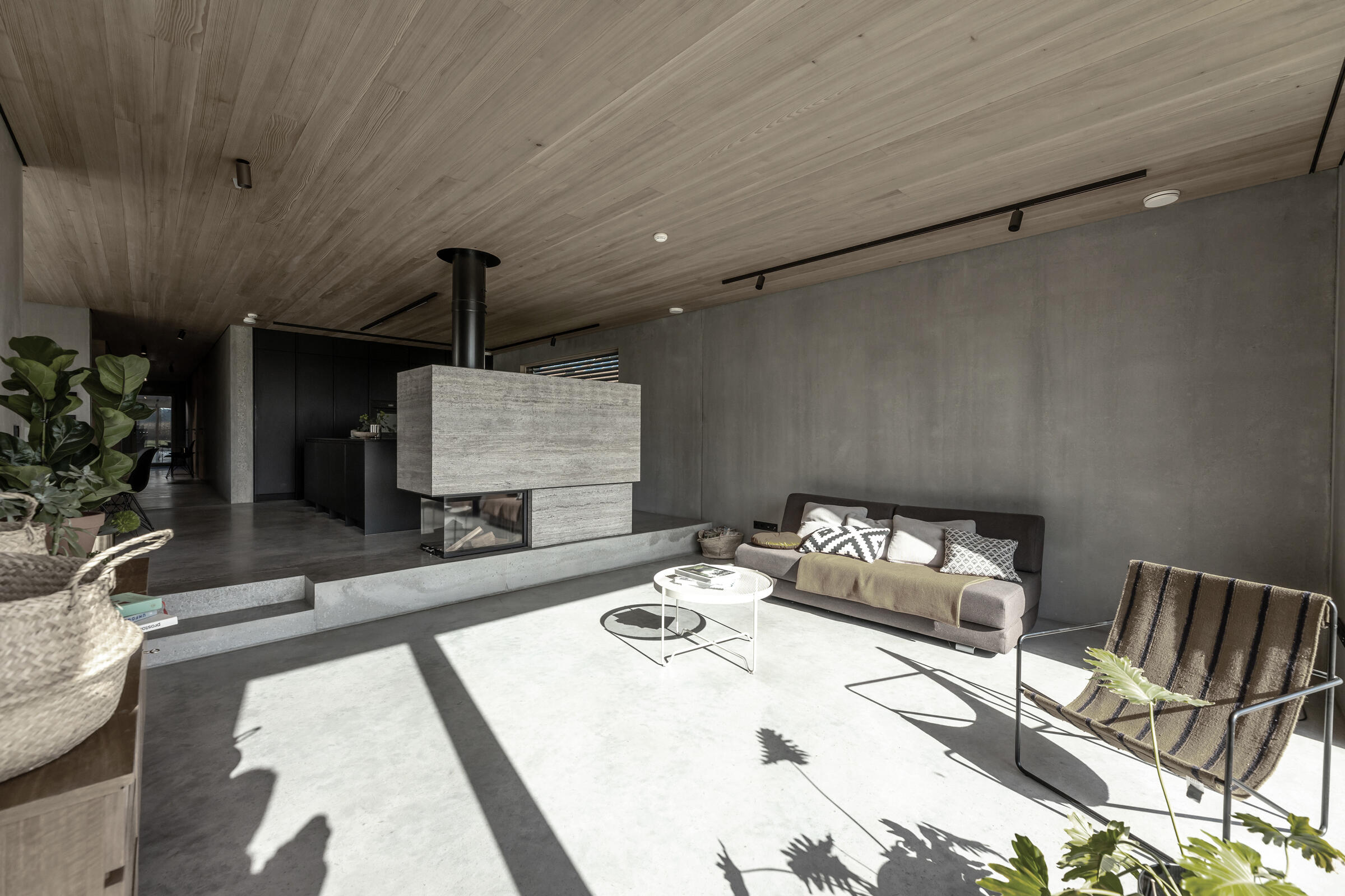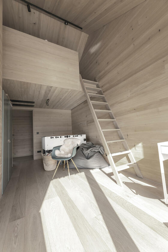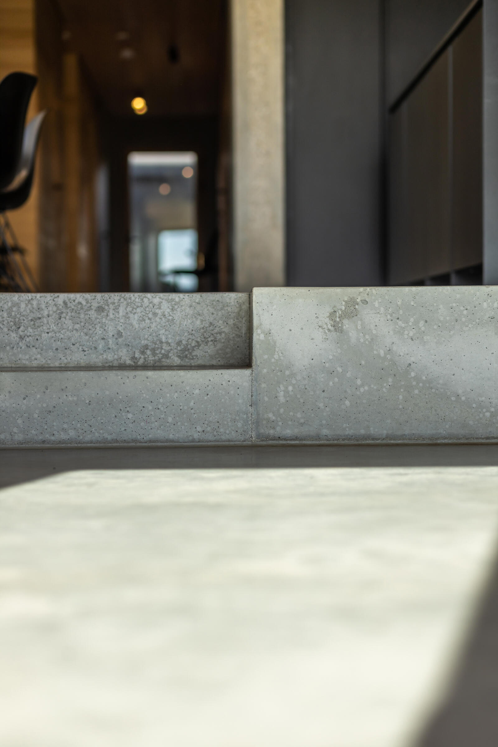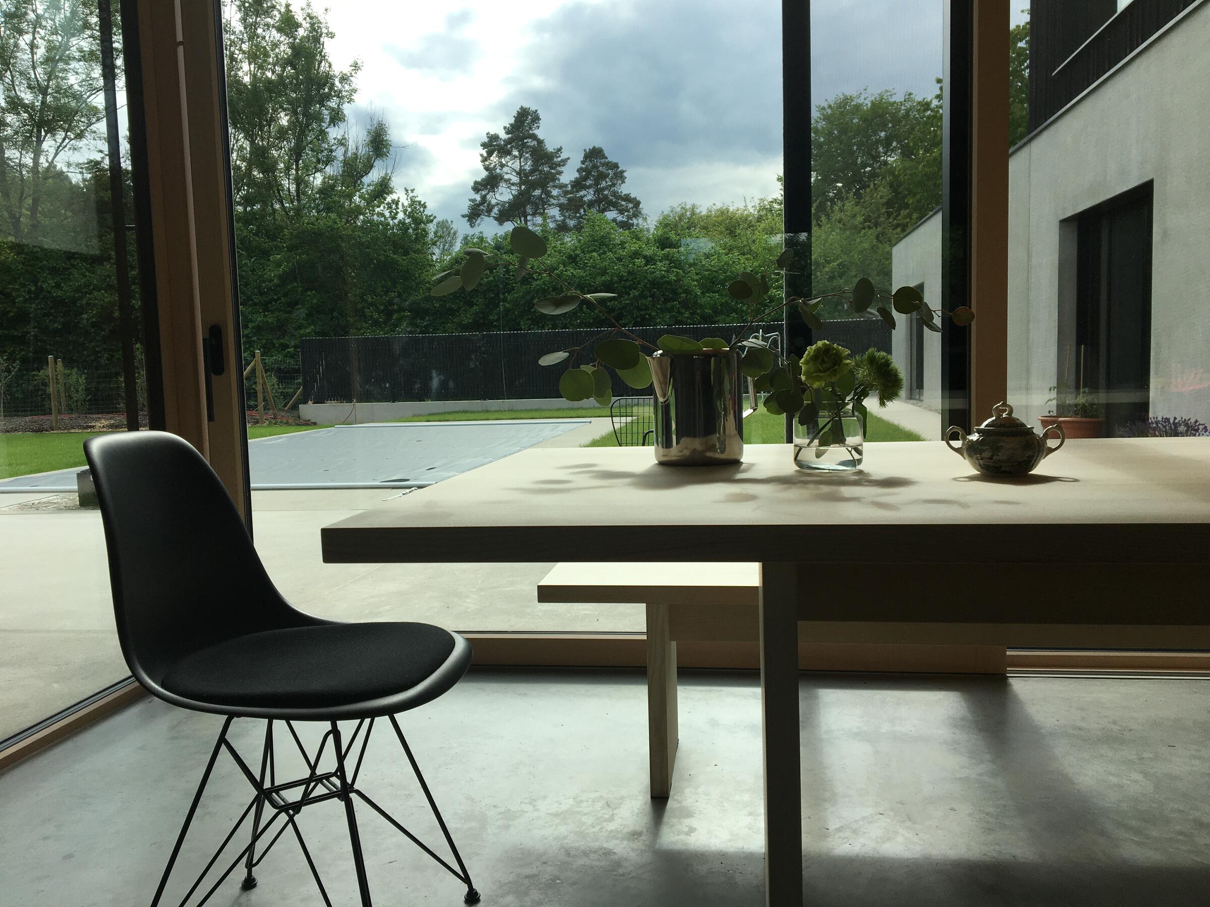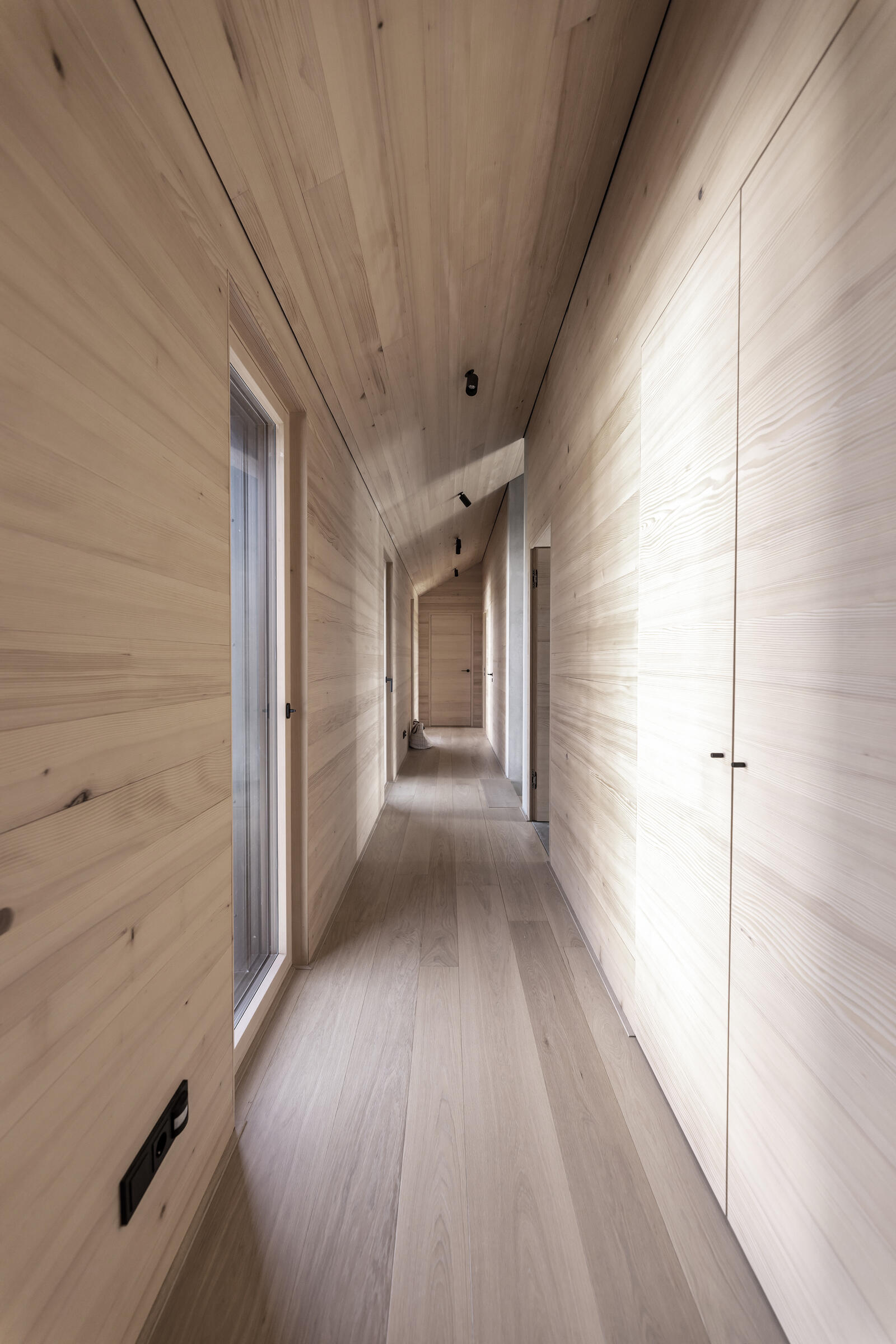 Innen zeichnet sich das Haus durch eine sehr schlichte, aber exquisite Materialauswahl aus: Weißtanne kombiniert mit Sichtbeton und Naturstein, Einbauten in Weißtanne und heller Eiche, schwarze Küche aus Eiche und Naturstein, Badeinbauten und Armaturen aus schwarzem Edelstahl, Mineralguss. Die Farbigkeit ist auf helle Holztöne, schwarz als Kontrast und grau reduziert. Das Beleuchtungskonzept setzt die ausgewählten Designmöbel gekonnt in Szene und ist ebenfalls von einem renommierten Designleuchtenhersteller. Durch die reduzierte Möblierung, die reduzierten Farben und den tollen Lichteinfall eignet sich das Anwesen perfekt für Shootings oder Drehs aller Art, da es die perfekte Bühne für vielfältige Szenen bietet.