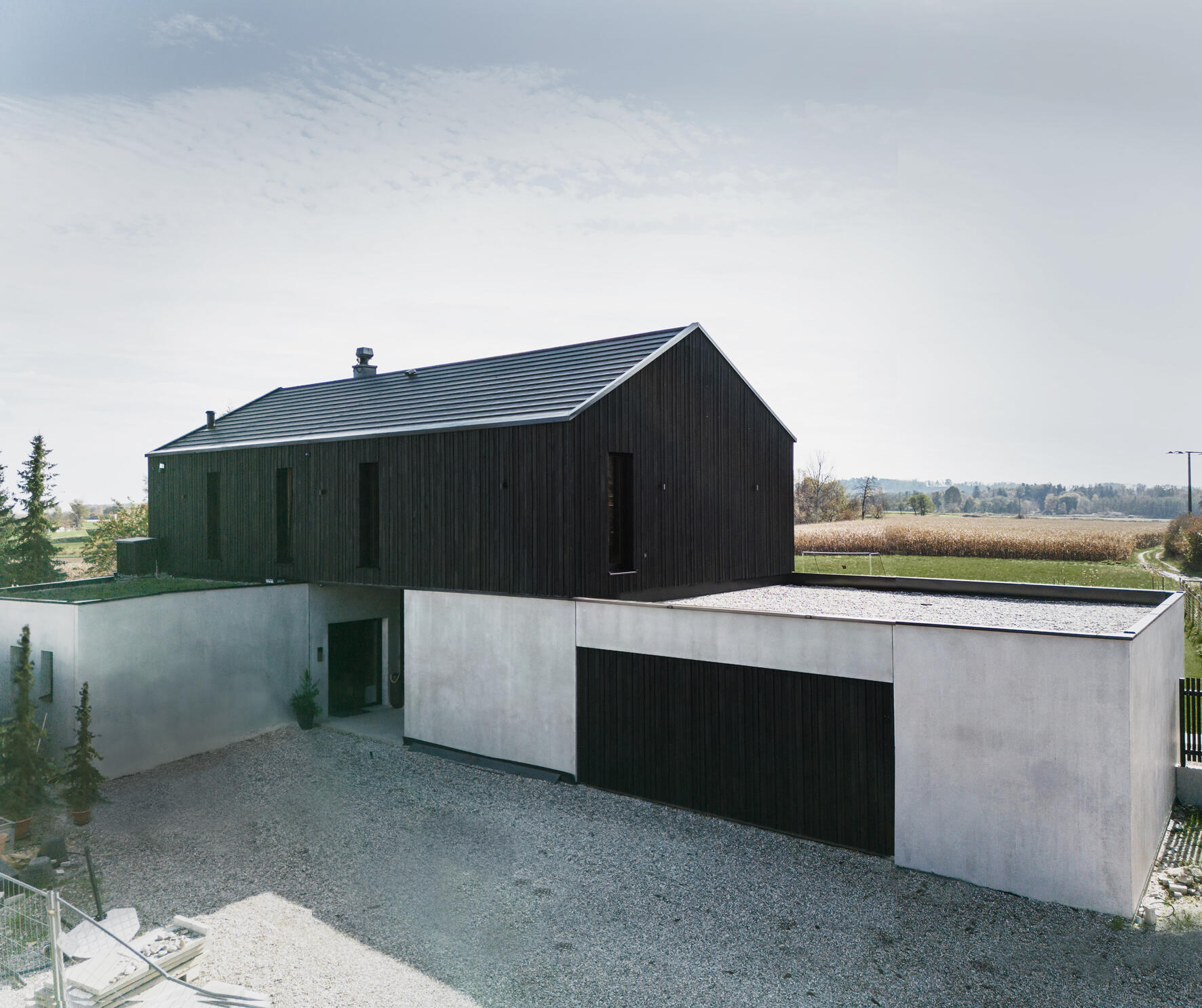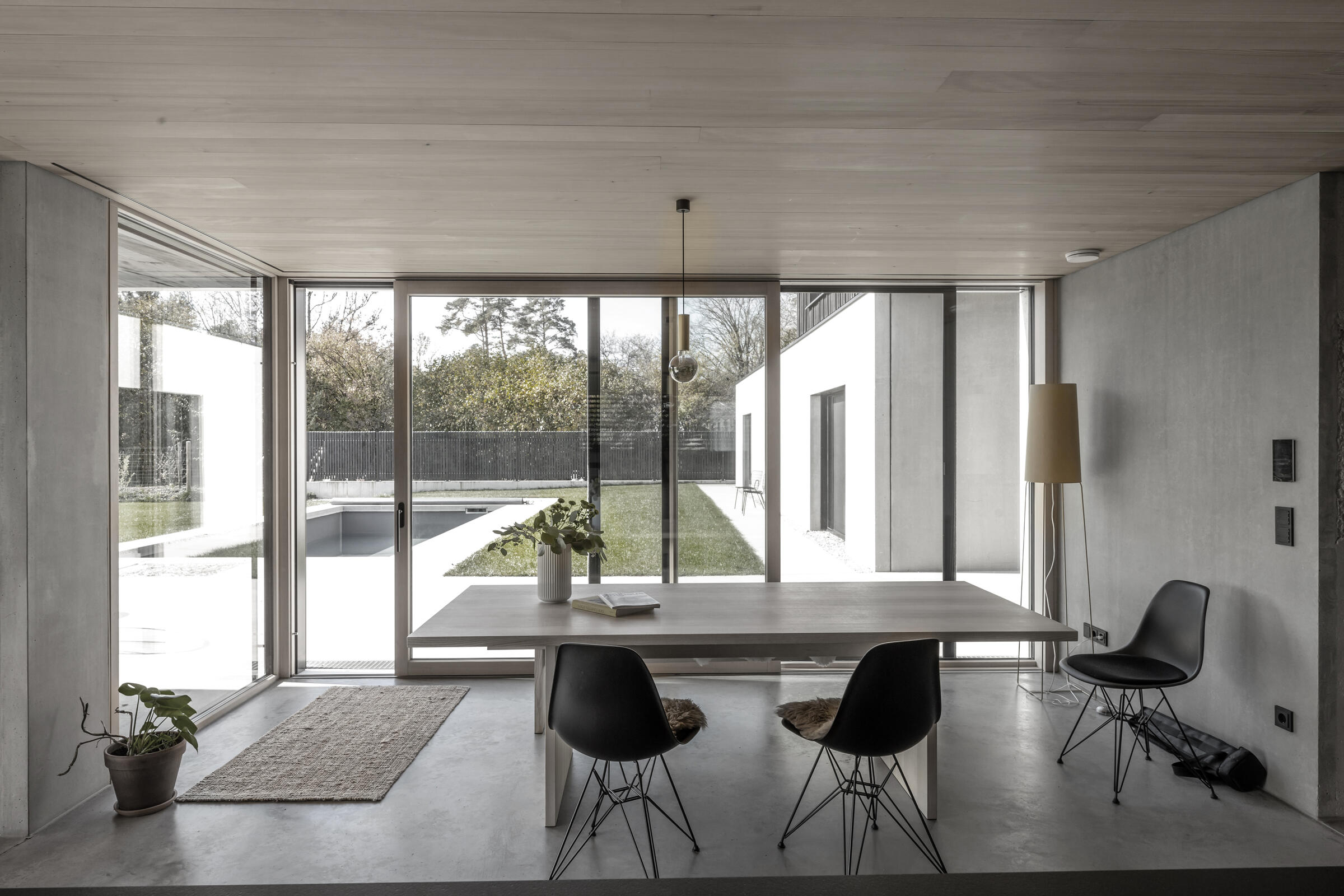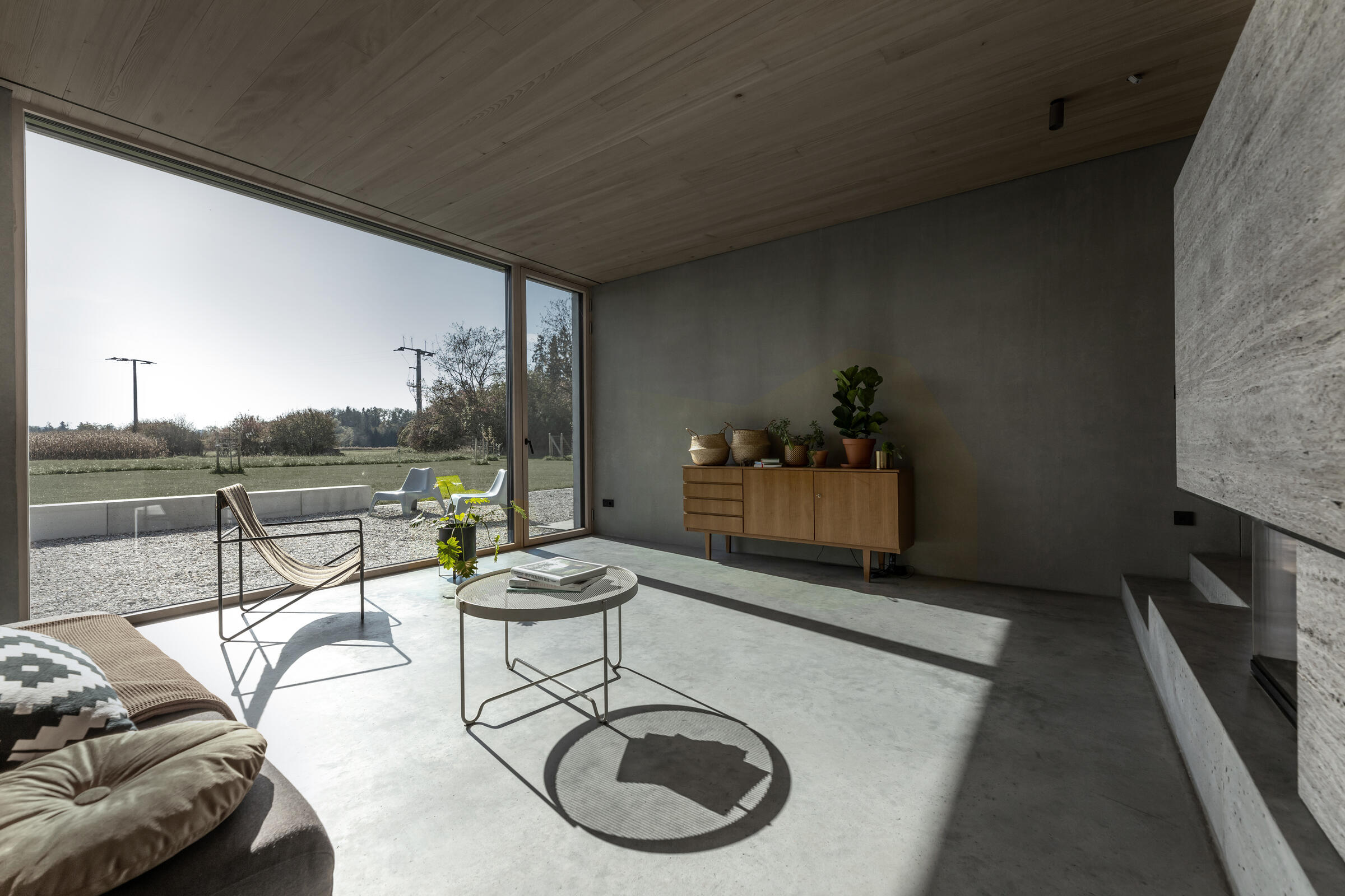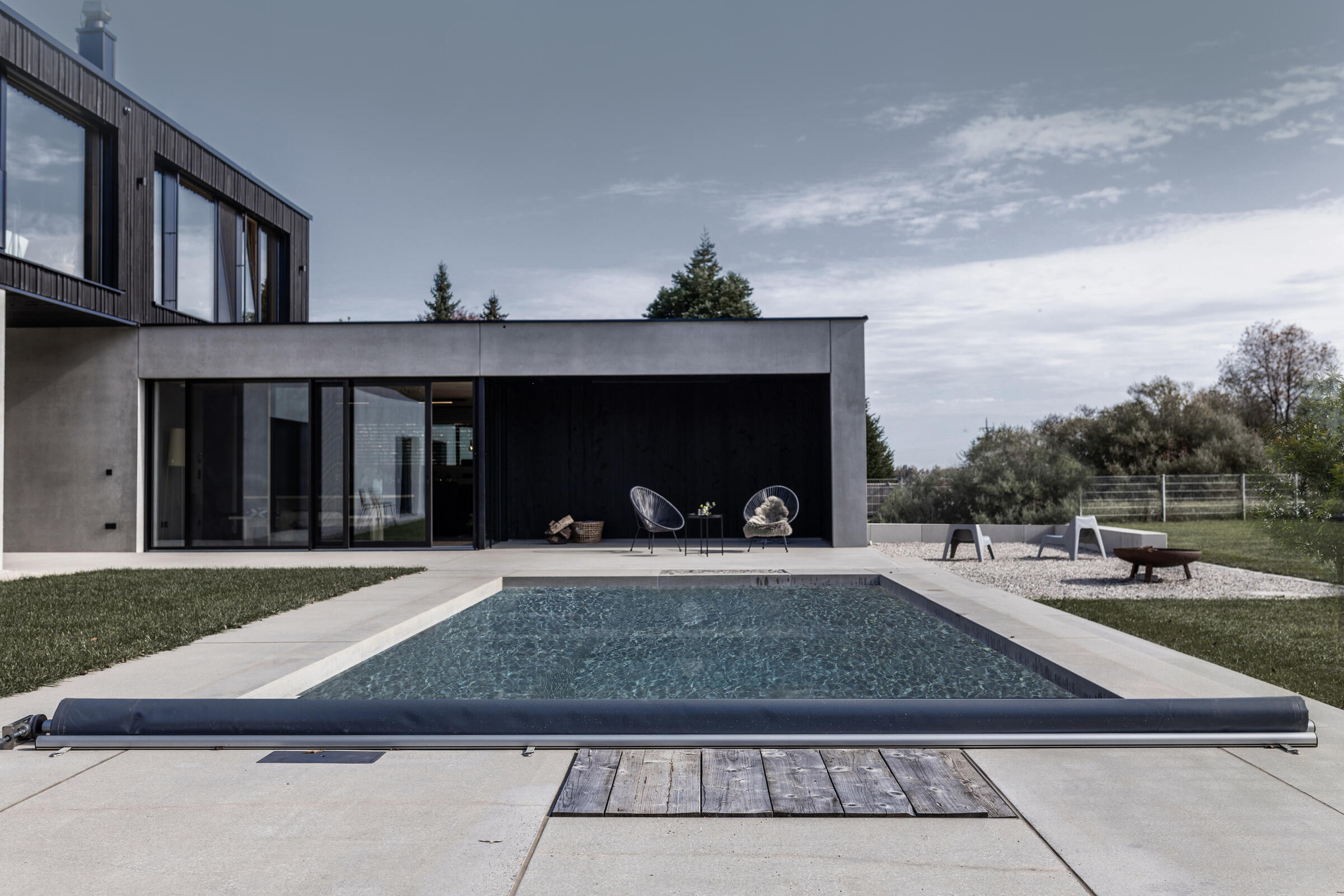 Unser formal bestechendes Anwesen liegt 45 min östlich von München zwischen Wiese, Feld, Wald und Fluß. Es ist eine moderne Interpretation eines traditionellen Hofes verbunden mit der reduzierten Ästhetik und klaren Formensprache des Bauhauses – klar, einheitlich ind hochwertig bis ins kleinste Detail. Ein schwarzer Holzaufbau im Obergeschoss verbindet sich in Form eines T mit 2 Kuben aus Sichtbeton im Erdgeschoss. Die Anordnung ergibt im Norden eine Hoffläche und im Süden eine sichtgeschützte, weitläufige Terrasse mit Außenpool und großzügiger Außenfläche mit ungestörtem Blick auf Wald und Wiese. Die Gartenfläche geht in eine Naturwiese über, die auch genutzt werden kann. Das Haus gibt sich zur Nordseite reserviert und gibt zur Süd-Westseite mit seinen raumtiefen Glasfächen großartige Ausblicke auf die umgebende Natur frei. Durch die großen Fensterfronten ist das ganze Haus sehr lichtdurchflutet und hell (durch Raffstoren kann man aber auch verdunkeln).