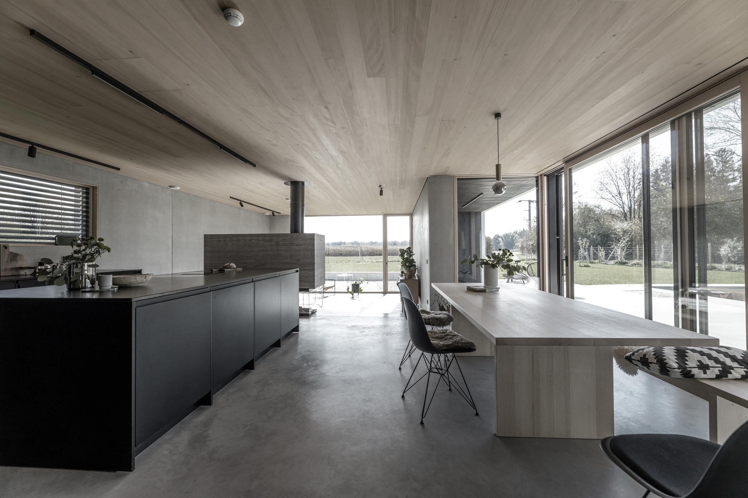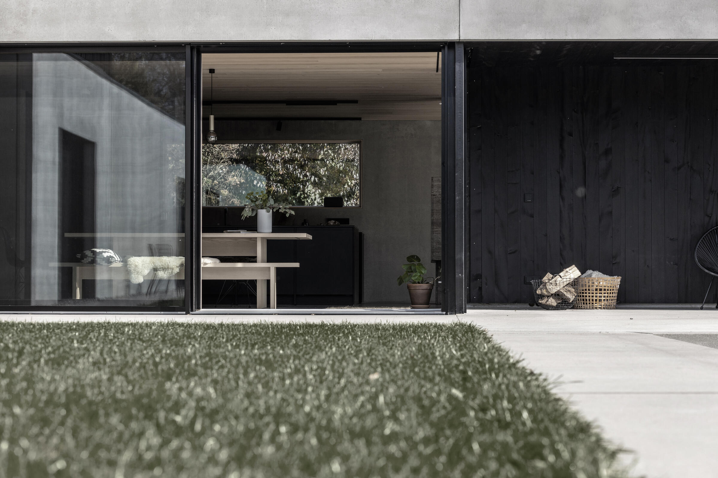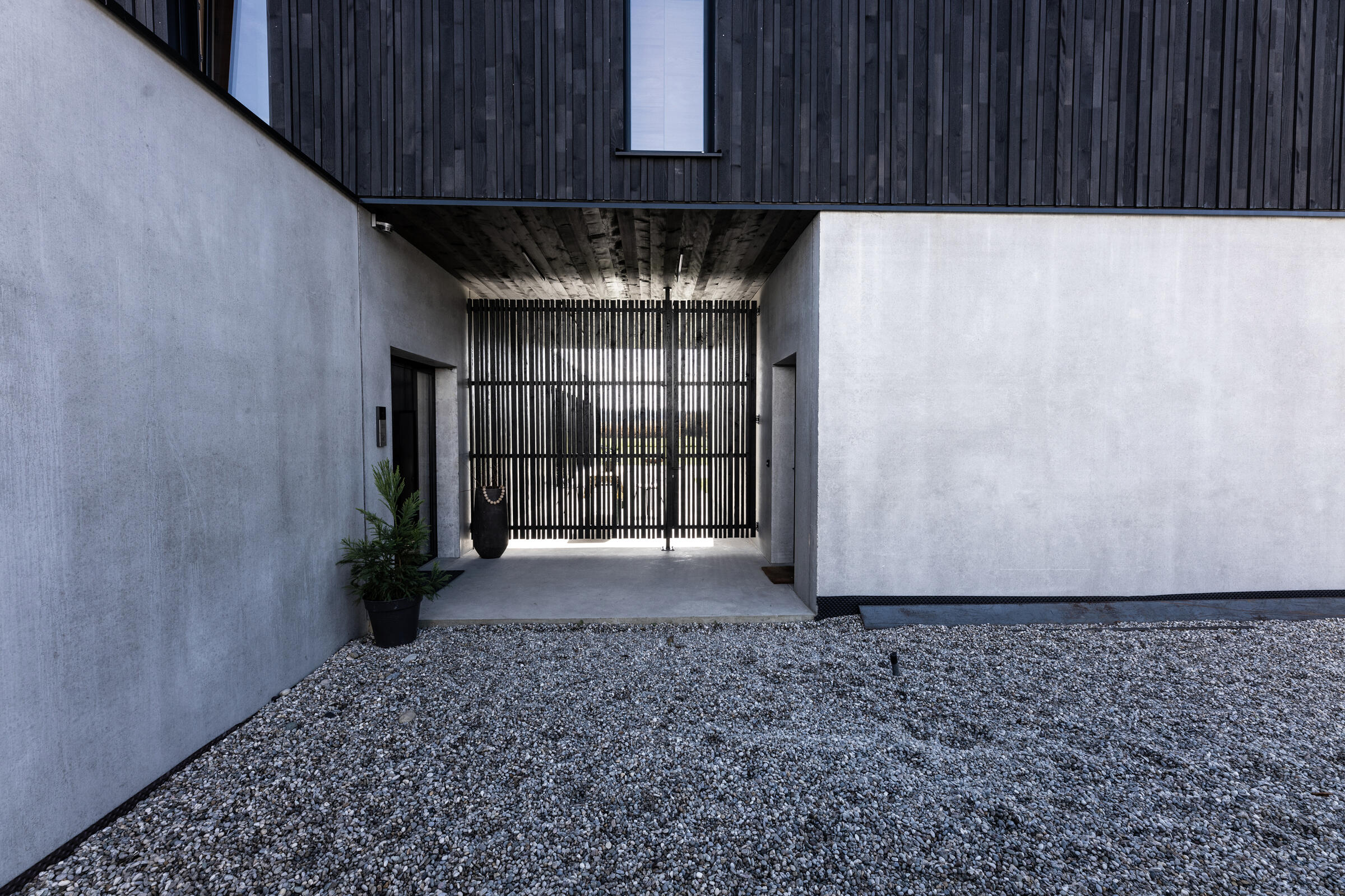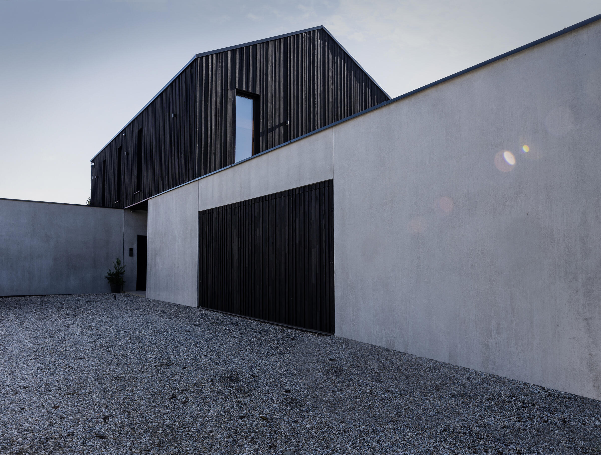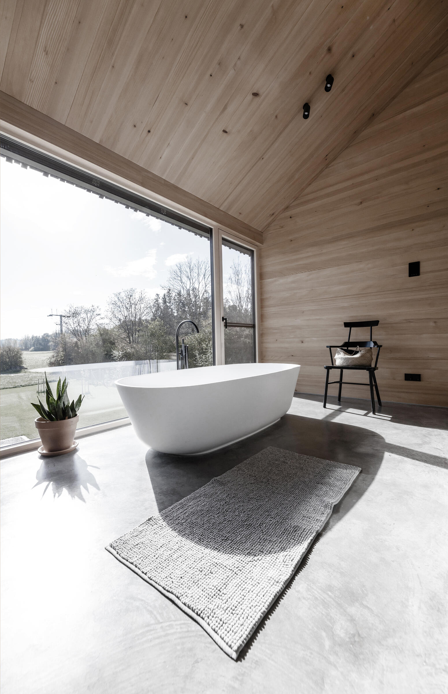 Unser formal bestechendes Anwesen liegt 45 min östlich von München zwischen Wiese, Feld, Wald und Fluß. Es ist eine moderne Interpretation eines traditionellen Hofes verbunden mit der reduzierten Ästhetik und klaren Formensprache des Bauhauses – klar, einheitlich ind hochwertig bis ins kleinste Detail. Ein schwarzer Holzaufbau im Obergeschoss verbindet sich in Form eines T mit 2 Kuben aus Sichtbeton im Erdgeschoss. Die Anordnung ergibt im Norden eine Hoffläche und im Süden eine sichtgeschützte, weitläufige Terrasse mit Außenpool und großzügiger Außenfläche mit ungestörtem Blick auf Wald und Wiese. Die Gartenfläche geht in eine Naturwiese über, die auch genutzt werden kann. Das Haus gibt sich zur Nordseite reserviert und gibt zur Süd-Westseite mit seinen raumtiefen Glasfächen großartige Ausblicke auf die umgebende Natur frei. Durch die großen Fensterfronten ist das ganze Haus sehr lichtdurchflutet und hell (durch Raffstoren kann man aber auch verdunkeln).