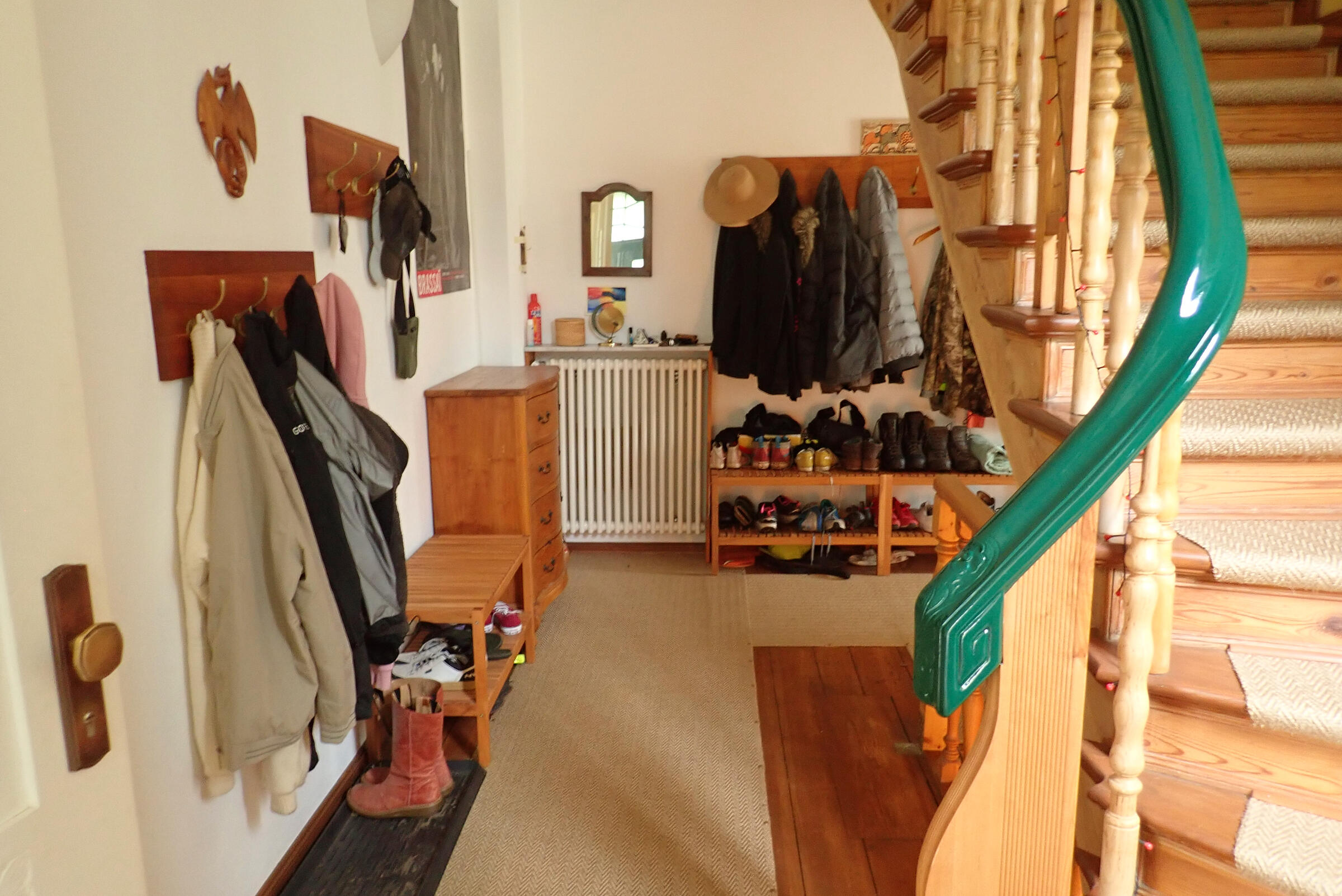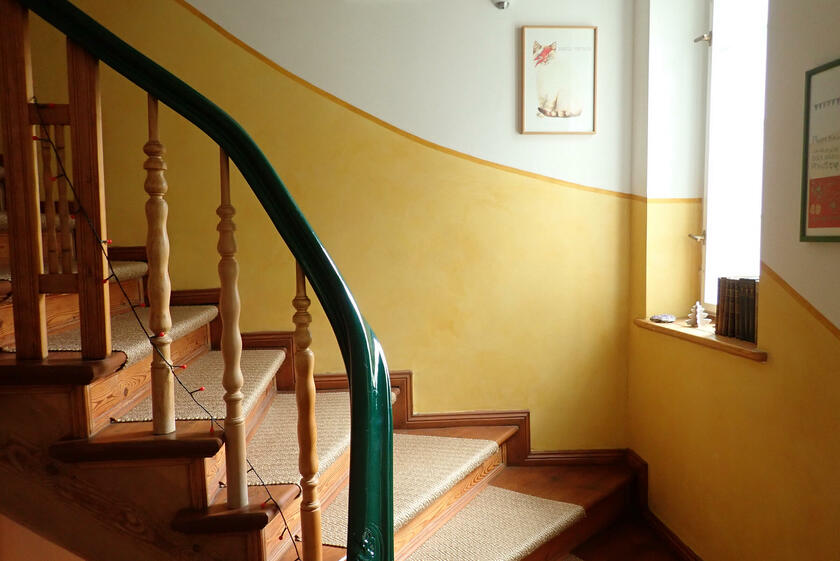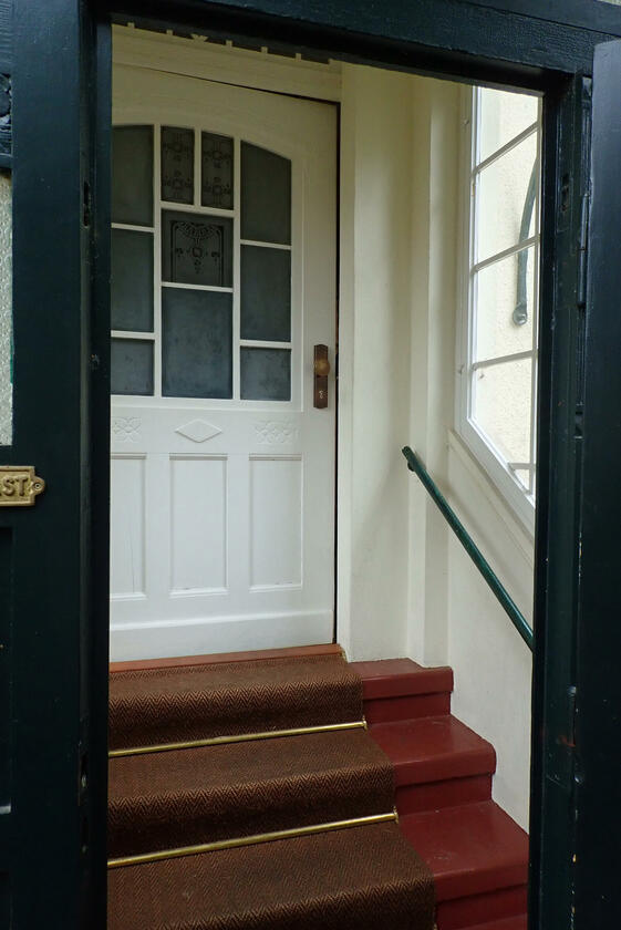 Die Fassade wird geschmückt von den original Stuckelementen sowie dem aufwändig nach historischem Vorbild rekonstruierten Holzanbau mit Bleiglaselementen in einem Rundbogenfenster. Das Haus wurde innen und außen stilgerecht saniert und eingerichtet mit einer Mischung aus antiken und zeitlos klassischen Möbeln und Einrichtungselementen wie Heizkörperabdeckungen mit Bastgeflecht.