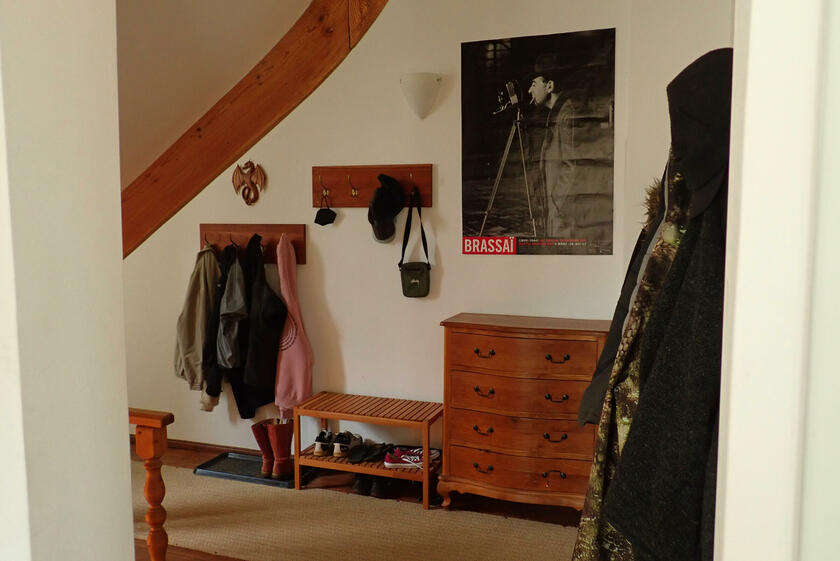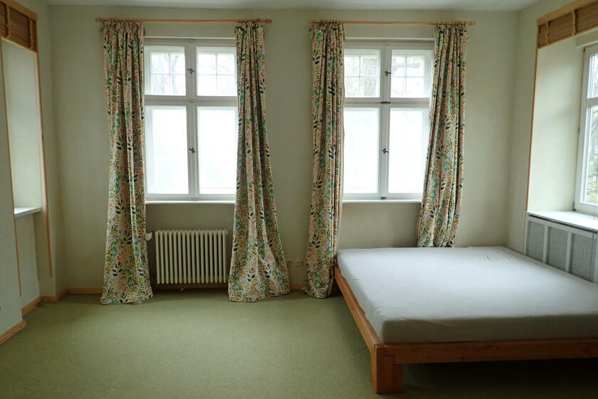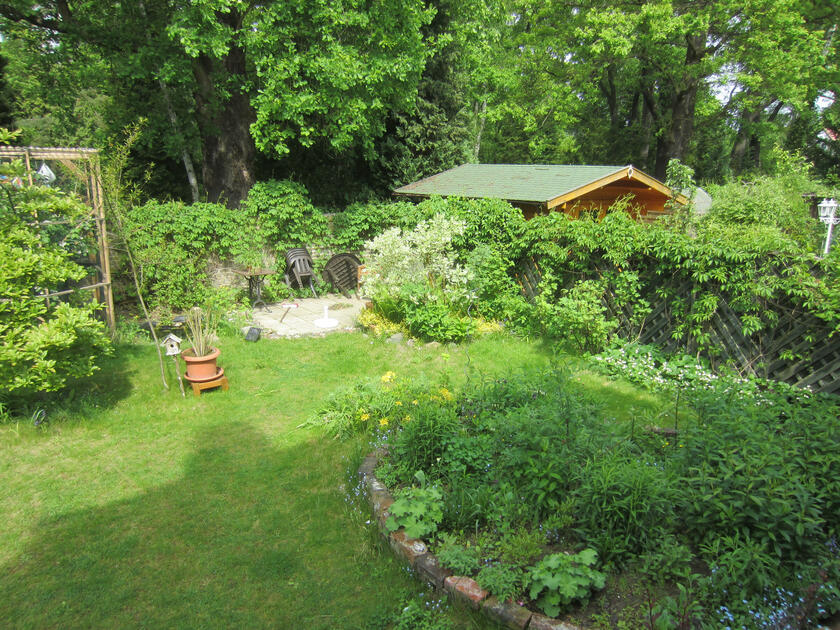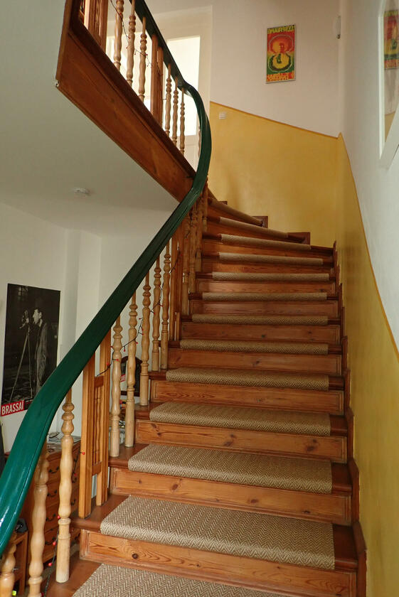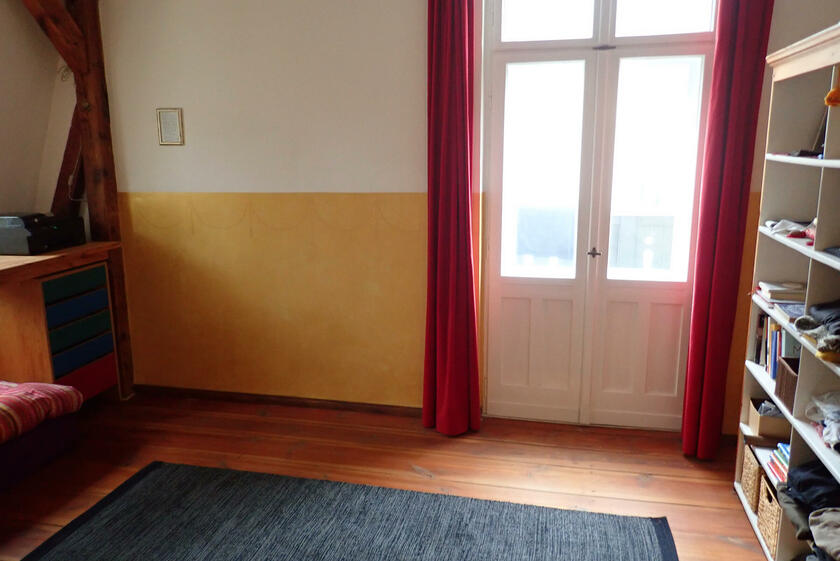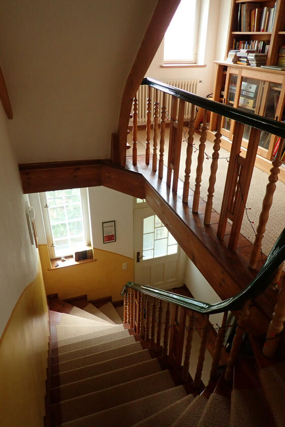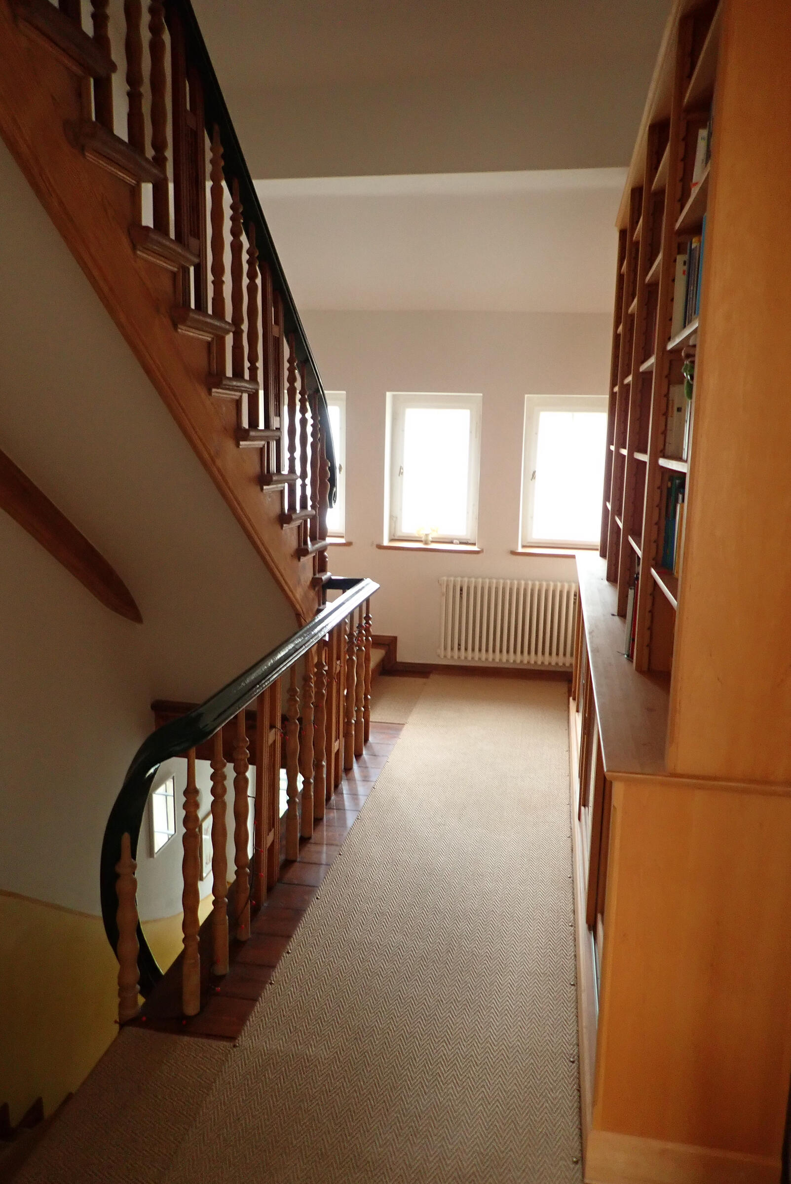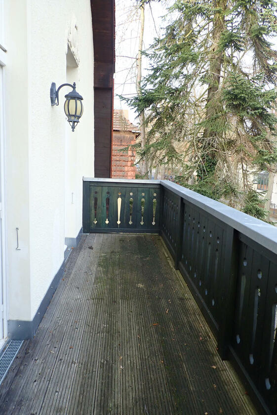 Im Erdgeschoss gibt es eine geräumige Küche mit Türen zum Garten und ein großes Esszimmer im Wintergarten nach Südwesten mit Rundumblick auf den baumbestandenen Friedhof. Ein kleiner Holzbalkon mit Treppe führt in den kleinen Garten. Im Obergeschoß 4 große Zimmer, zwei davon mit Türen zum vorderen Balkon. Ein Wintergarten mit Kamin, sowie ein halbes Zimmer. Der Wintergarten ist halbrund umrahmt von einem Holzbalkon. Ein Balkon weist zur Straße gen Osten, und einer zum historischen Friedhof, der an das Haus angrenzt.