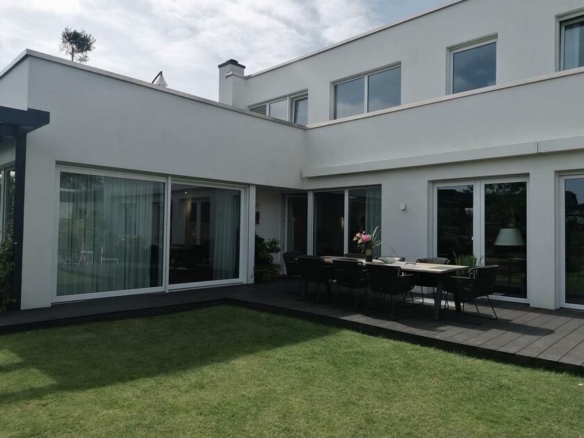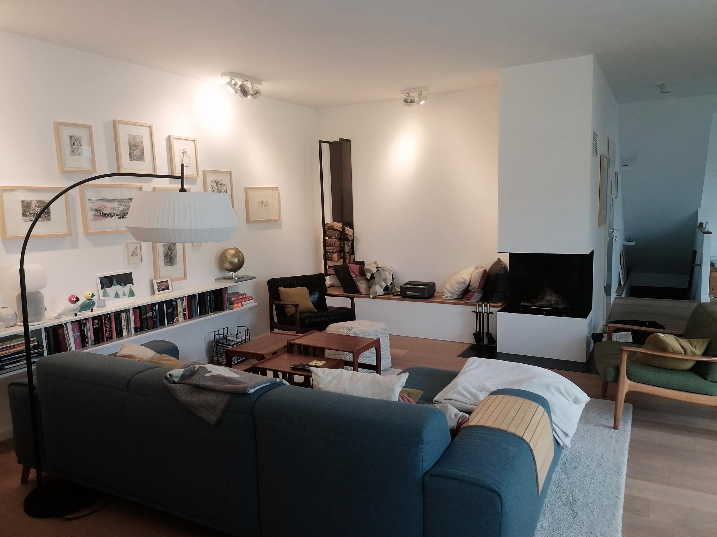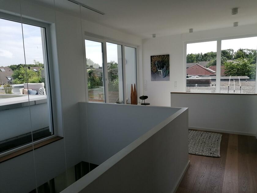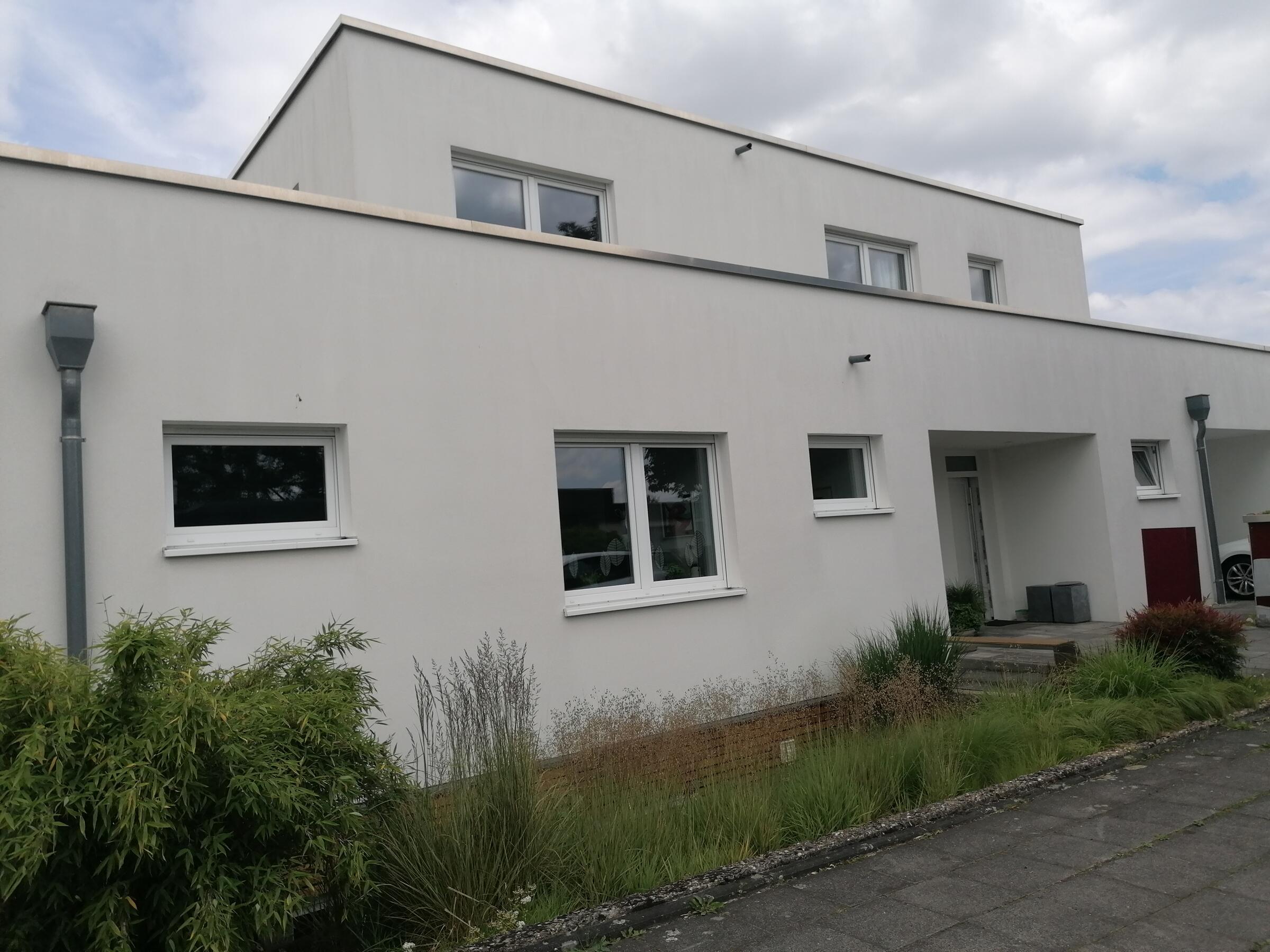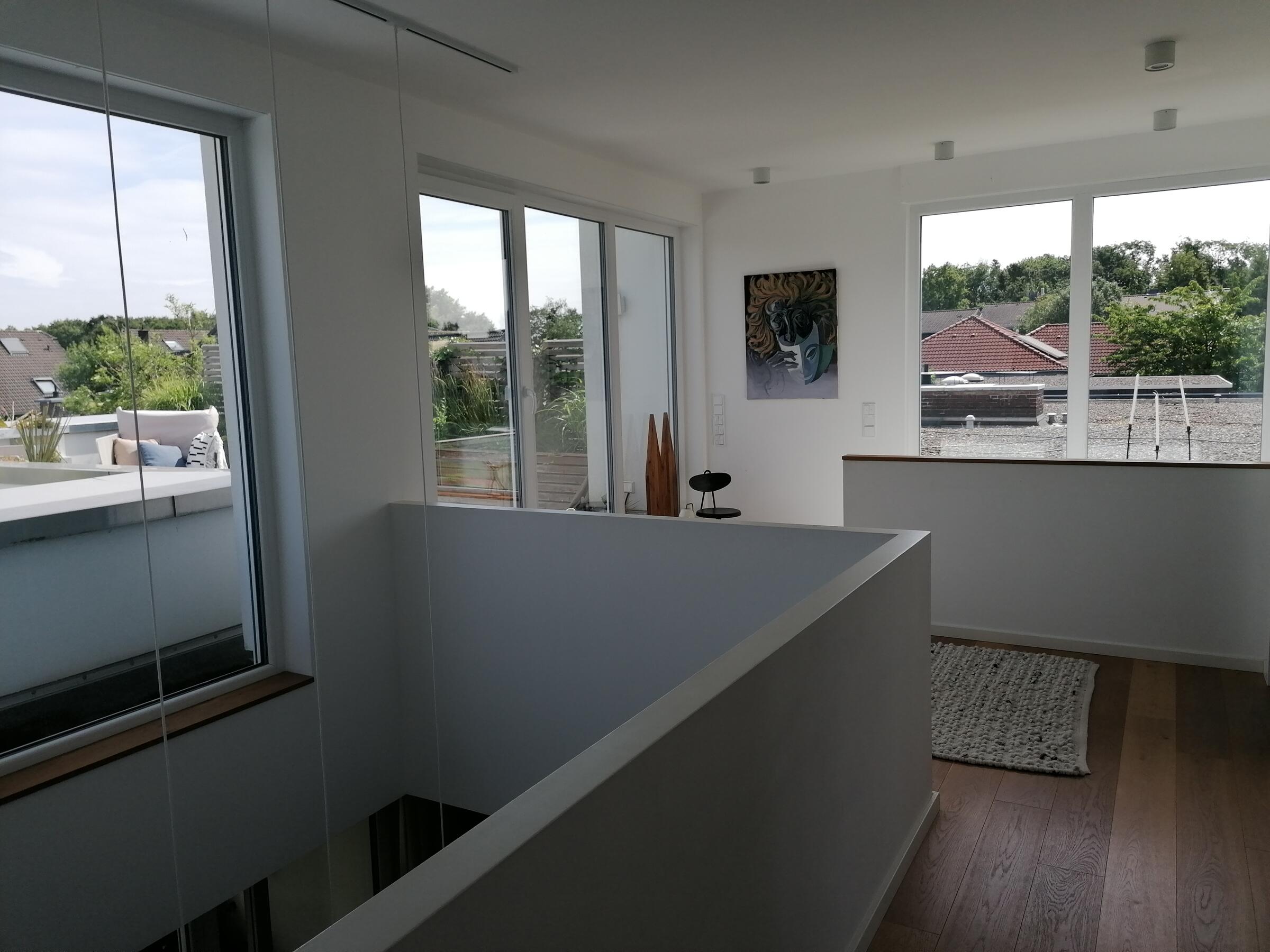 Unser schönes und im Bauhausstil errichtetes Einfamilienhaus verbindet auf 3 Etagen moderne Architektur mit punktuellem Retro-Design. Der offene Wohn- und Essbereich mit Kamin schließt an eine Galerie an, wodurch das gesamte Erdgeschoss hell und luftig ist und die Blicke auf sich zieht. Im Obergeschoss kann man eine charmante, möblierte Dachterrasse mit Bepflanzung begehen. Der gesamte Wohnbereich ist mit individuellen Werken einer Künstlerin aus der Familie gestaltet. Der Garten ist gepflegt und bietet mit 2 Terrassen, eine davon mit Glasdach, die andere mit 8 Meter Markise inklusive Beleuchtung, viele reizvolle Aussichten (Begrünung/Bepflanzung jahreszeitlich variieren). Im Keller gibt es einen Spielraum mit großer Kletterwand sowie einen kleinen Wellnessbereich mit Sauna. Unser Haus befindet sich in einer ruhigen Anliegerstraße mit Einfamilienhausbebauung. Vor dem Objekt finden sich eine Vielzahl von freien Parkplätzen sowie ein großer öffentlicher Parkplatz in unmittelbarer Nähe (ca. 30 m). Die Anbindung an die Autobahnen A1 und A57 sind in ca. 10 min Autofahrzeit zu erreichen.