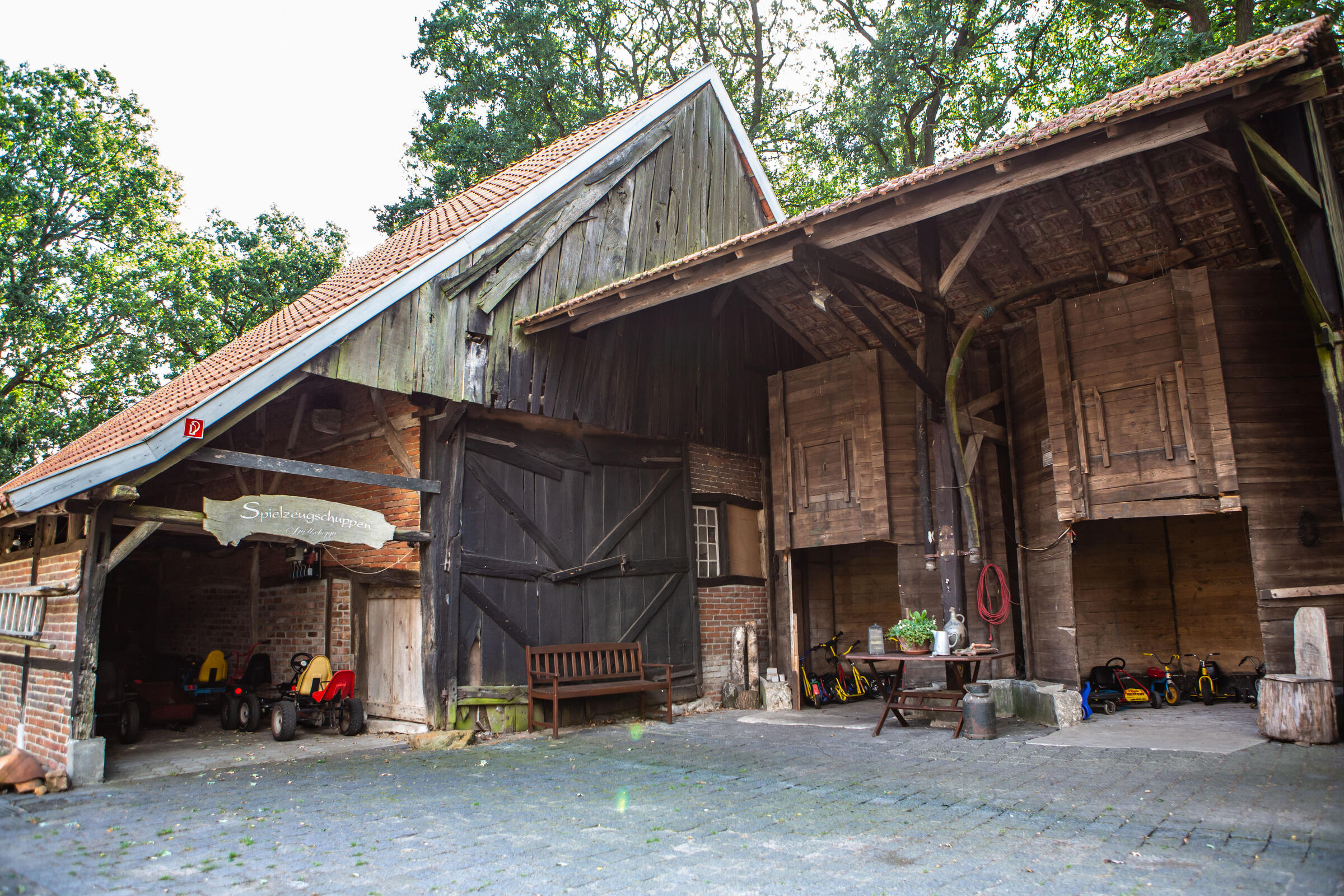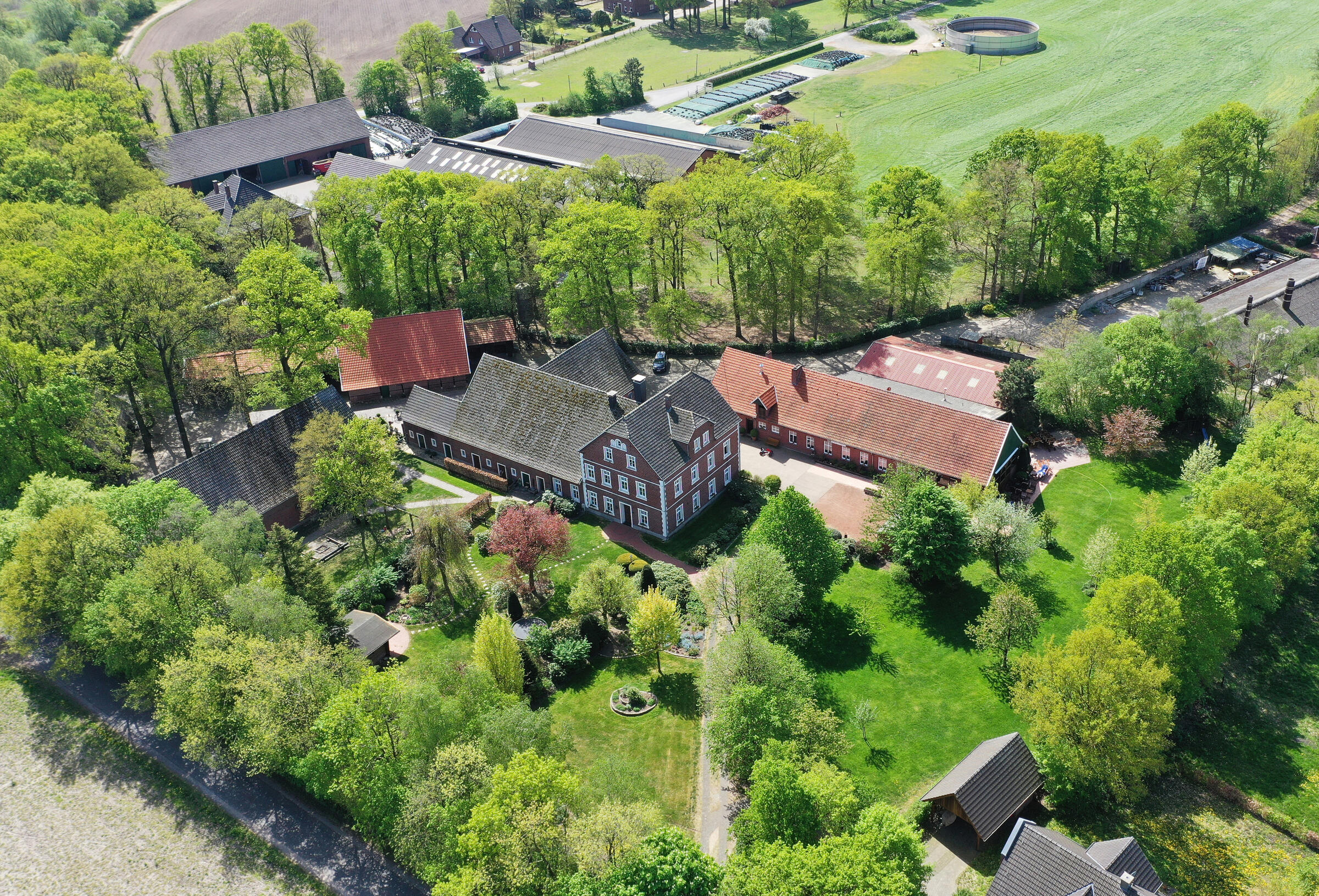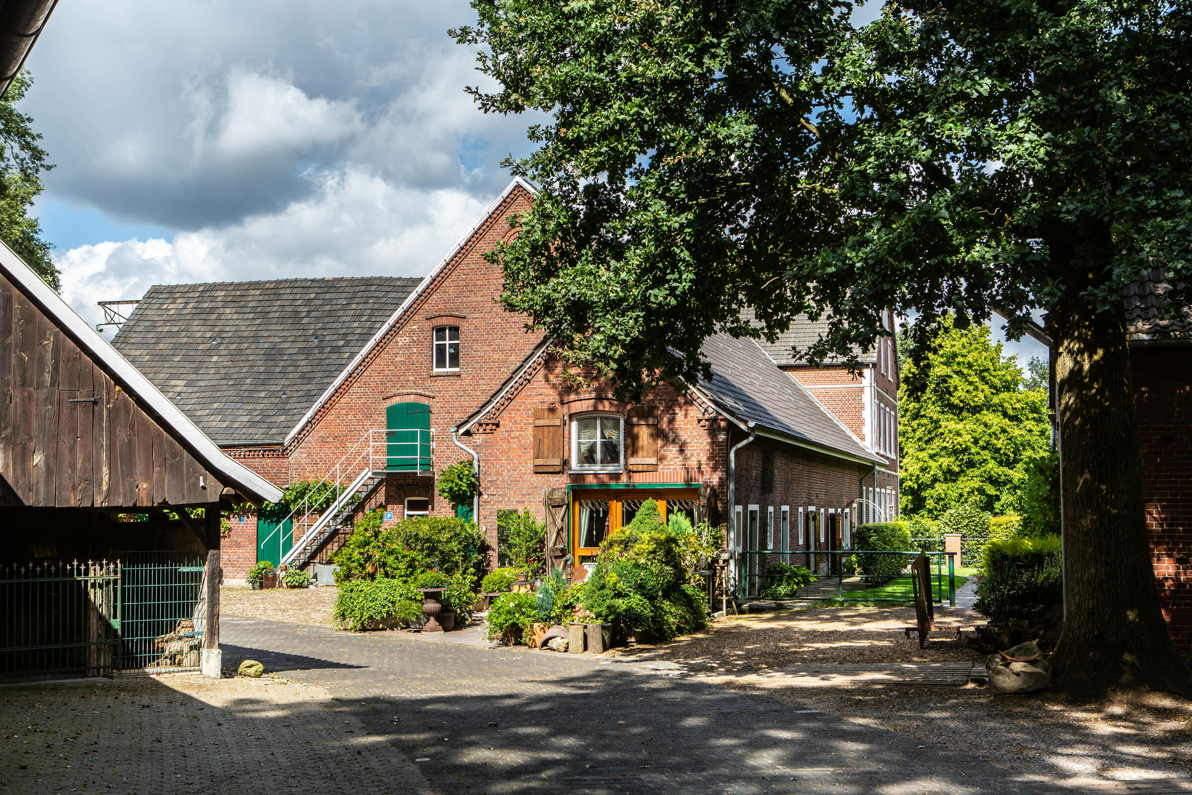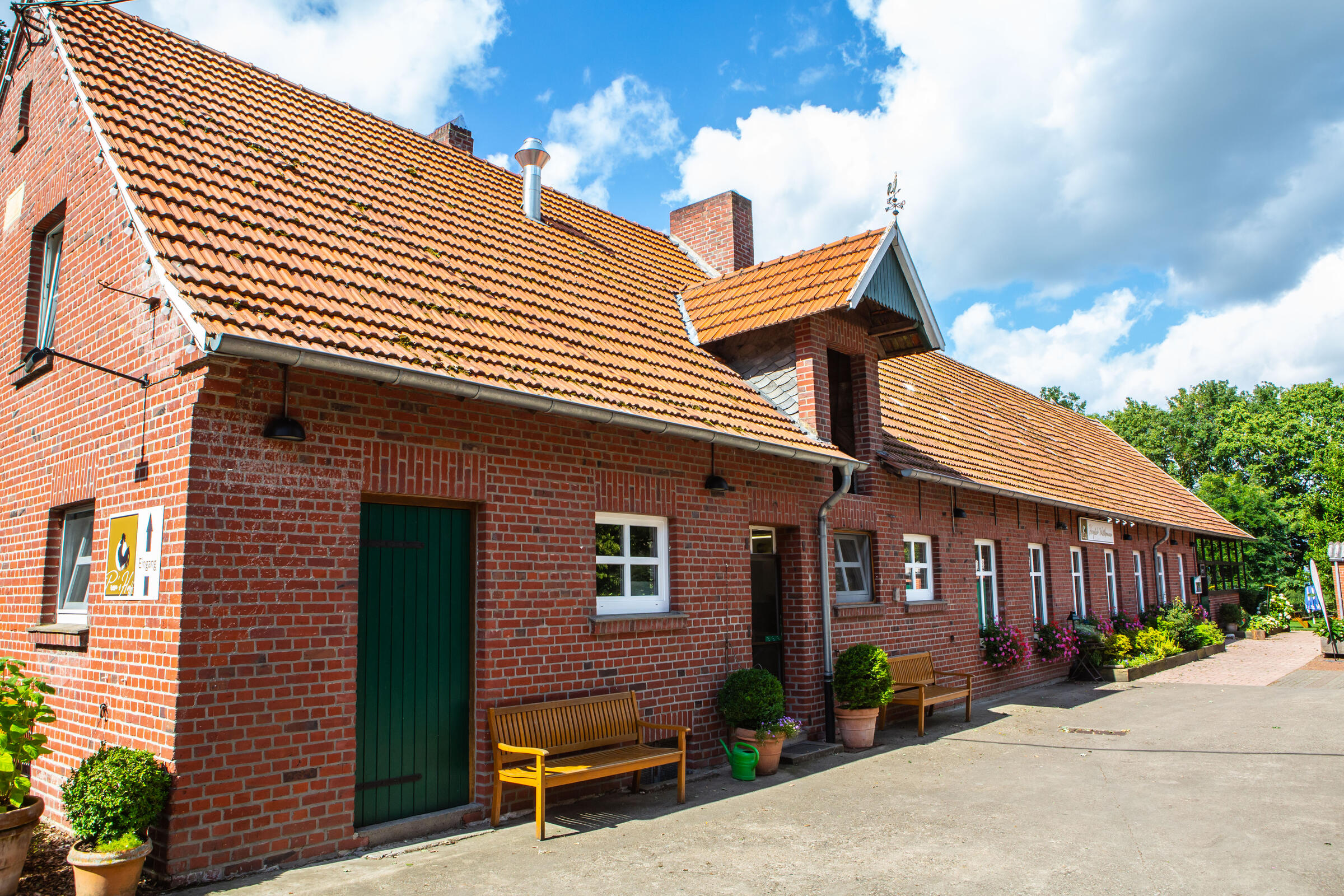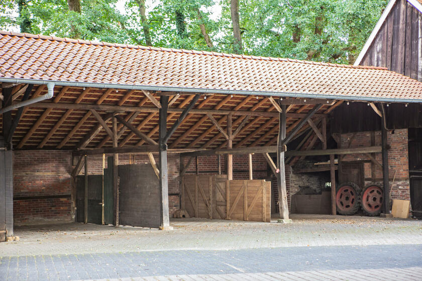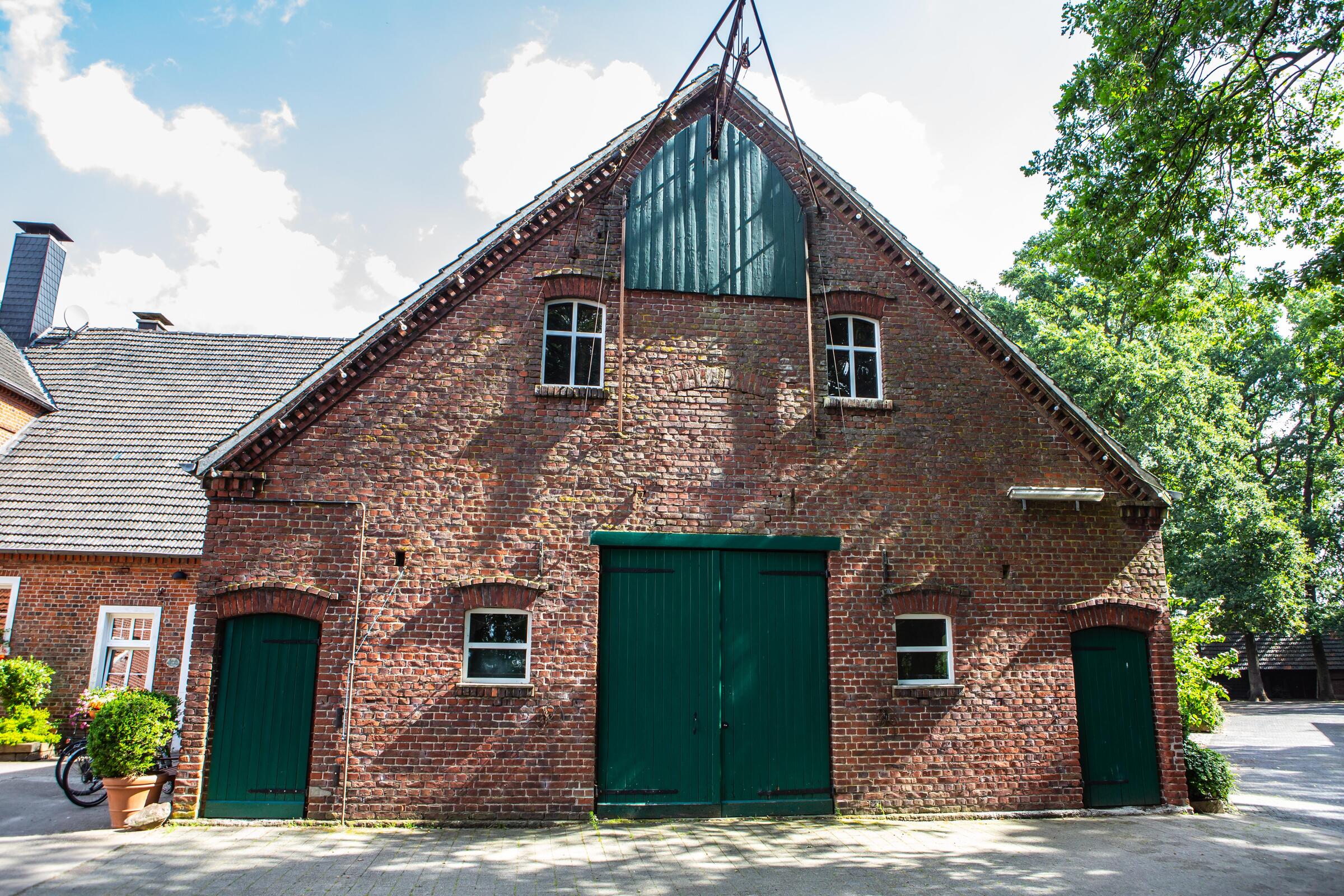 Unser Hof, mit seinem alten Eichenbestand, liegt in ruhiger Ortsrandlage im südlichen Münsterland. Der großzügig gestaltete Hof beeindruckt mit seinen alten Gebäuden und dem herrschaftlichen Wohnhaus. Angrenzend an das Wohnhaus befindet sich eine parkähnliche Gartenanlage, in dem Rhododendron, Rosen, Hortensien uvm. zu den Jahreszeiten verschieden blühend zu finden sind. Ein großer Raum im umgebauten Schweinestall bietet Platz für bis zu 100 Personen. Der angrenzende Biergarten besticht mit seiner Größe und seinem gepflegten grünem Rasen. Ein weiteres Highlight des Hofes sind die beiden Heuböden mit den "Heusuiten" und der beeindruckenden Balkenkonstruktion. Parkplätze sind in ausreichender Zahl auf dem Hof vorhanden. Toilettenanlagen sind vor Ort.