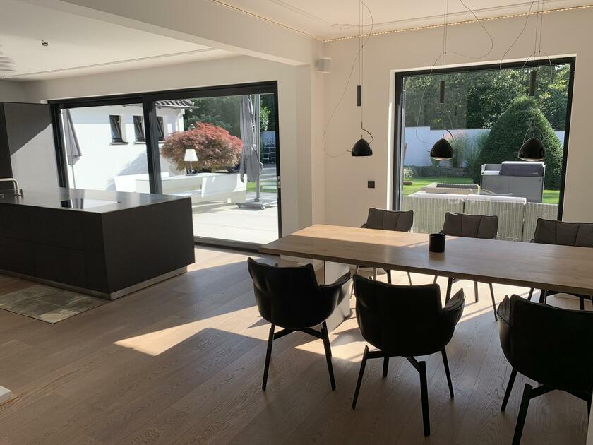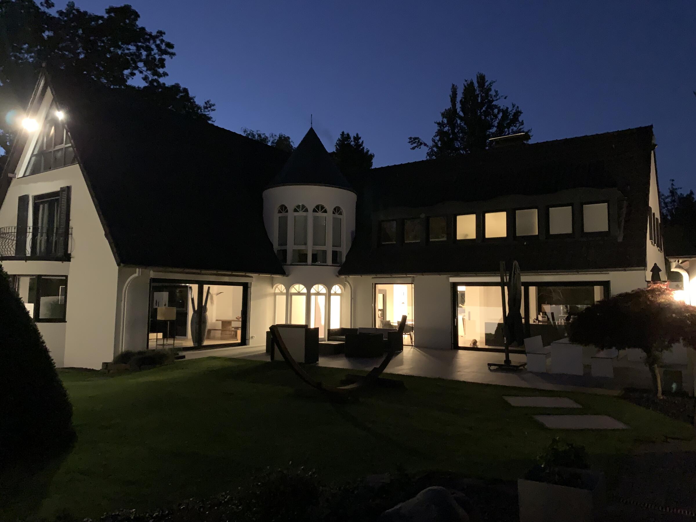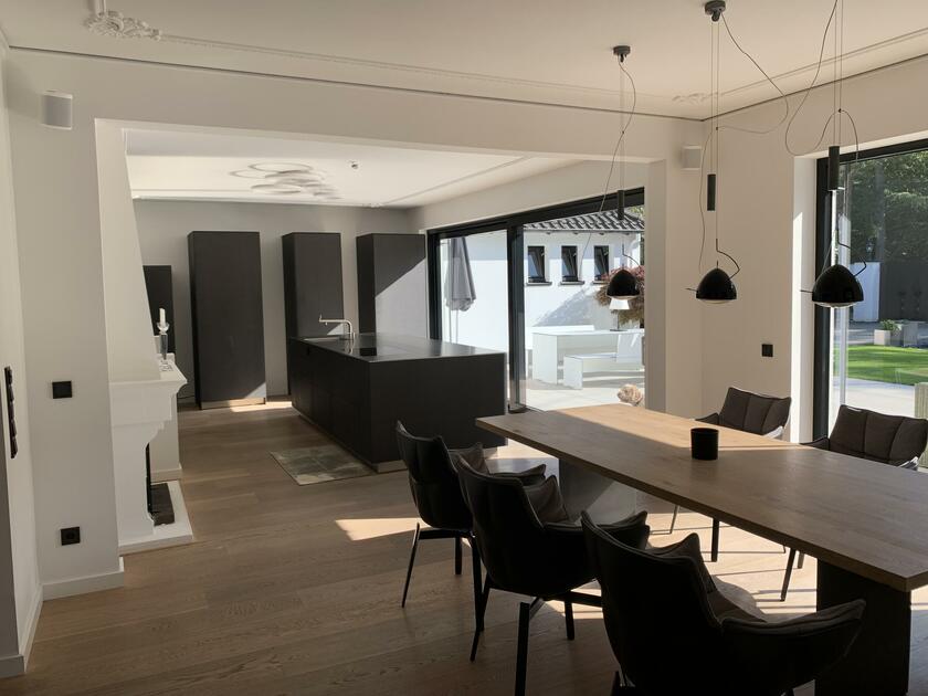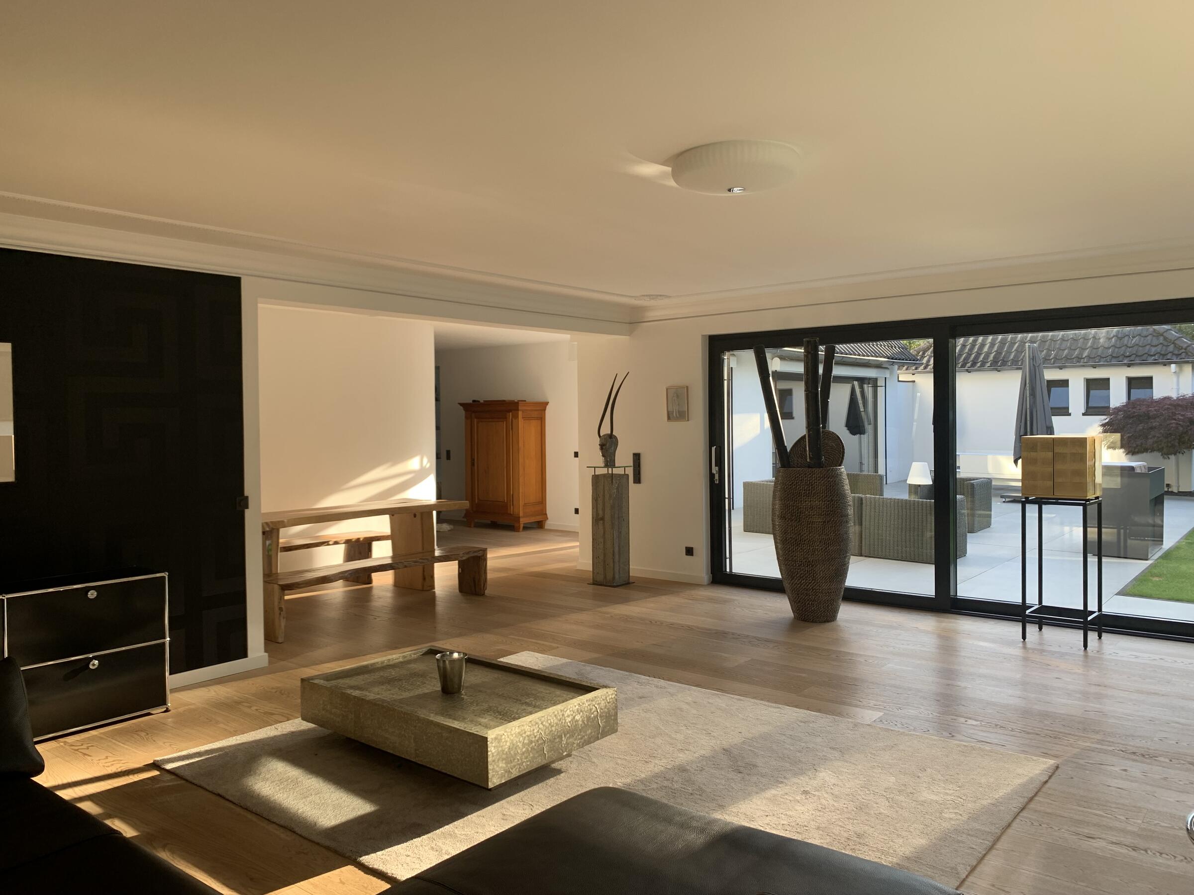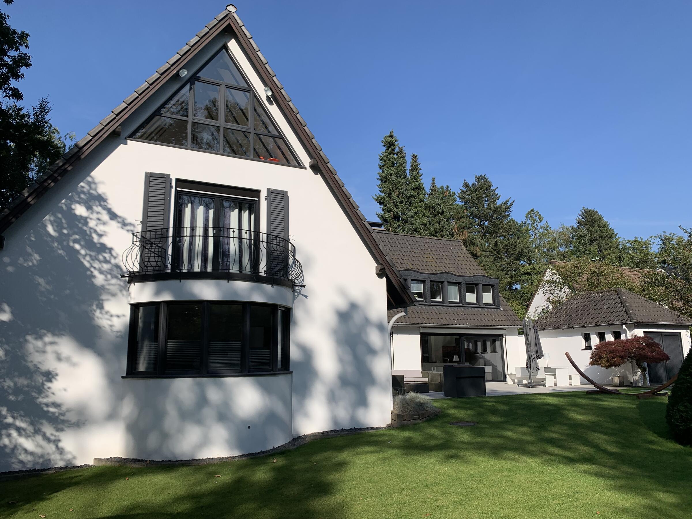 Die Villa befindet sich in Ratingen Hösel, in unmittelbarer Nähe zum Autobahnanschluss in Richtung Düsseldorf und Essen. 350 m² Wohnfläche erstrecken sich auf drei Ebenen, die durchgängig mit hellen Eichendielen verlegt sind. In den vier Bädern befinden sich raumhohe, großformatige Fliesen. Erdige Töne sowie eine klare schwarz- weiß Farbgebung in Kombination mit modernem Design bestimmen den Stil des Hauses und geben ihm Wohlfühlcharakter. Ein großer Fitnessbereich inklusive Sauna, Dusche und WC im Untergeschoss sind von außen zugängig und können neben zwei weiteren Räumen als Maske und Garderobe genutzt werden.