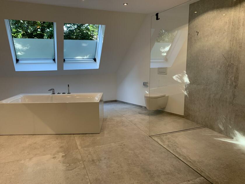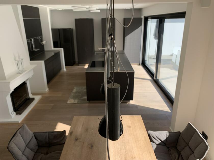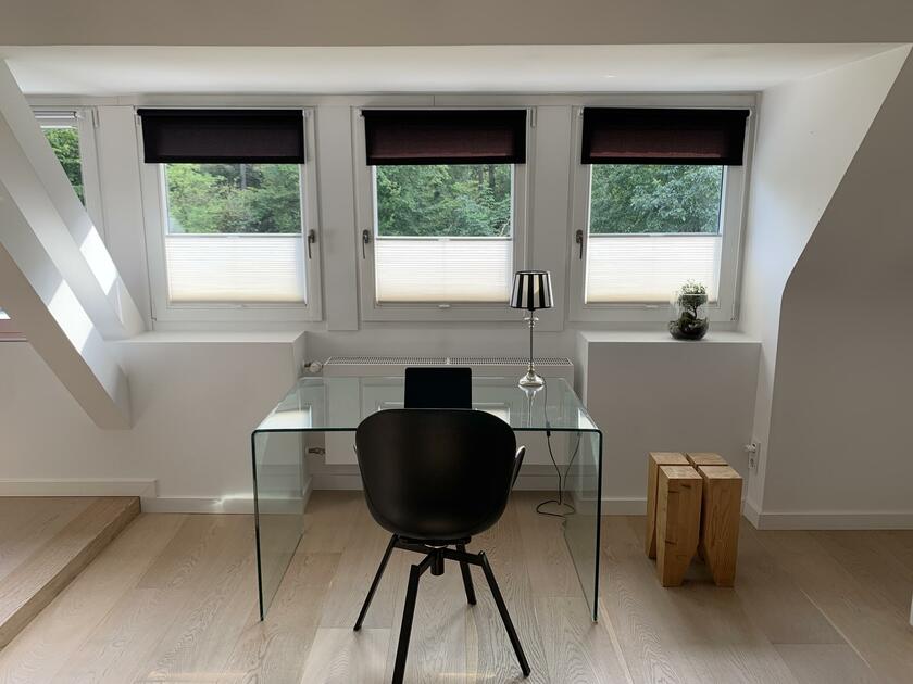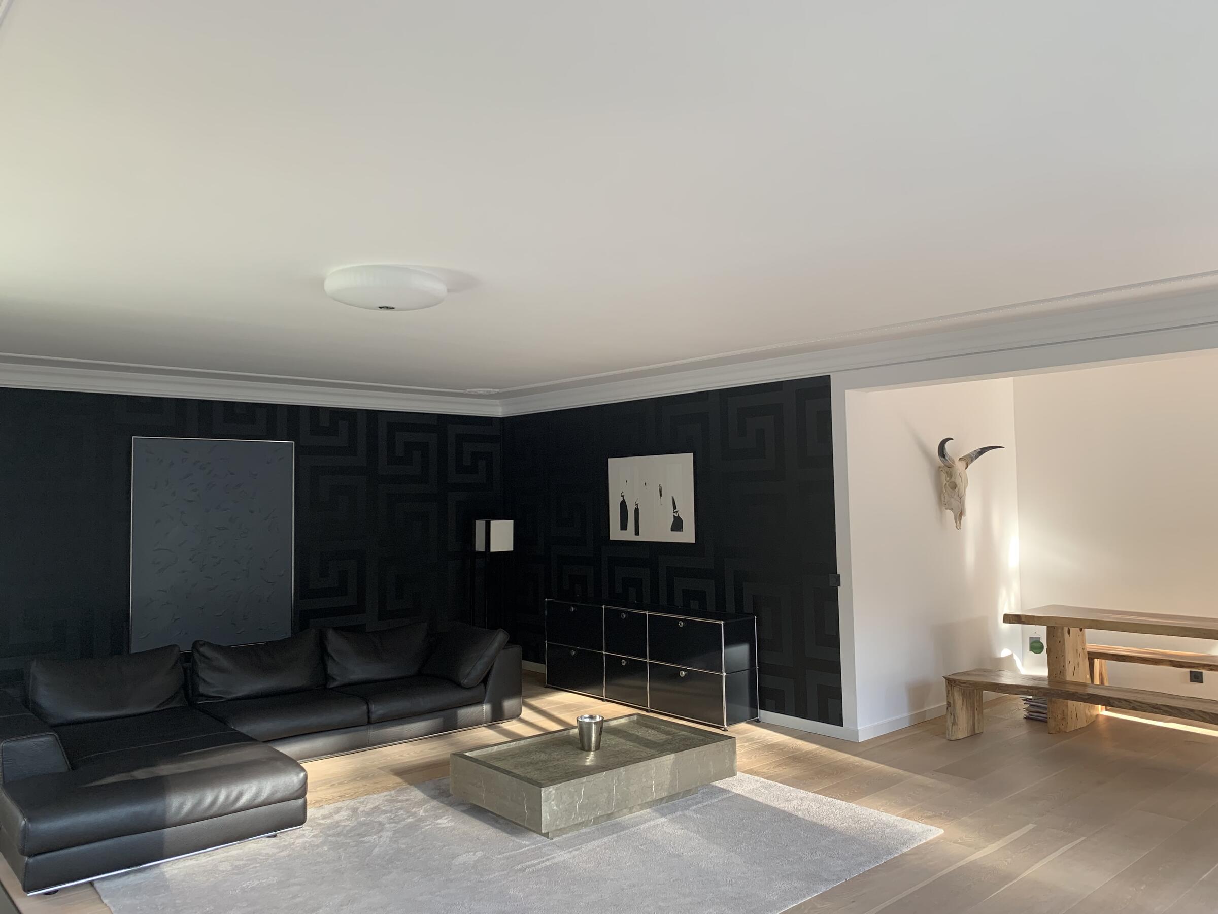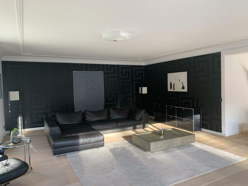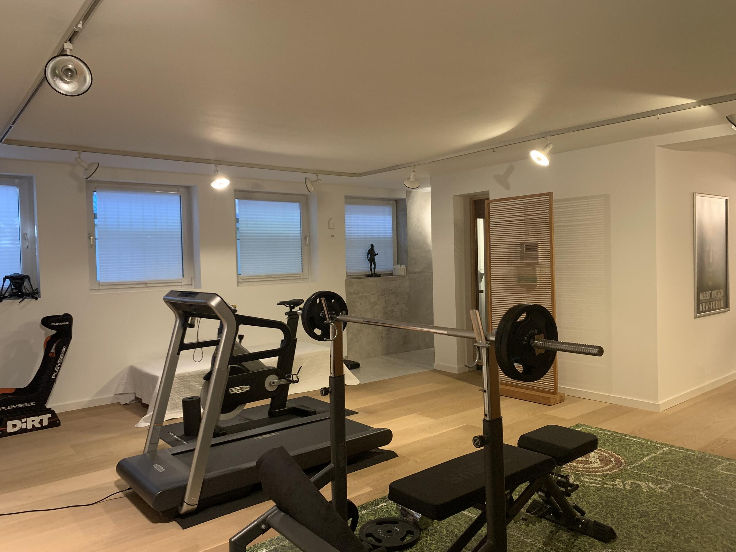Die Villa befindet sich in Ratingen Hösel, in unmittelbarer Nähe zum Autobahnanschluss in Richtung Düsseldorf und Essen. 350 m² Wohnfläche erstrecken sich auf drei Ebenen, die durchgängig mit hellen Eichendielen verlegt sind. In den vier Bädern befinden sich raumhohe, großformatige Fliesen. Erdige Töne sowie eine klare schwarz- weiß Farbgebung in Kombination mit modernem Design bestimmen den Stil des Hauses und geben ihm Wohlfühlcharakter. Ein großer Fitnessbereich inklusive Sauna, Dusche und WC im Untergeschoss sind von außen zugängig und können neben zwei weiteren Räumen als Maske und Garderobe genutzt werden.