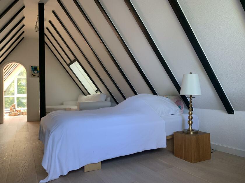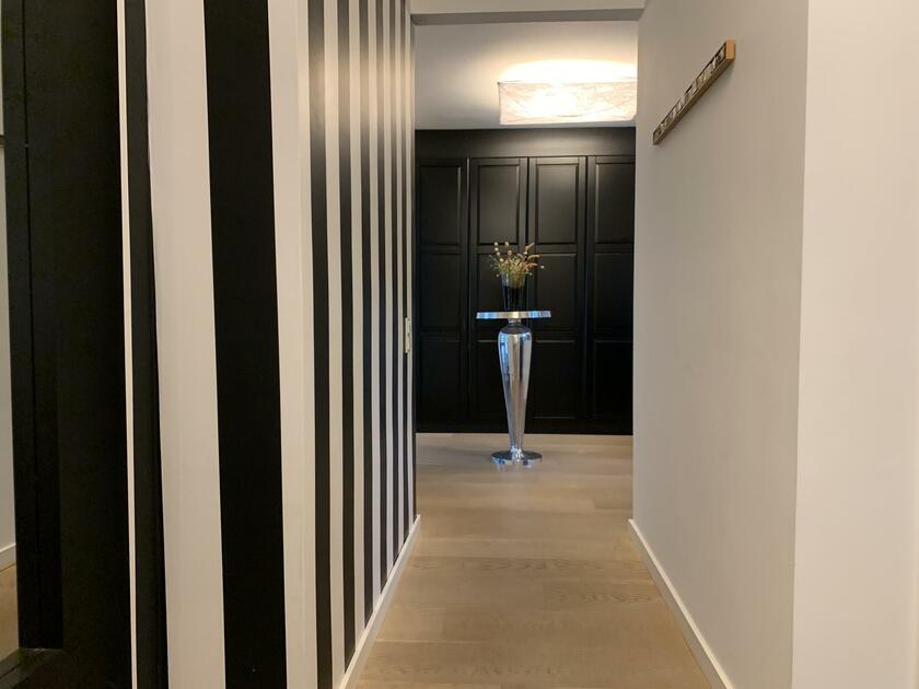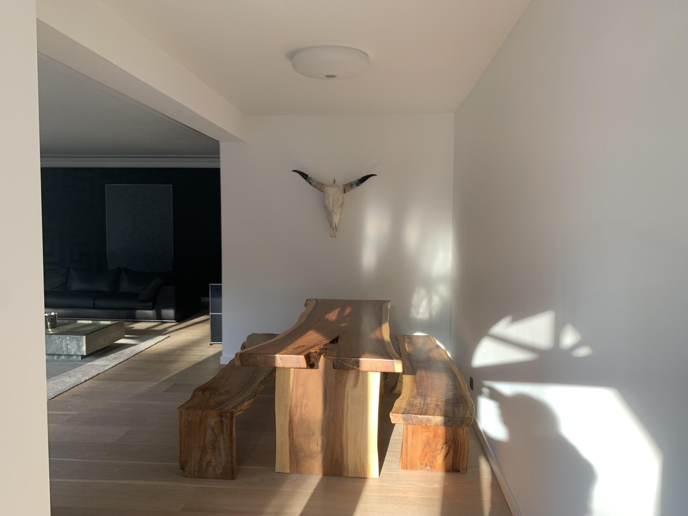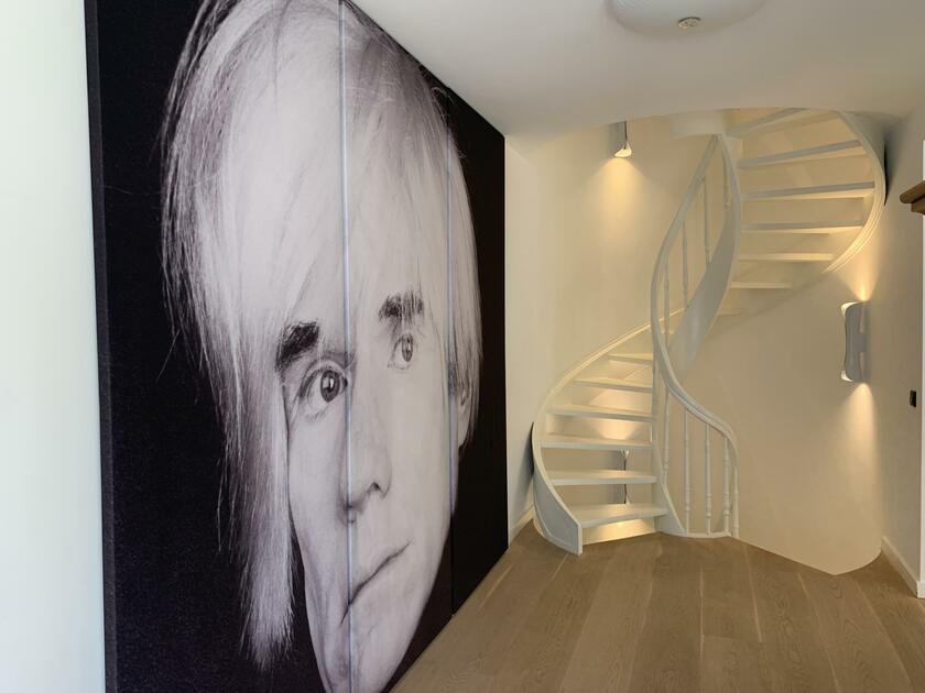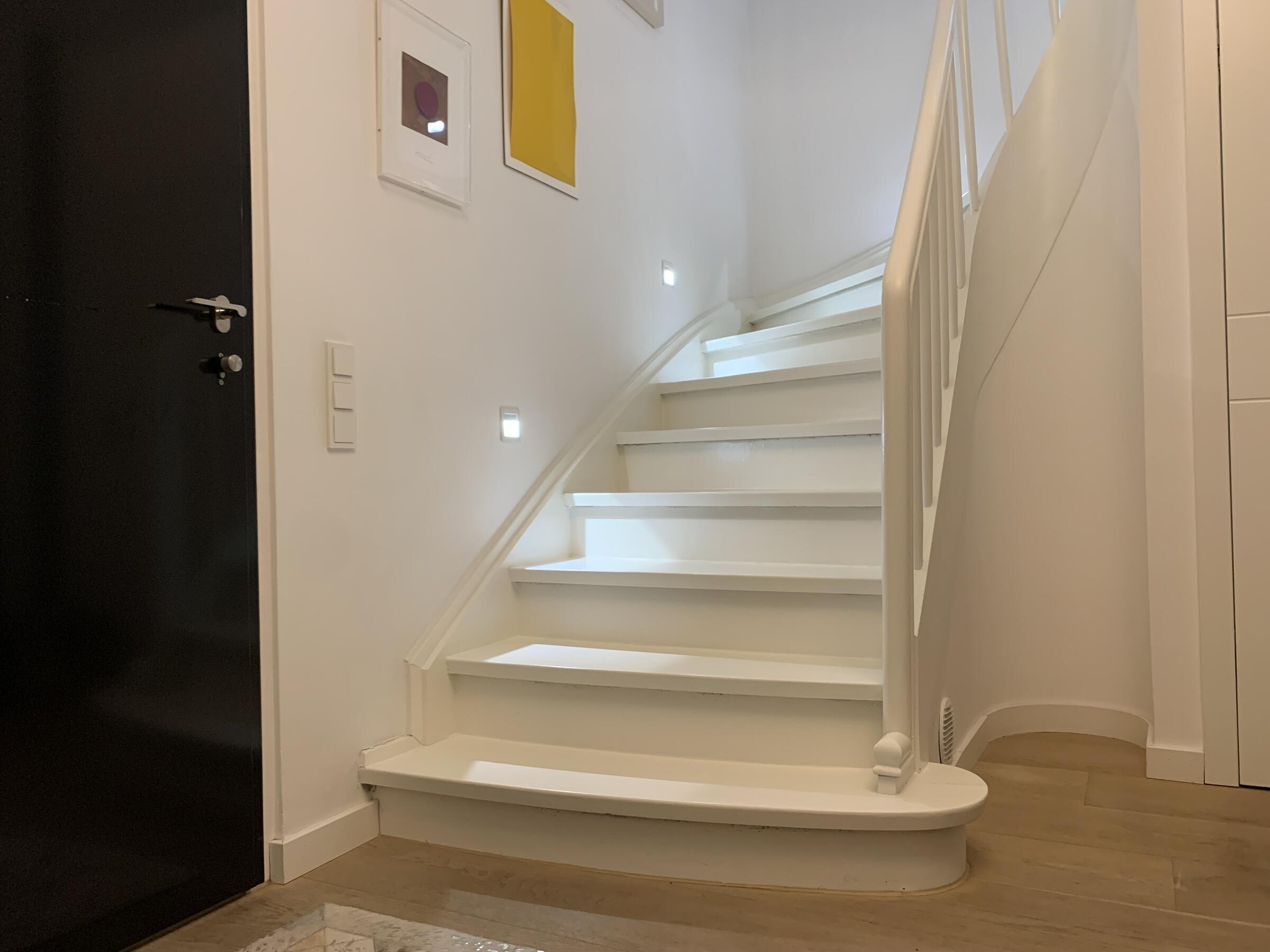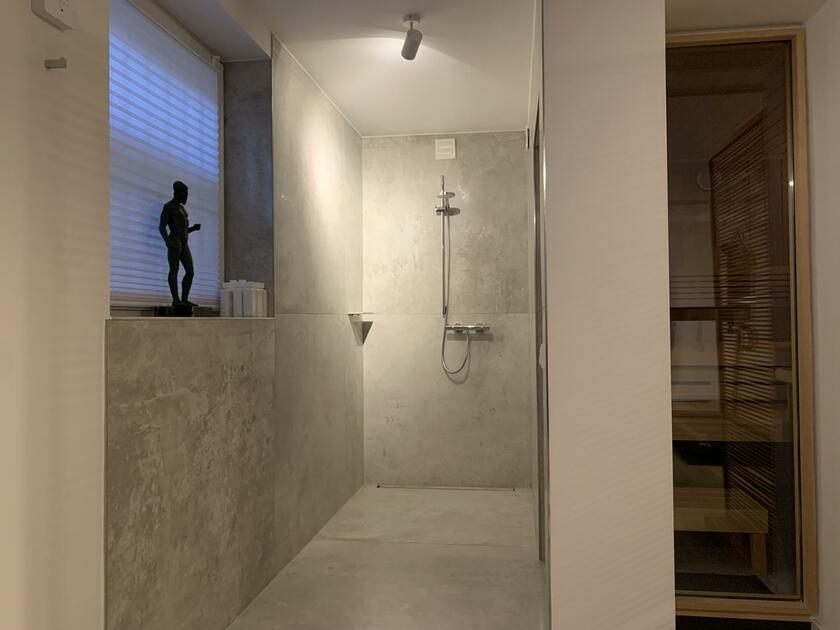 Die Villa befindet sich in Ratingen Hösel, in unmittelbarer Nähe zum Autobahnanschluss in Richtung Düsseldorf und Essen. 350 m² Wohnfläche erstrecken sich auf drei Ebenen, die durchgängig mit hellen Eichendielen verlegt sind. In den vier Bädern befinden sich raumhohe, großformatige Fliesen. Erdige Töne sowie eine klare schwarz- weiß Farbgebung in Kombination mit modernem Design bestimmen den Stil des Hauses und geben ihm Wohlfühlcharakter. Ein großer Fitnessbereich inklusive Sauna, Dusche und WC im Untergeschoss sind von außen zugängig und können neben zwei weiteren Räumen als Maske und Garderobe genutzt werden.