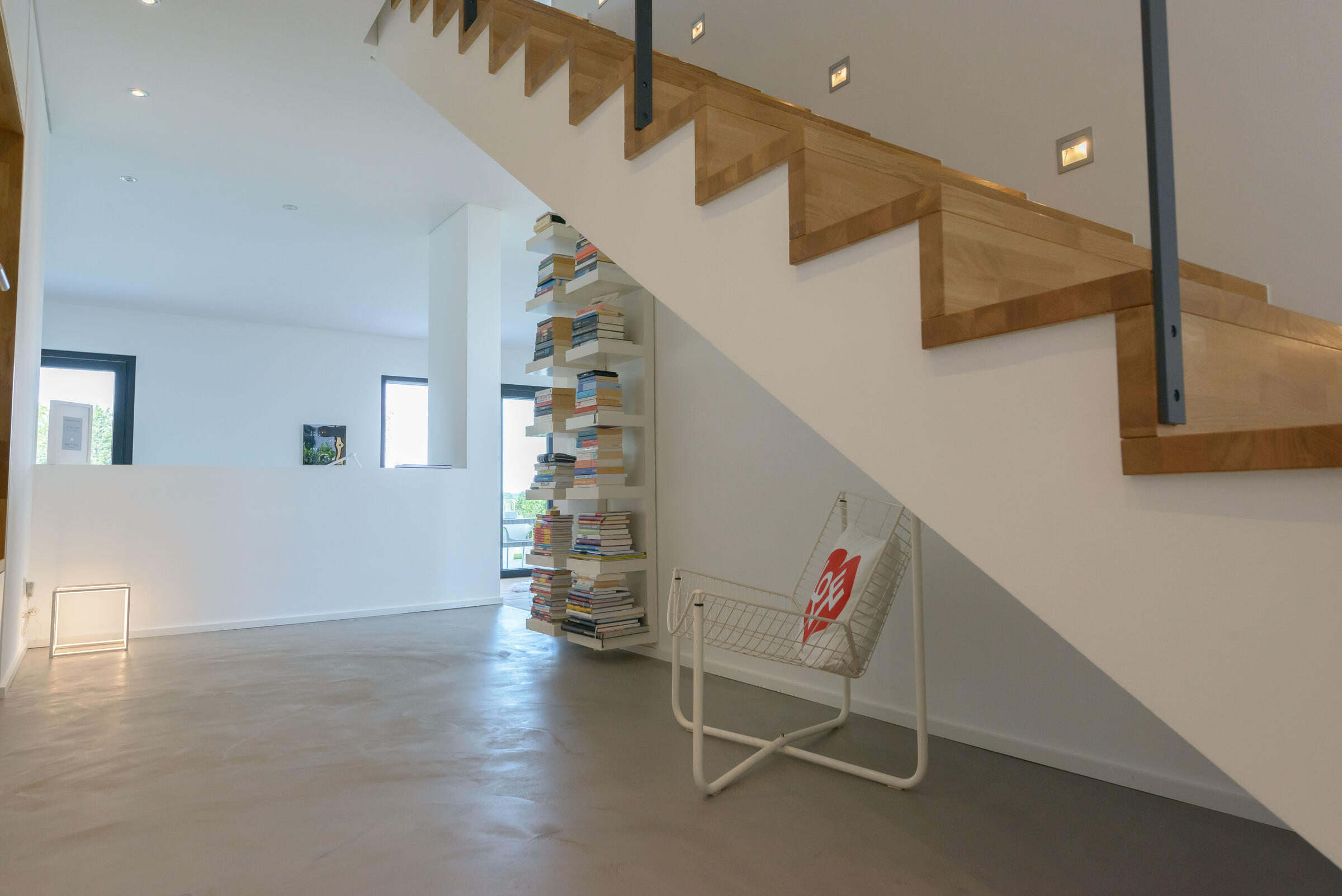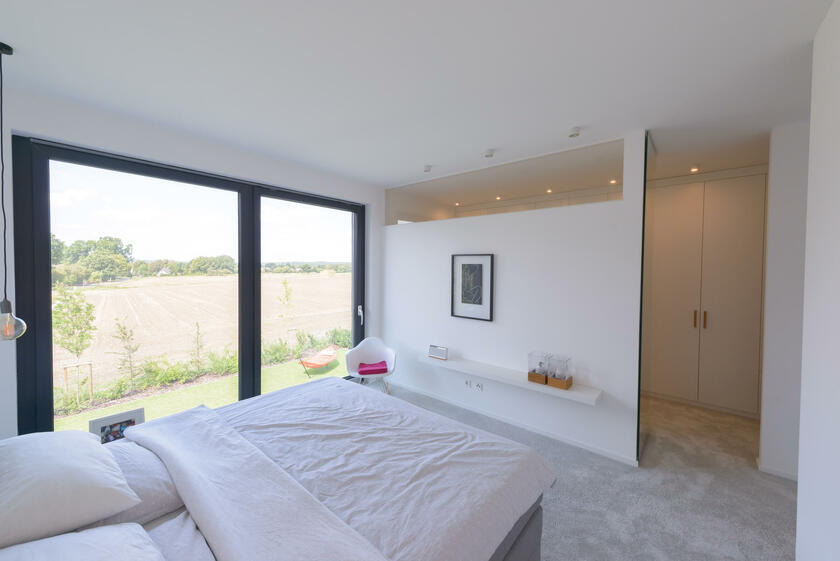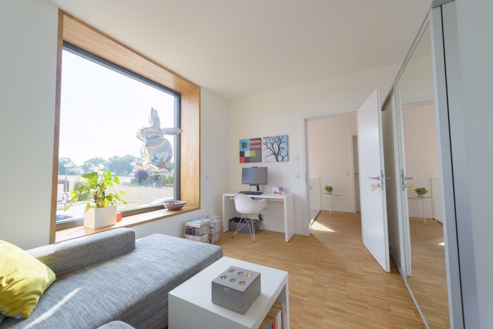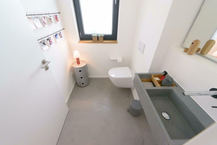 Das charakterstarke, großzügige und moderne Einfamilienhaus im Bauhausdesign mit Lage im Ruhrgebiet zeichnet sich durch einen gehobenen und modernen Bau- und Einrichtungsstil aus. Die Wände der lichtdurchfluteten Räume sind weiß und glatt verputzt. Die Oberböden sind mit Spachtel-Esstrich und Parkett ausgelegt. Das Erdgeschoss ist von einem großzügigen und offen gestaltetem Wohn- und Essbereich geprägt, der durch einen Luftraum besticht und zudem über einen großen Kamin verfügt. Im 1. Geschoss sowie im Obergeschoss stehen separate Aufenthaltsräume für Team, Maske und Garderobe zur Verfügung. Es befindet sich ein Bad bzw. Gäste-Bad auf jeder Ebene.