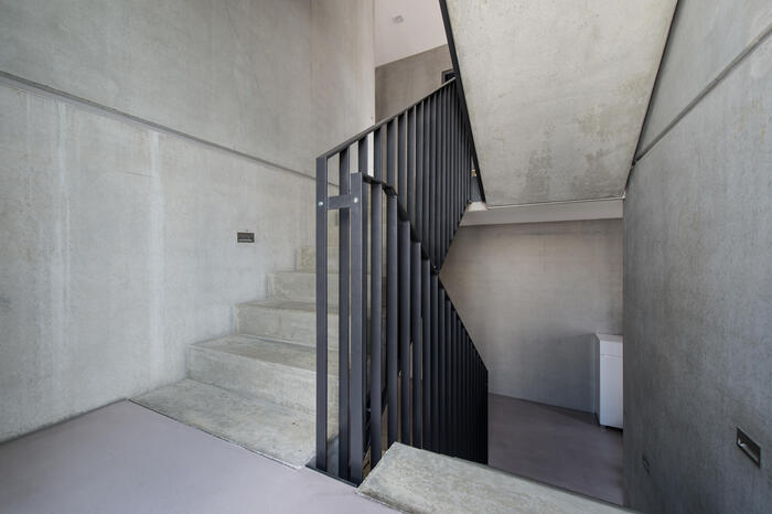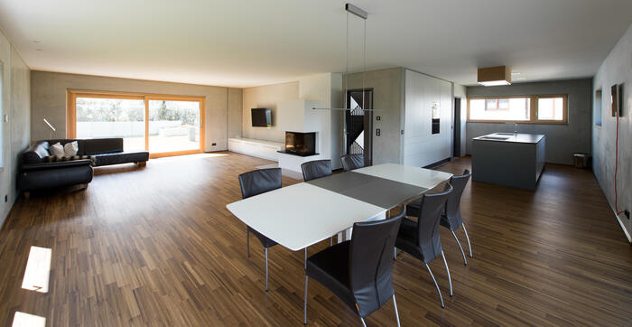 Im Inneren des Wohnhauses überwiegt ein offenes großzügiges Raumkonzept. Große Fenster erhellen die Räume. Die klare Materialwahl wird durch minimalistische Elemente und Einbauten komplettiert.