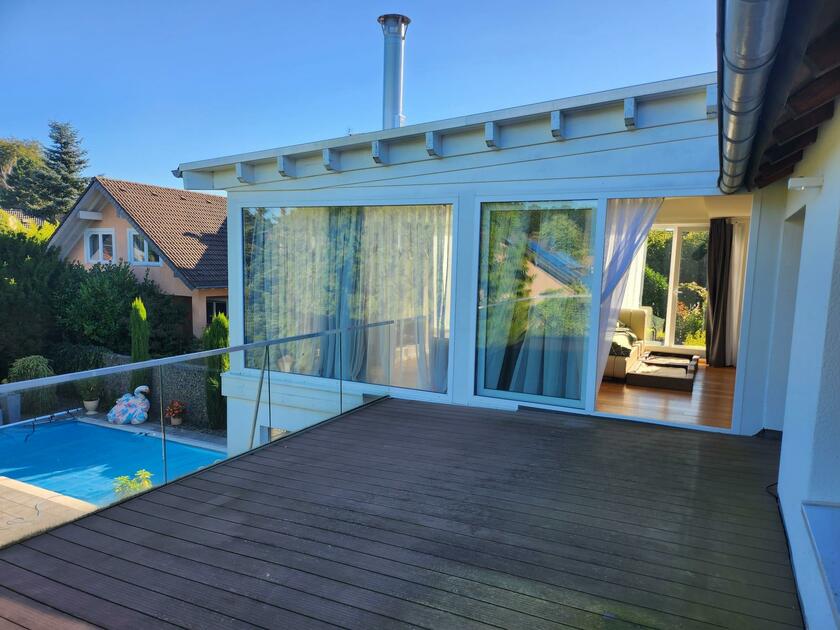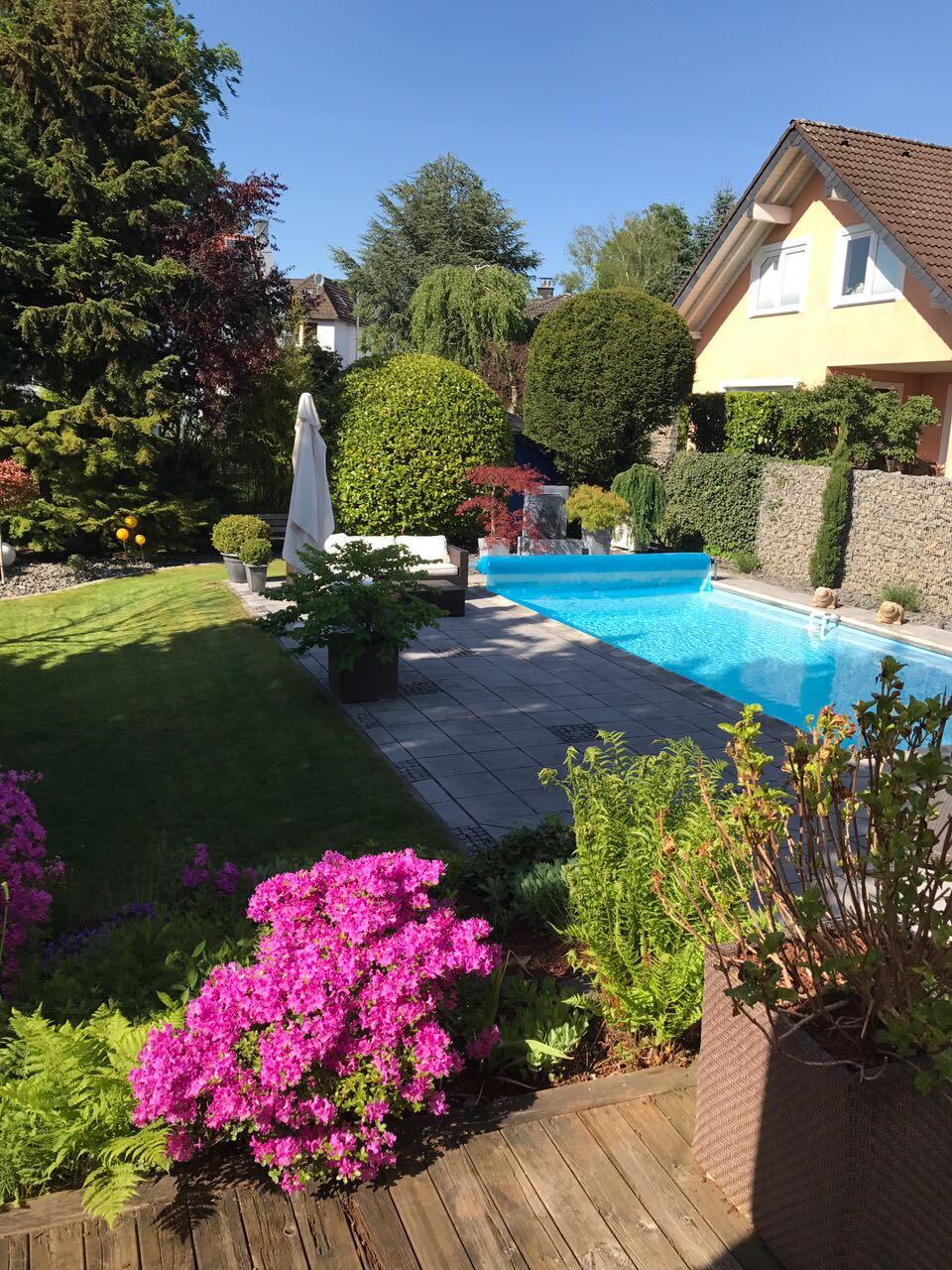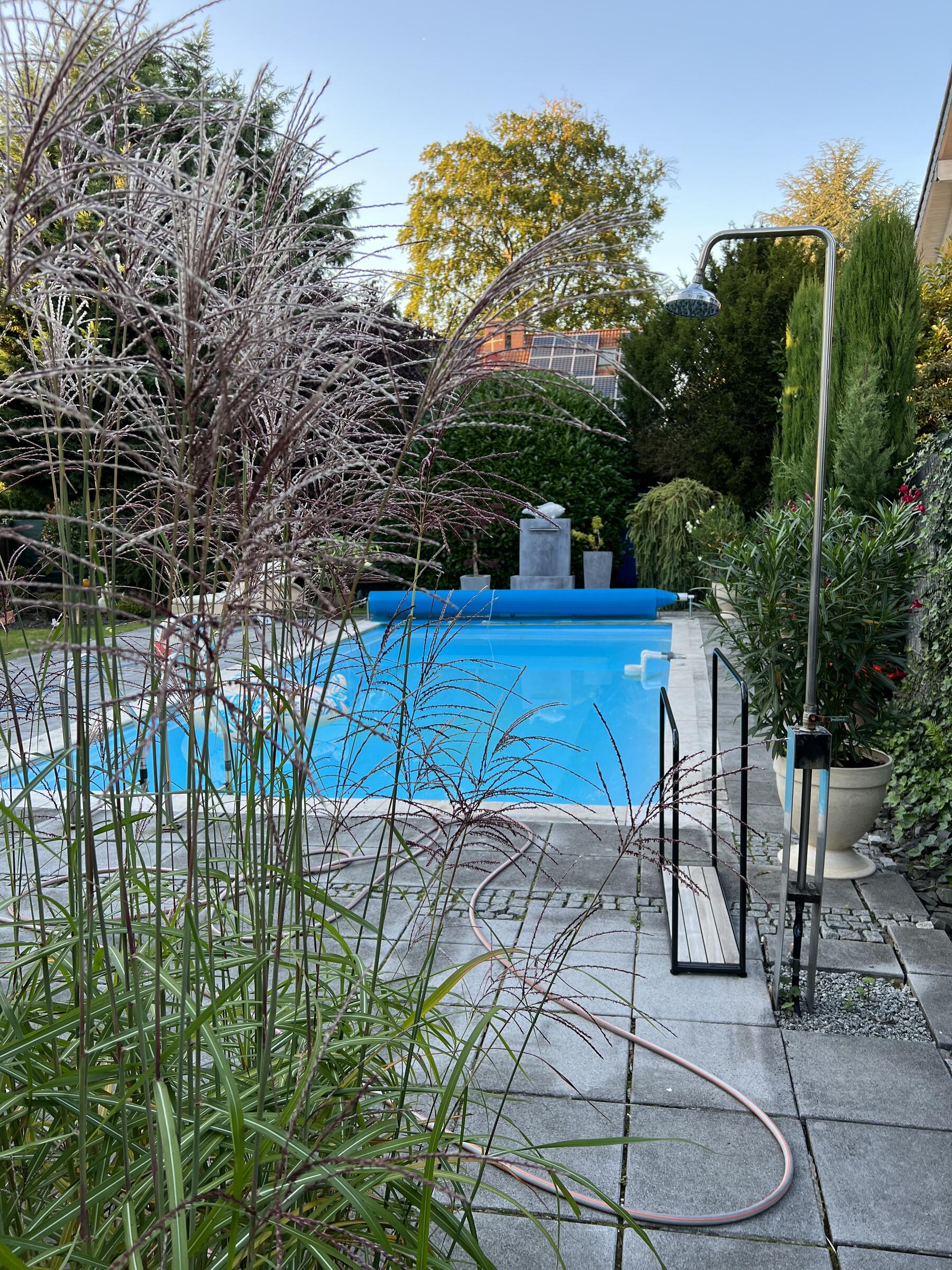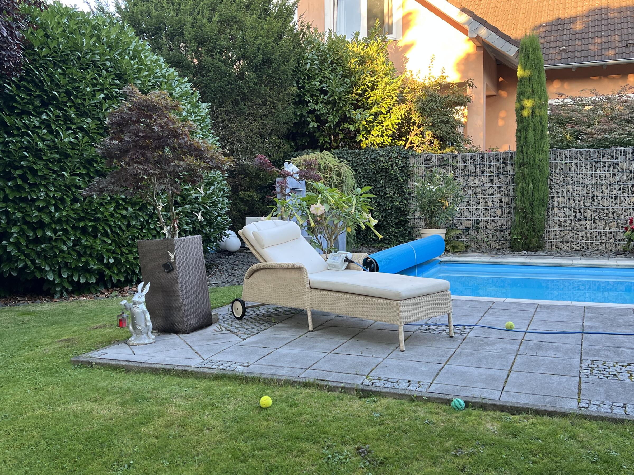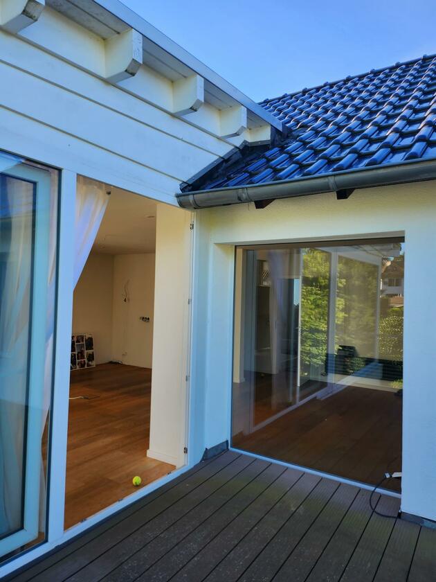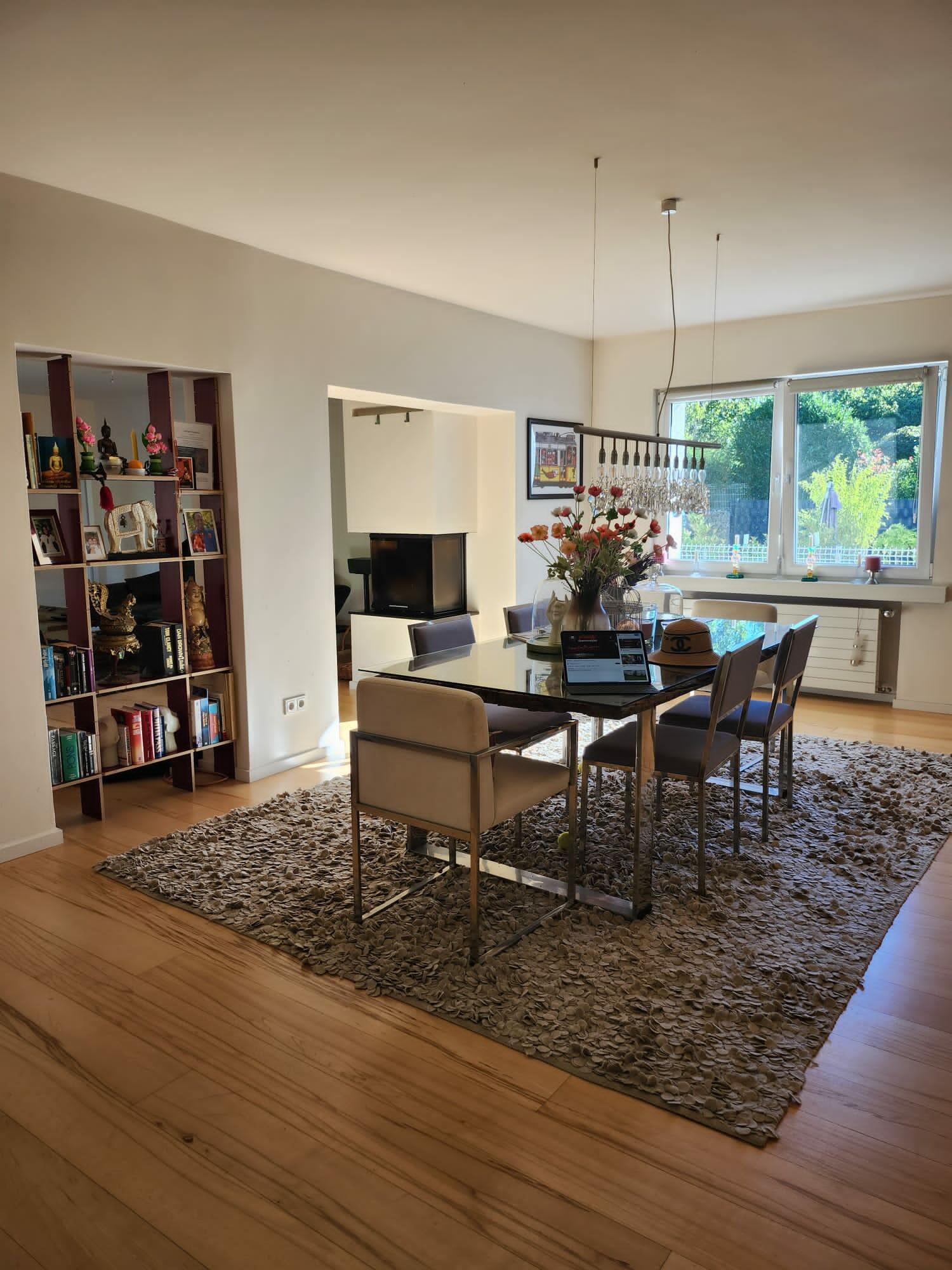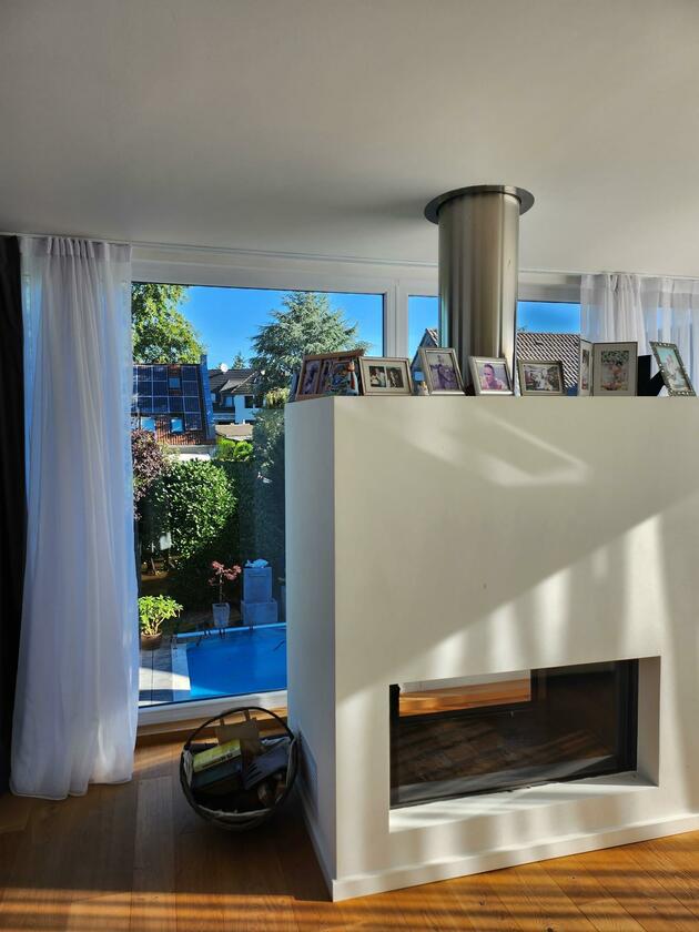 Unser modern ausgestattetes Haus befindet sich in einer ruhigen Wohngegend. Die Räume sind zeitgemäß und funktional eingerichtet. Im Wohnzimmer befindet sich ein offener Tunnelkamin. Die modern ausgestattete Küche verfügt über eine große Kücheninsel. Auf den Böden der Wohnbereiche sind hochwertige Buchenholzdielen verlegt. Die teilweise bodentiefen Fenster können mit Rollläden und Jalousien verdunkelt werden. Im Außenbereich können unsere Terrassen, der Salzwasserpool und der Garten genutzt werden. Auf unserem Grundstück stehen 4 Pkw-Stellplätze zur Verfügung. Weitere Stellflächen gibt es auf der Anliegerstraße.