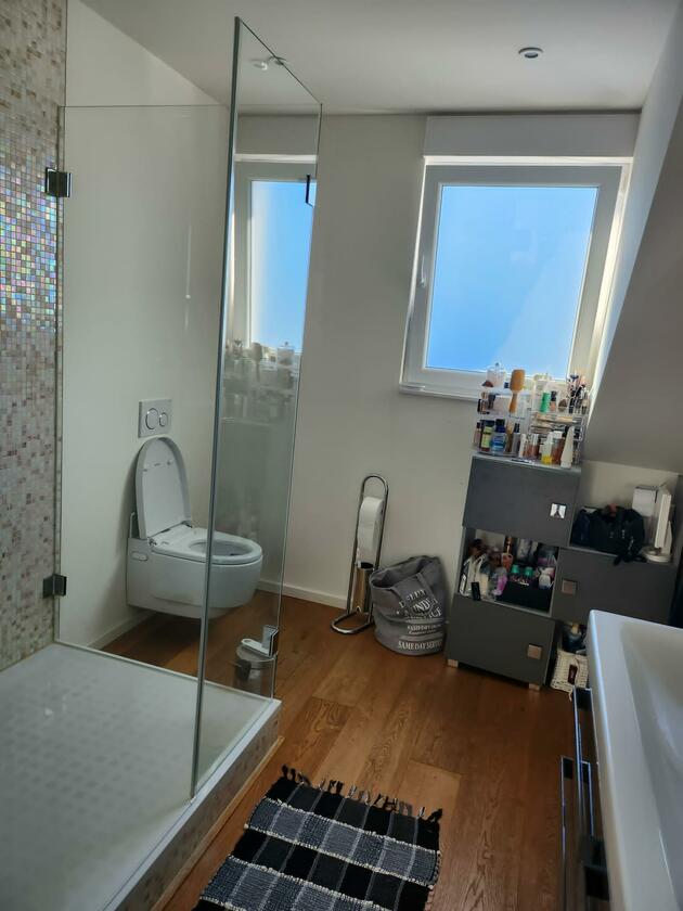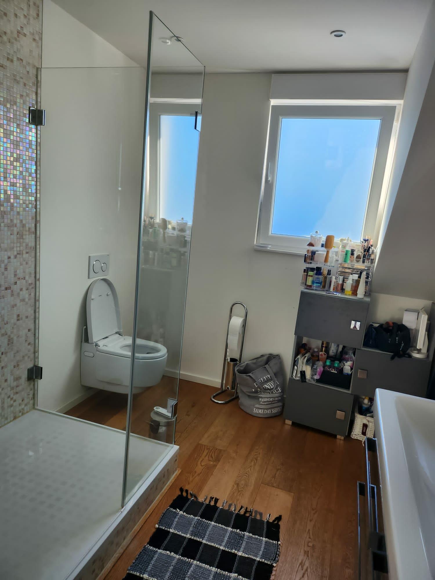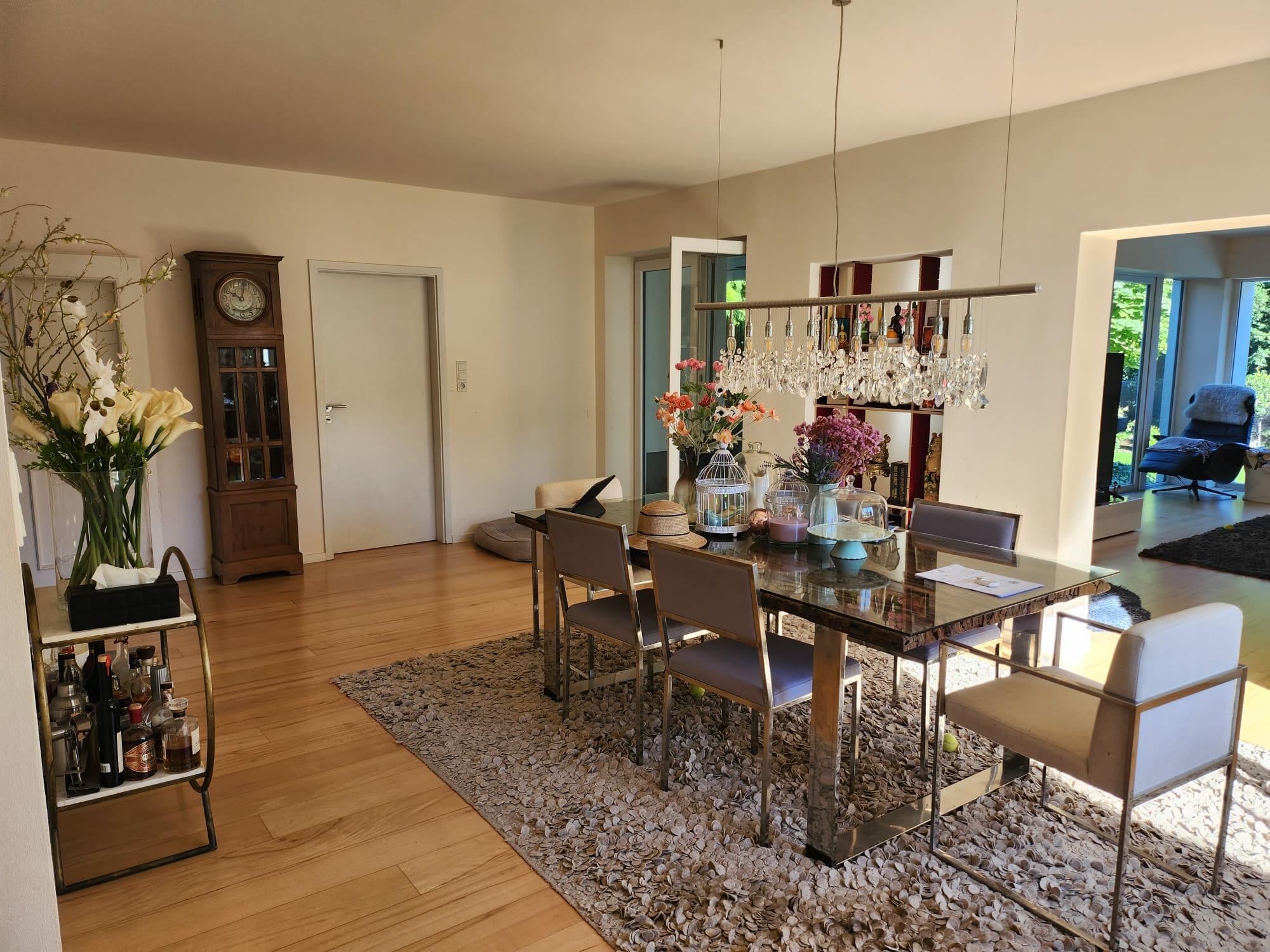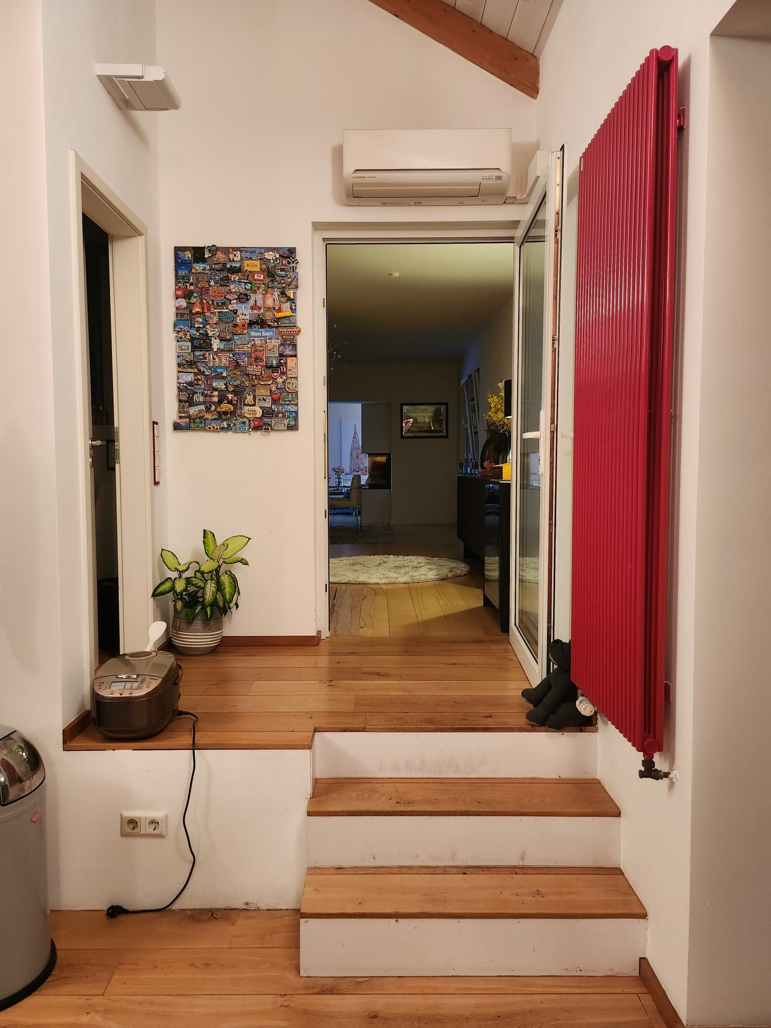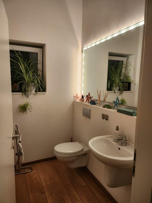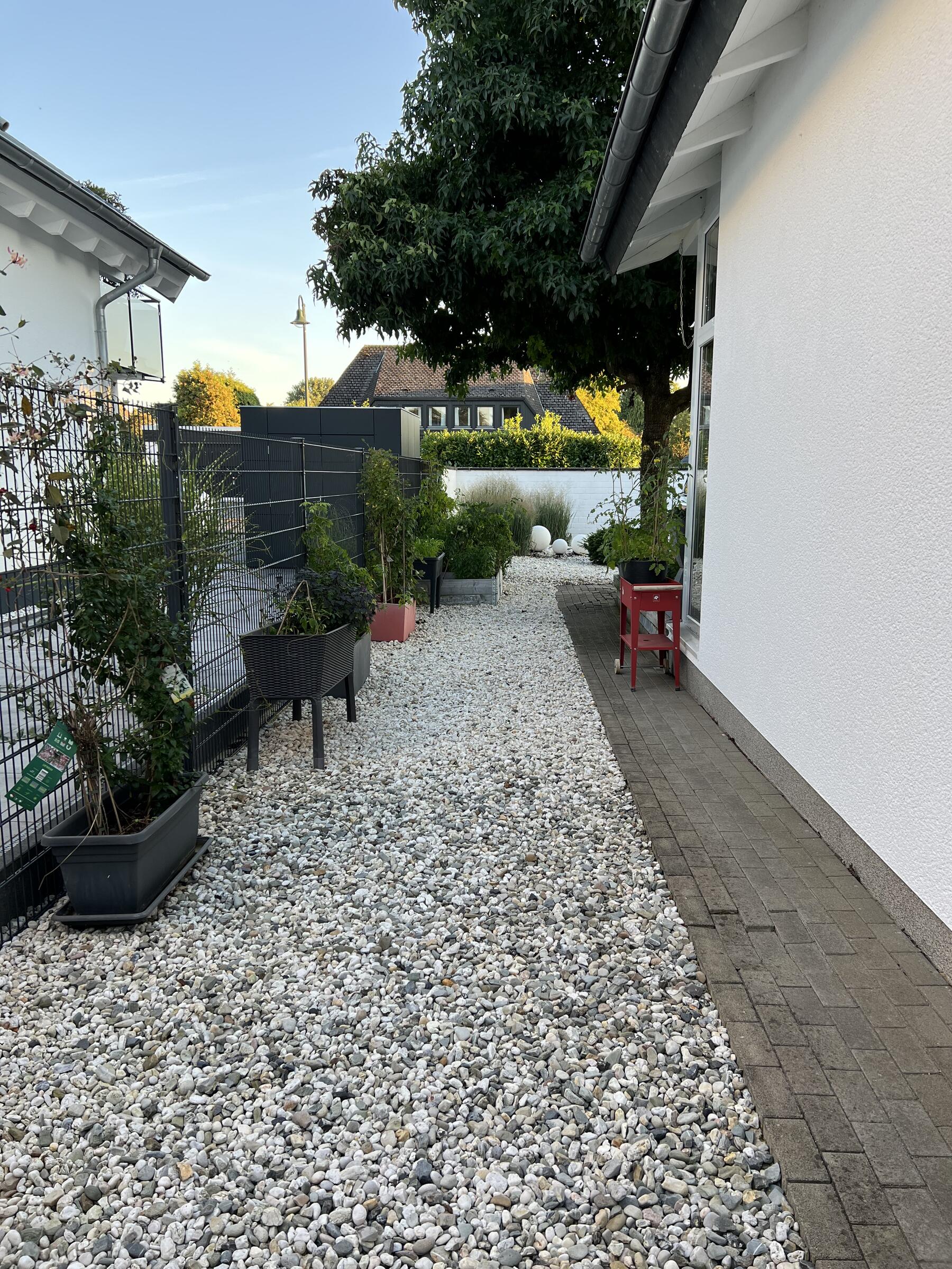 Unser modern ausgestattetes Haus befindet sich in einer ruhigen Wohngegend. Die Räume sind zeitgemäß und funktional eingerichtet. Im Wohnzimmer befindet sich ein offener Tunnelkamin. Die modern ausgestattete Küche verfügt über eine große Kücheninsel. Auf den Böden der Wohnbereiche sind hochwertige Buchenholzdielen verlegt. Die teilweise bodentiefen Fenster können mit Rollläden und Jalousien verdunkelt werden. Im Außenbereich können unsere Terrassen, der Salzwasserpool und der Garten genutzt werden. Auf unserem Grundstück stehen 4 Pkw-Stellplätze zur Verfügung. Weitere Stellflächen gibt es auf der Anliegerstraße.