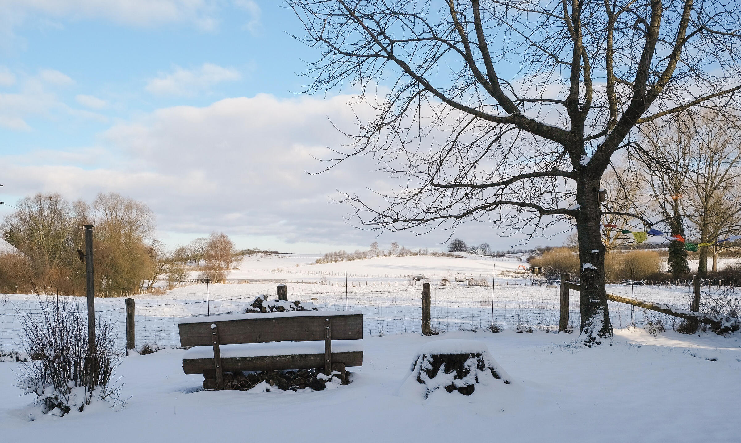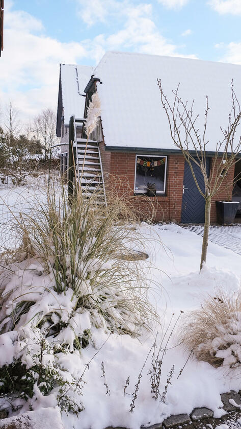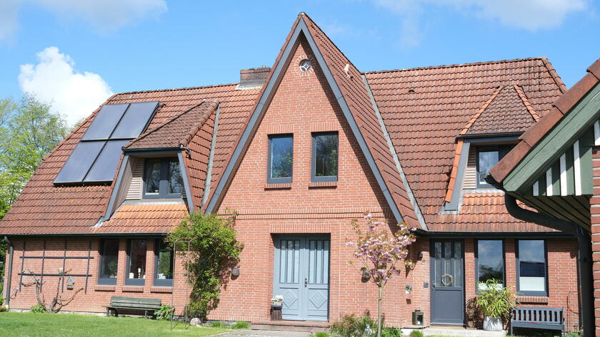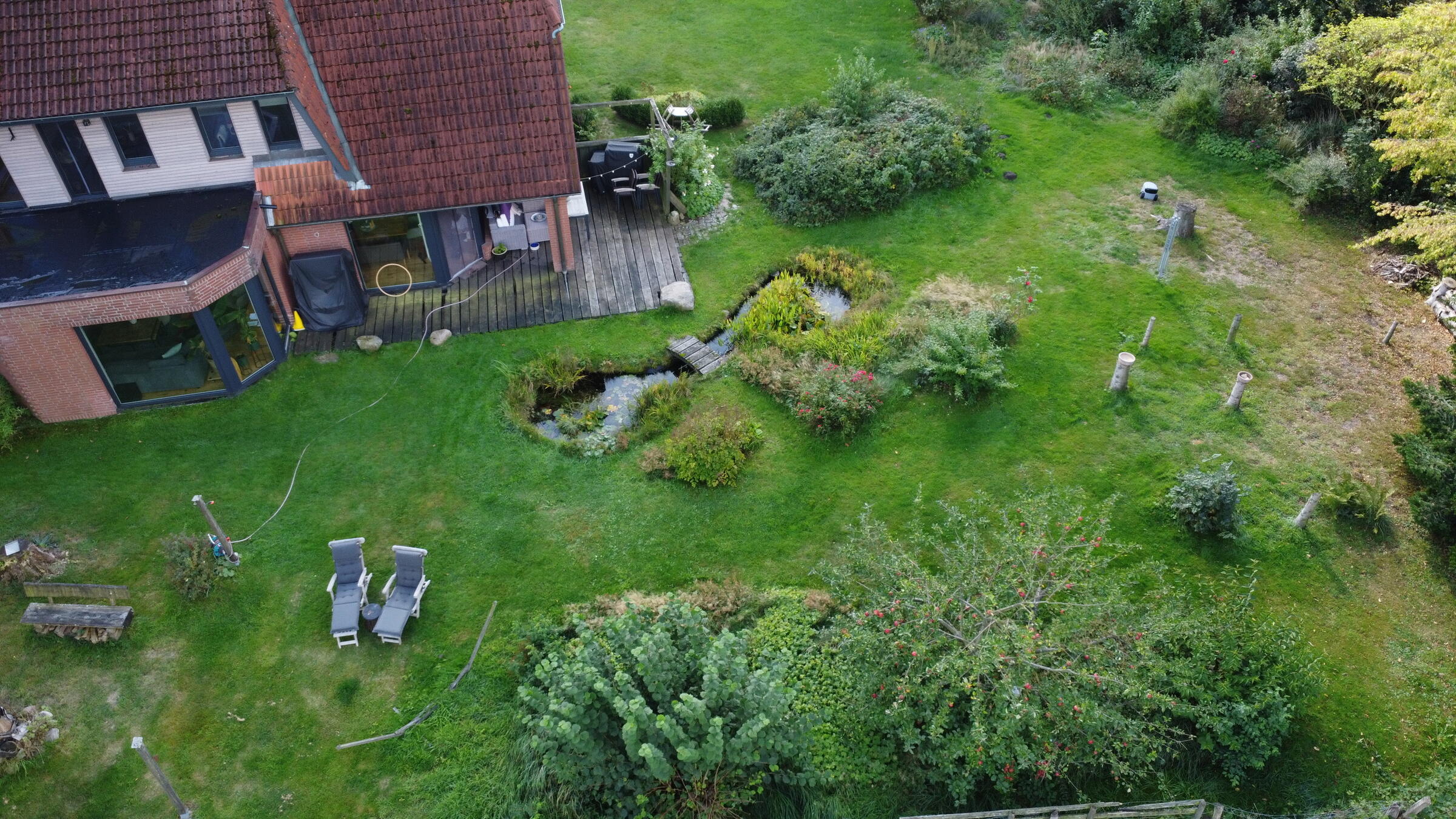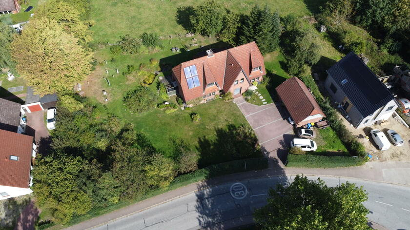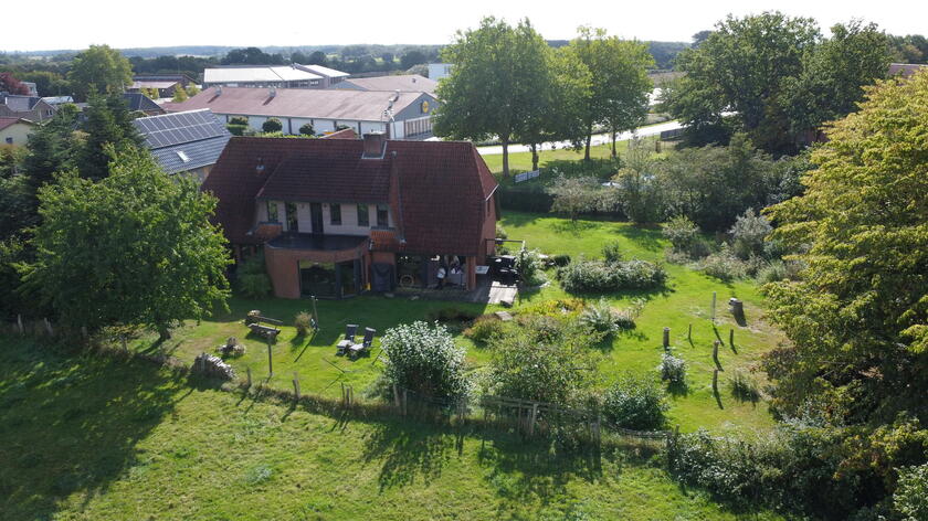 Das knapp 2.000 m² große Grundstück bietet rund um das Haus viel Platz und hält einen großen, gepflasterten Hof mit Parkmöglichkeiten für die verschiedensten Fahrzeuge bereit. Ein Garagenhaus mit zwei Parkplätzen und ein kleiner Teich befinden sich ebenfalls auf dem Grundstück.