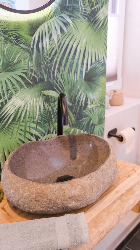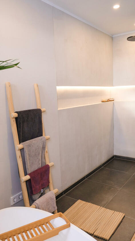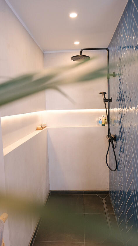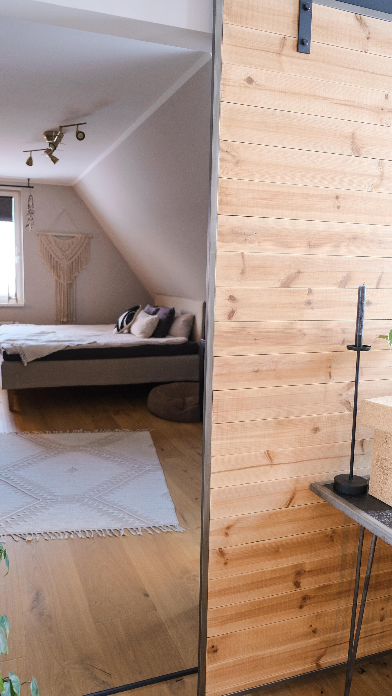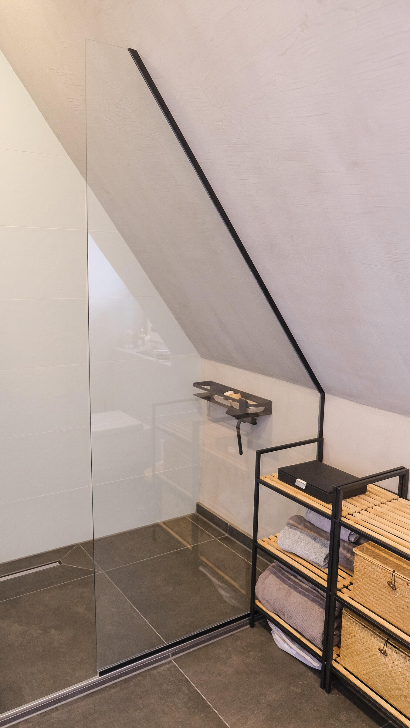 Der Westflügel auf der linken Seite besitzt ein Badezimmer mit begehbarer Dusche, ein großes Gästezimmer und ein Schlafzimmer, die durch eine Schiebetüre aus Holz getrennt sind.