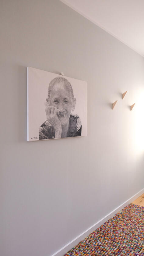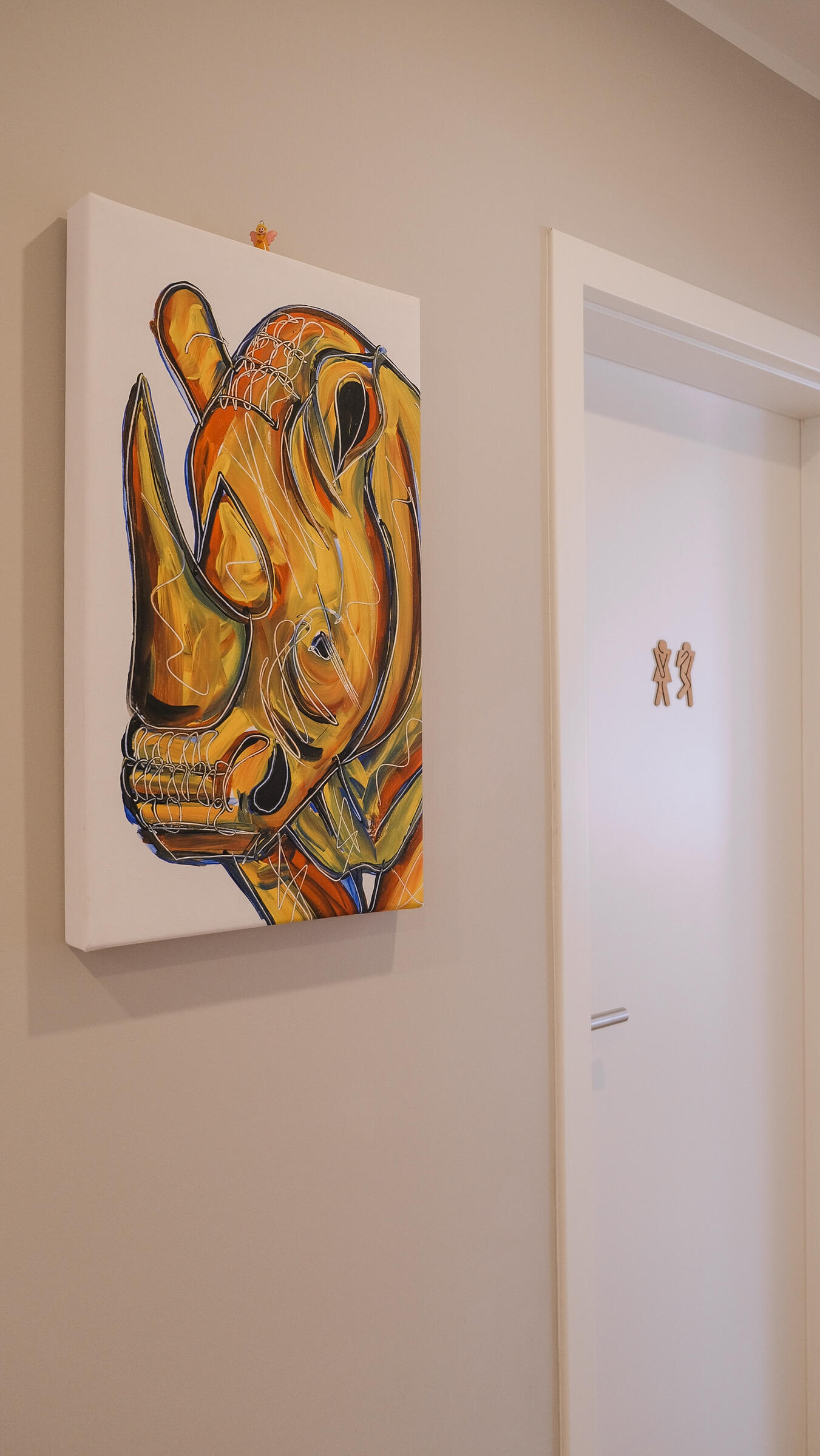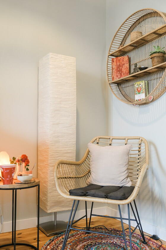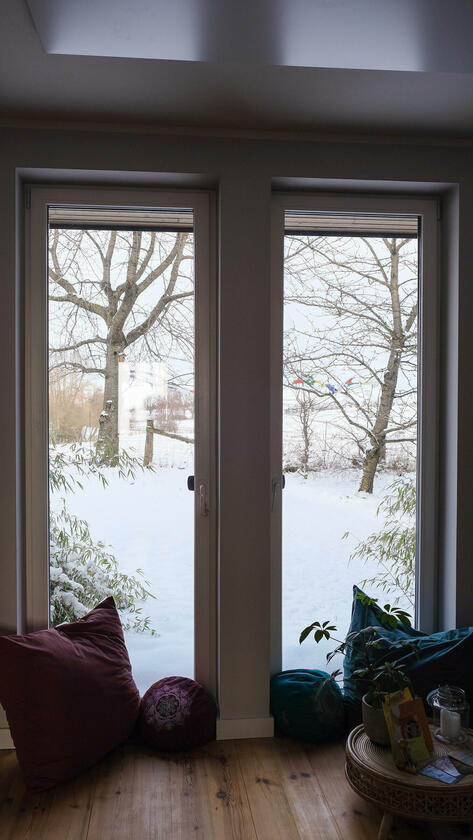 Die 40 m² große Ayurvedische Praxis befindet sich im Ostflügel des Hauses und kann durch einen separaten Eingang oder eine Verbindungstüre im Wohnzimmer betreten werden. Die Praxisräume bestehen aus einem Gruppenraum zum Garten, einem kleinen Massageraum, einem Vorflur mit schwarzer Lofttür und einem kleinen Bad mit Dusche.